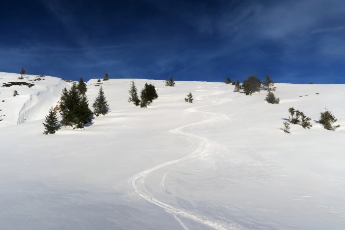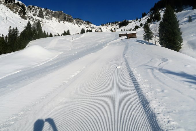 Durch den Föneinfluss beste Fernsicht. Morgens um 10 am Suneggparkplatz 3 Grad. Durch die relativ kalte Nacht hat sich die Erwärmung noch nicht negativ auf die Schneequalität ausgewirkt. Die Pisten waren teilweise frisch präpariert, außerhalb der Piste unterschiedliche Schneeverhältnisse. Die steilen Südhänge waren fast schon wie im Frühjahr und gut fahrbar.