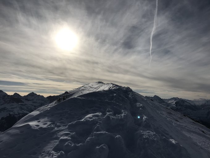 Oben stark verblasen, Mittelteil ganz gut, Talabfahrt Schnee faul/letzte 100hm zu Fuss (Steine). Trotz teilweise starkem Wind recht warm.