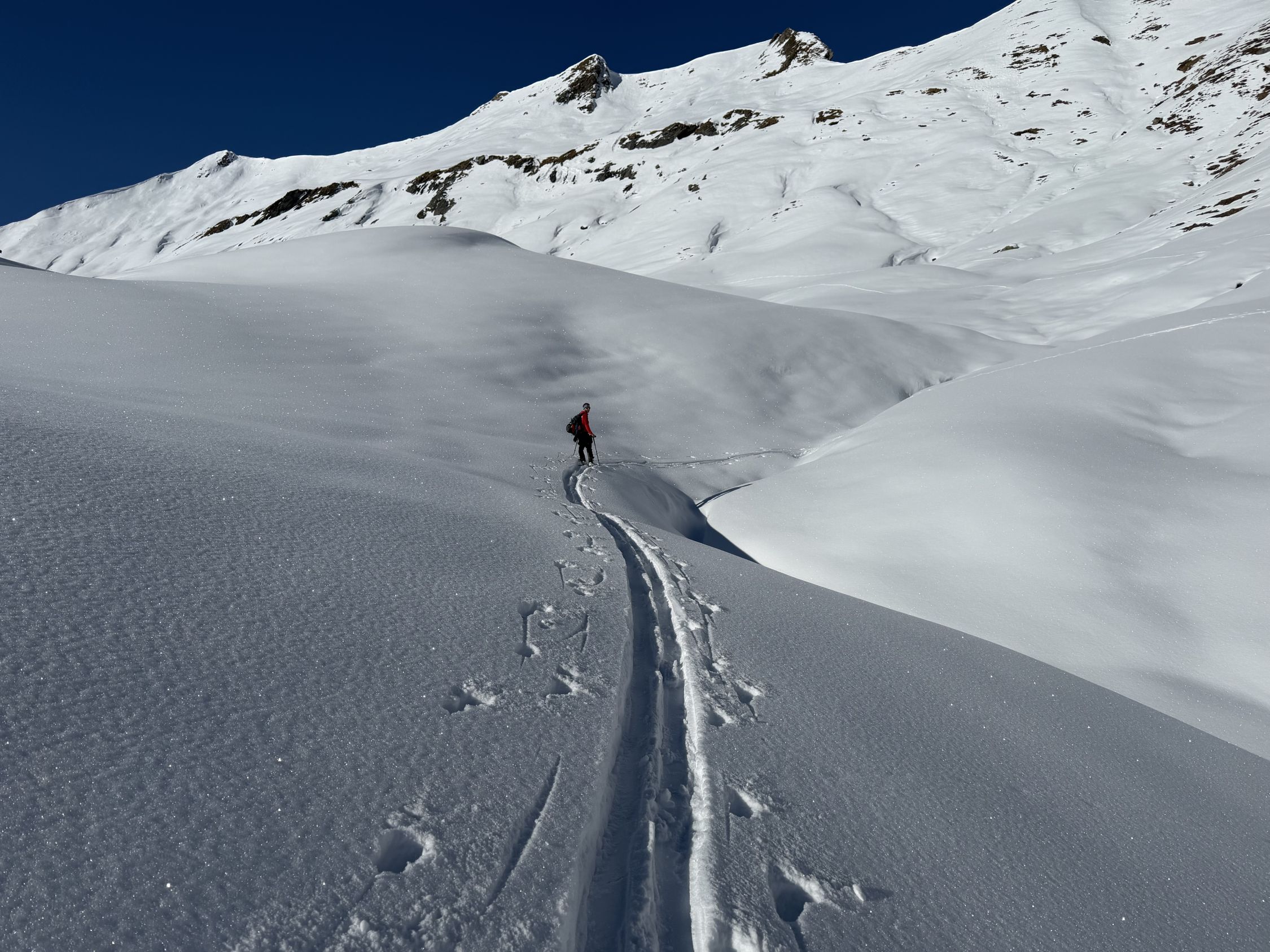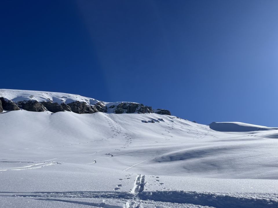 In der Abfahrt hervorragender Pulver ins Chrauchtal. Dadurch durchgehend Schnee bis Matt.
