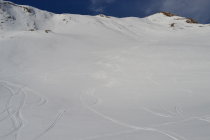 Sehr windig und warm. Schnee unten nass, oberhalb Chumli windbearbeitet, meist tragend, aber nicht ganz immer. Genug Schnee zum Schifahren, aber Augen offen halten. Morgen wird es schwieriger, wenn der Neuschnee die vorstehenden Steine zudeckt.