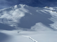 Der steile Nordosthang des Girenspitz wies bereits zwei perfekte Abfahrtsspuren von gestern oder vorgestern auf, ich habe heute eine dritte Girlande beigefügt (Powderalarm!) Bis zur Alp Garschina dann auch noch beste Schneeverhältnisse, weiter unten war der Schnee dann nur noch suboptimal, z. T. aufgeweicht, z. T. mit einem feinen Deckel versehen. Man konnte aber bis zum Parkplatz auf Ski abfahren. Alles in allem bereits erstaunlich gute Tourenverhältnisse im Rätikon - und morgen soll ja noch eine Ladung Schnee dazukommen.