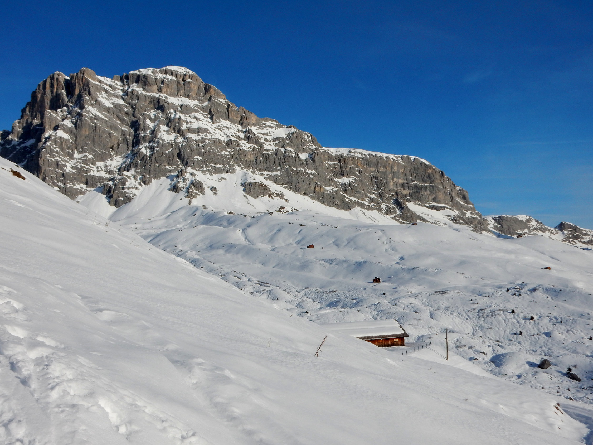 Immer wieder beeindruckend das alpine Ambiente mit Sulzfluh, Drusentürmen und Schijenflue. Fast alleine unterwegs heute. Ein Skitourengänger war noch unterwegs zum Gipfel.