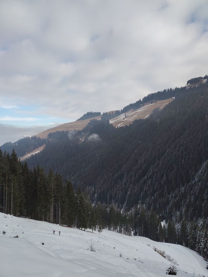 Unten raus dann im Wald einige Male zu dünn zum abfahren, die freien Hänge bei der Sonnwendalm sind nicht möglich.