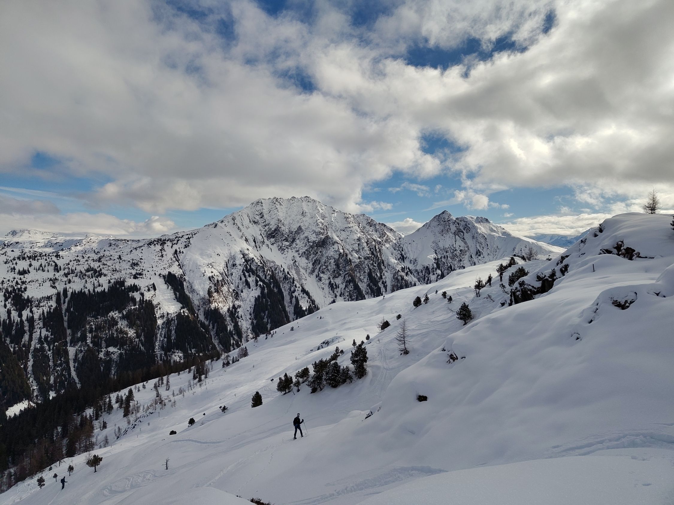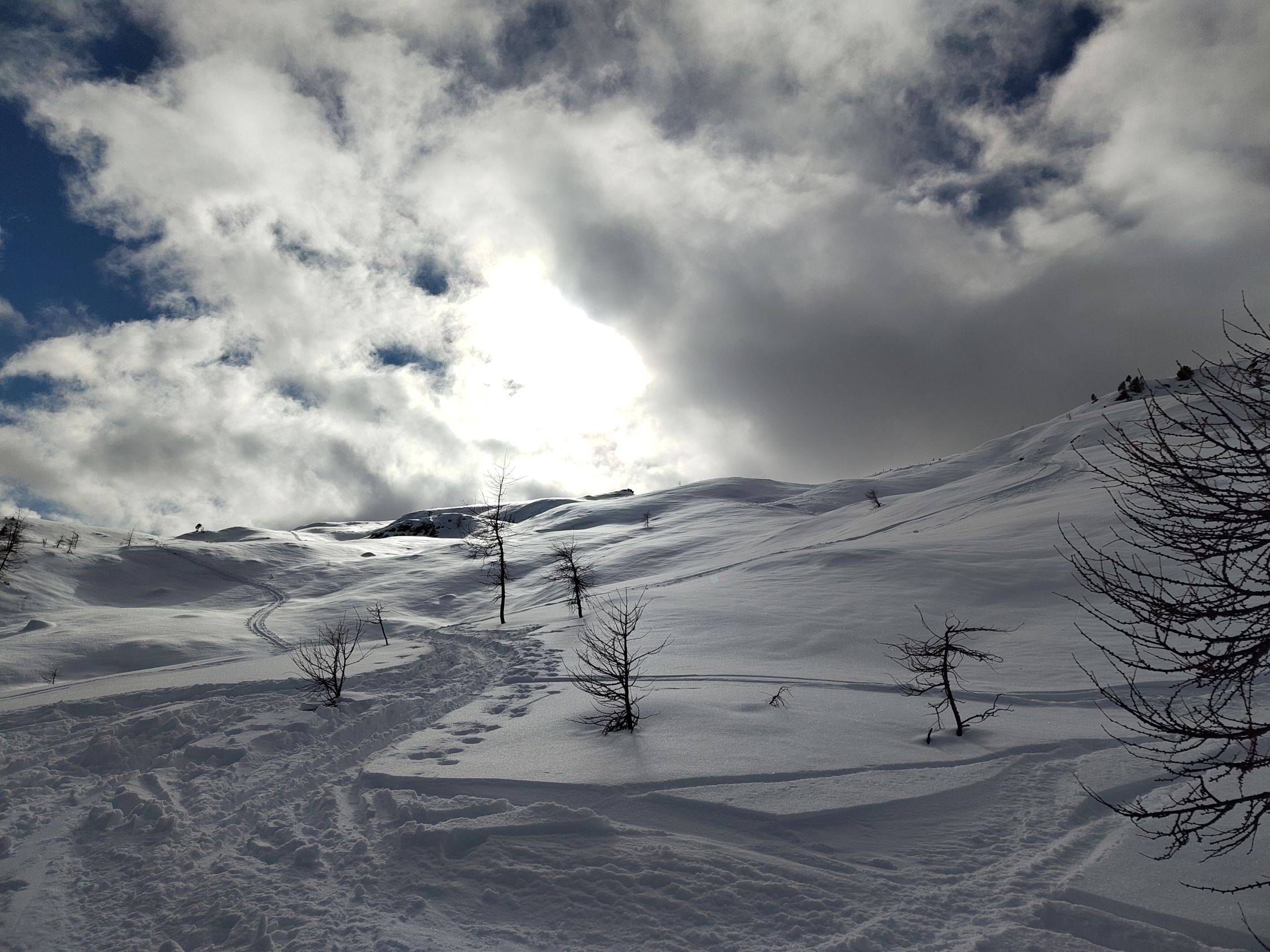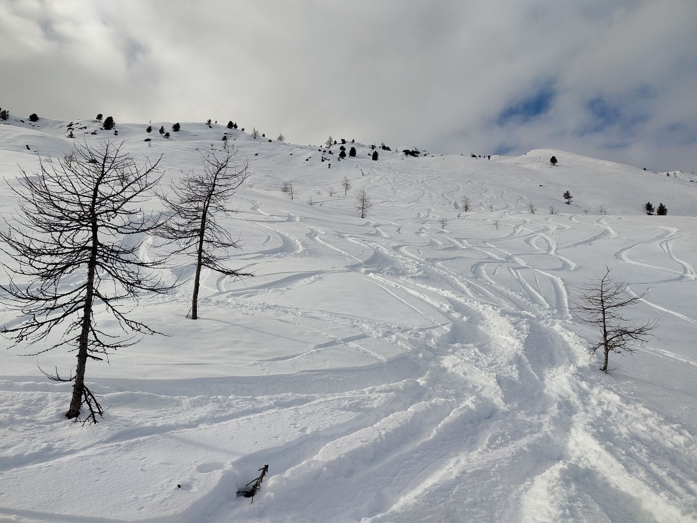 Wir sind dann nochmals Richtung Süden ziehend aufgestiegen, den Kamm entlang und irgendwo zwischen P 1867 und P 1944 nach rechts (Westen) ins Schöntal abgefahren, hier etwas gepresster Pulver, letztlich aber zu wenig. Das war zwar Ski-, aber nicht vegetationsschonend.
