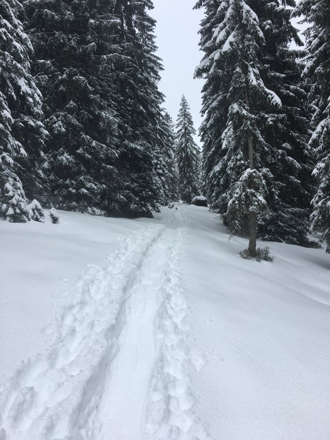 kühl (am Start -1°C); wenig windig, teilweise Schneefall; teilweise bedeckt. Neuschneemenge etwa 30 cm. Ab Richtershüttli in der Abfahrt Steinkontakte.