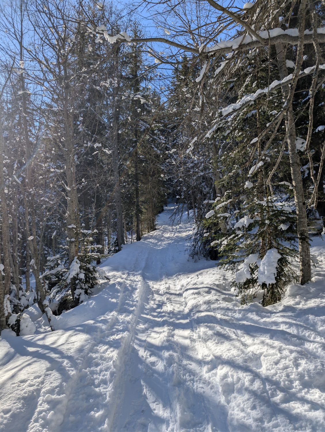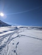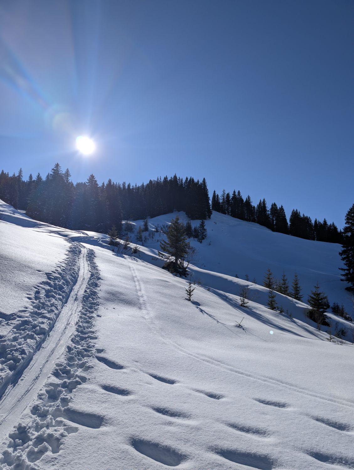 Bei der Ankunft des Skilifts lagen 5–10 cm Pulver auf insgesamt etwa 50 cm Schnee. Die Route war bis Chrine gut gespurt. Es gab allgemein ausreichende Schneeverhältnisse. Im Wald sorgten Sonnenstrahlen zwischen den Bäumen für eine eindrückliche Stimmung. Ab Chrine wählten wir eine Variante westlich der Normalroute über einen offenen Hang und weiter über einen Grat zu Punkt 1791. Anschliessend folgten wir wieder der Normalroute in Richtung Hinderi Wispile. Die Spur war weiterhin gut. Im Gegensatz zum exponierten Gipfel des Walliser Wispile bieten die Alphütten beim Hinderi Wispile einen trockenen, sonnigen und gut windgeschützten Rastplatz, der sich ideal für die Mittagspause eignet. Der kurze Schlussaufstieg zum Gipfel erfolgte über den Nordgrat, wo überwiegend windgepresster Schnee vorlag.