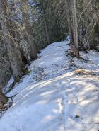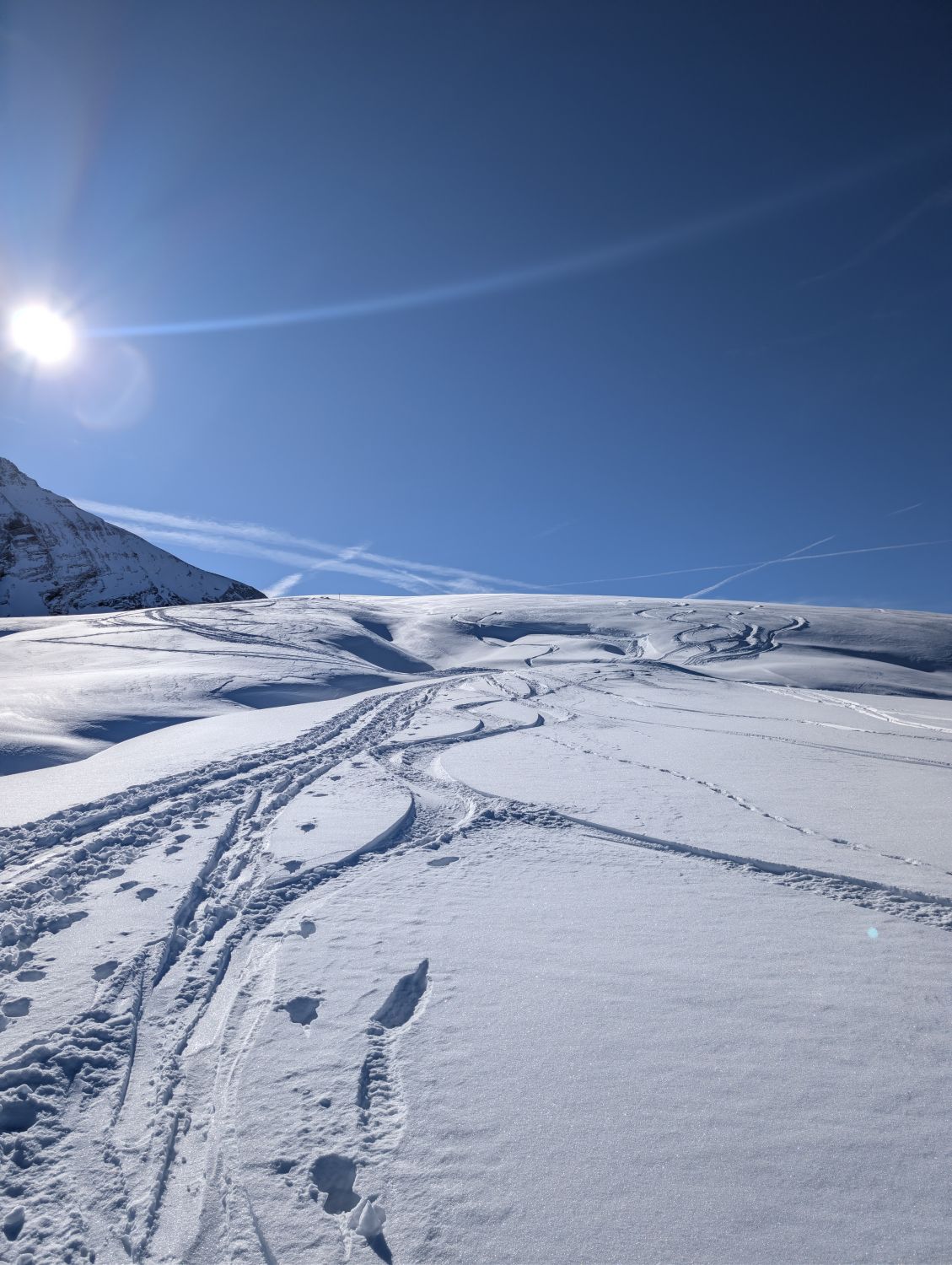 Die Abfahrt führte über die ost- bis nordostexponierten Hänge des Walliser Wispile Richtung Hintersee. Diese lagen vollständig im Schatten und boten sehr gute Verhältnisse: stellenweise bis zu 20 cm vom Wind verfrachteter, lockerer Pulverschnee. Trotz zahlreicher vorhandener Spuren war es gut zum fahren. Wir durften sogar Abschnitte nebenbei selber spuren. Der Waldabschnitt auf rund 1550 m ist gut gespurt, etwas mühsam, aber technisch problemlos zu bewältigen.