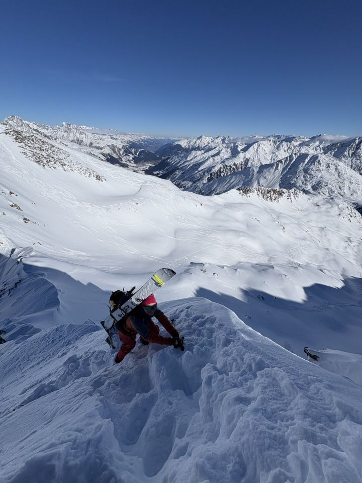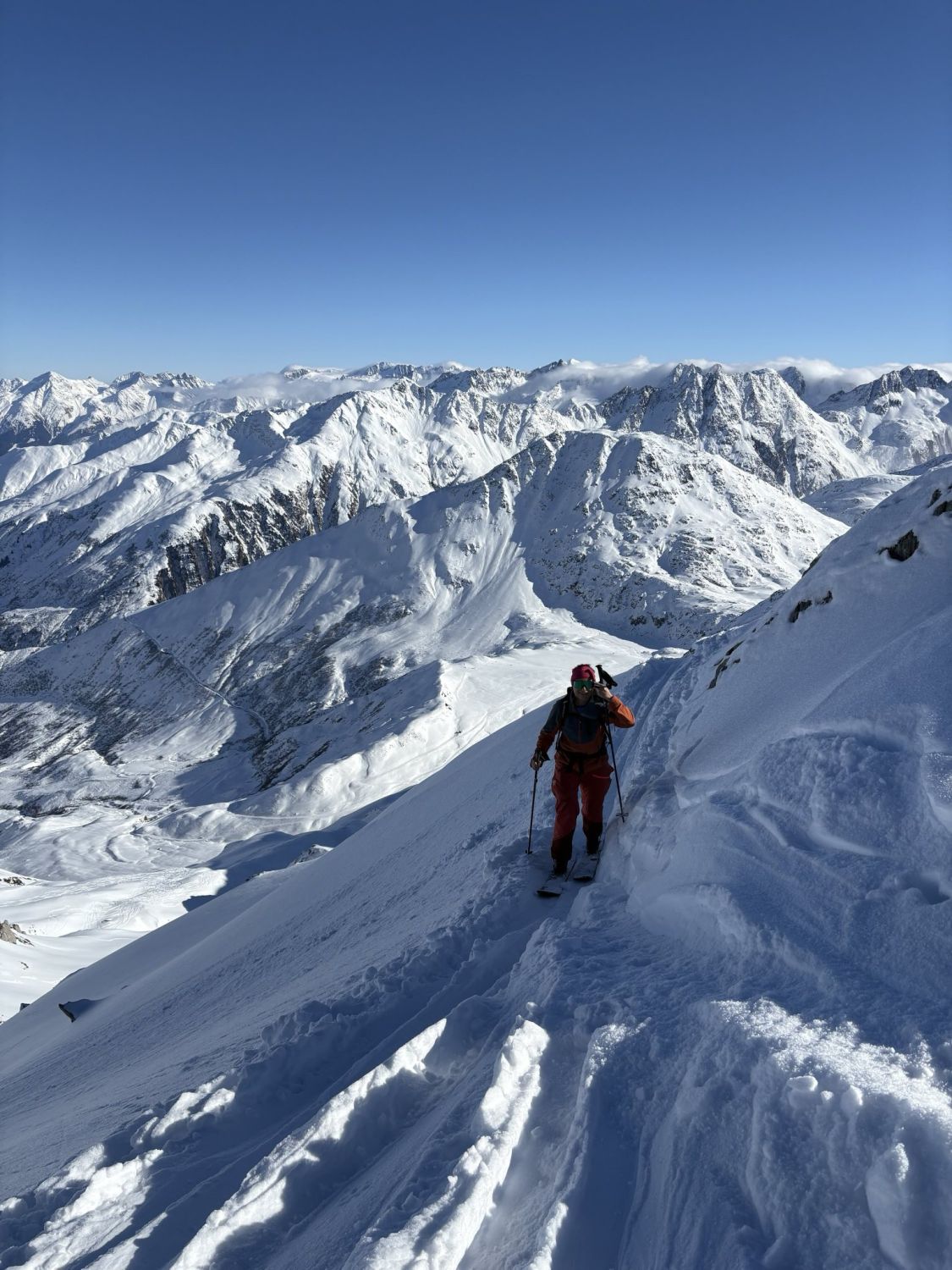 Von unten sah der direkte Aufstieg zum Rossbodenstock zu heikel aus, daher sind wir nochmals zum Rheinquellenstock aufgestiegen und haben den Rossbodenstock über den Grat erreicht. Die Bedingungen waren gut, Steigeisen und Pickel wurden nicht benötigt – ausser an einer ziemlich exponierten Stelle, wo zusätzliches Schaufeln zur Entschärfung beitrug (danke, Niki!).