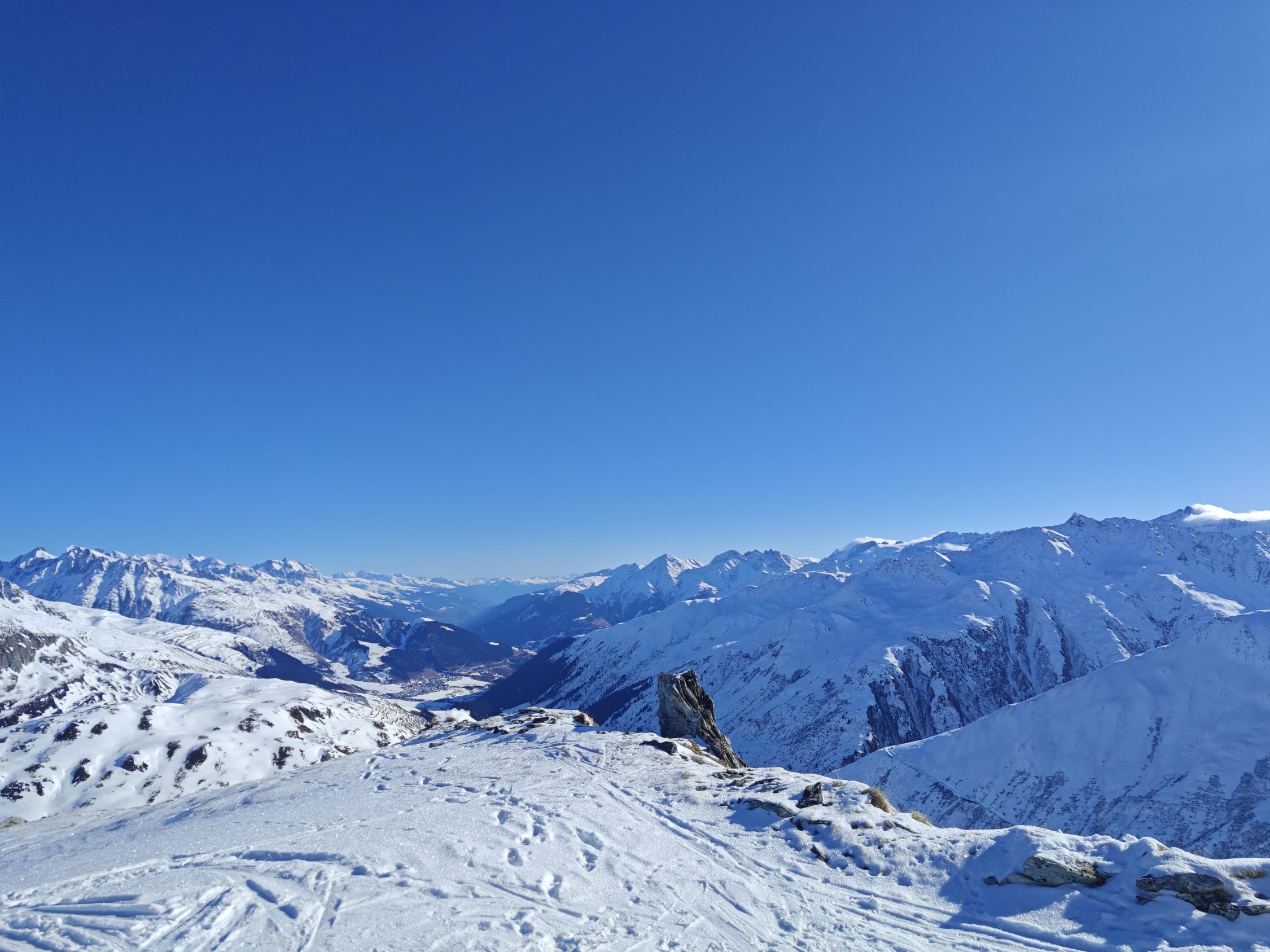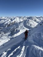 Start am Oberalppass, auf einer guten Spur hinauf zum Sattel unter dem Pazolastock. Der Übergang über Nurschalas war etwas rutschig. Den Pazolastock haben wir ausgelassen und sind direkt weiter zum Rheinquellenstock. Sehr guter Trittschnee.