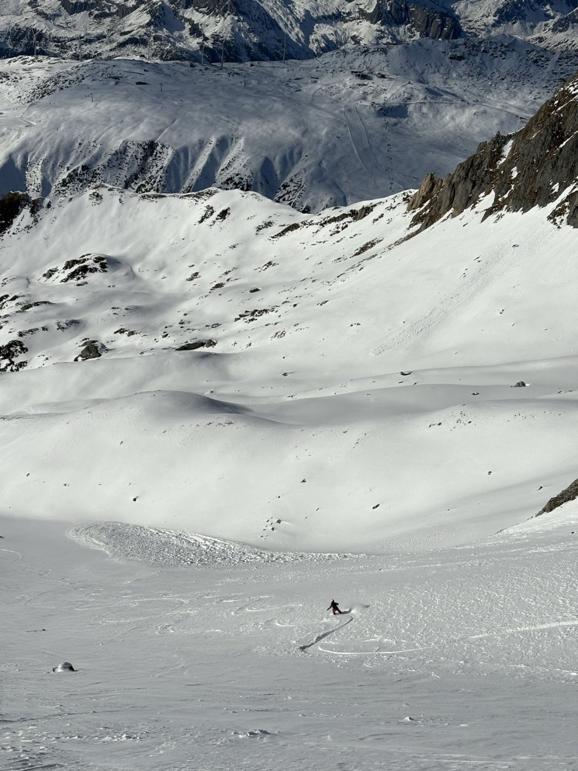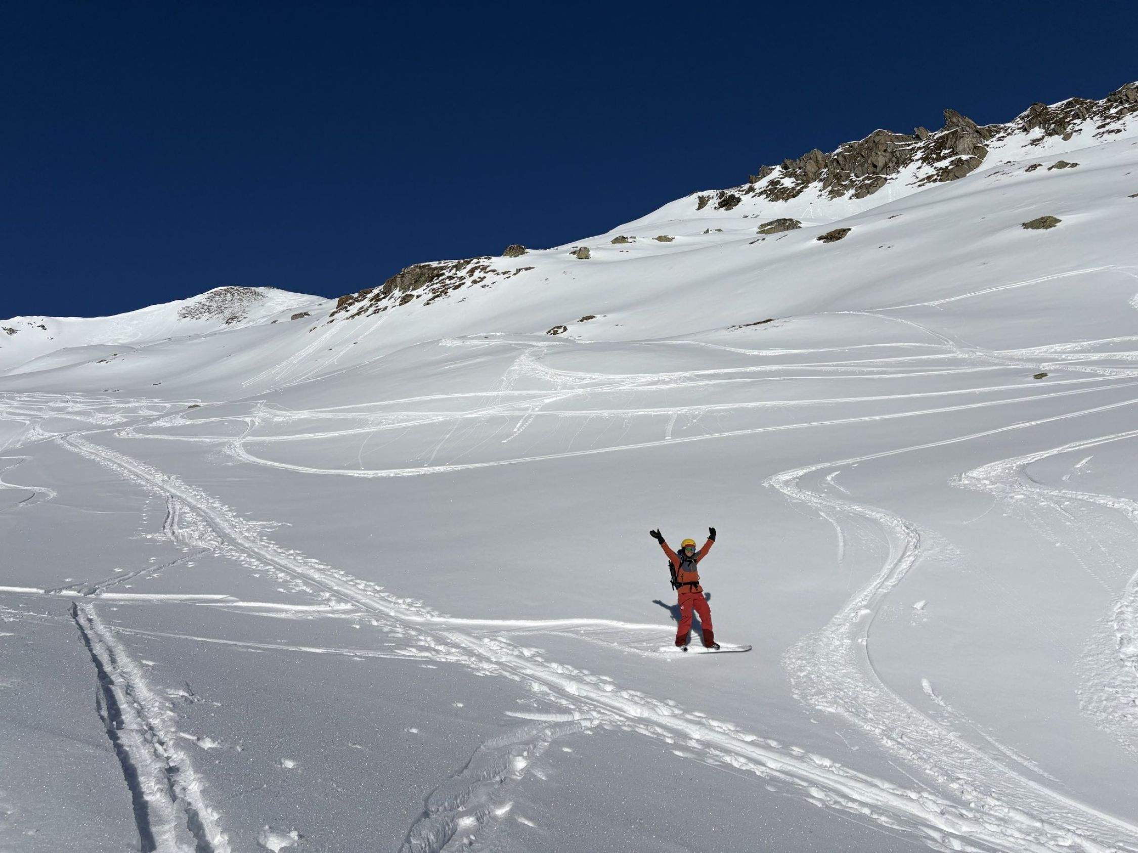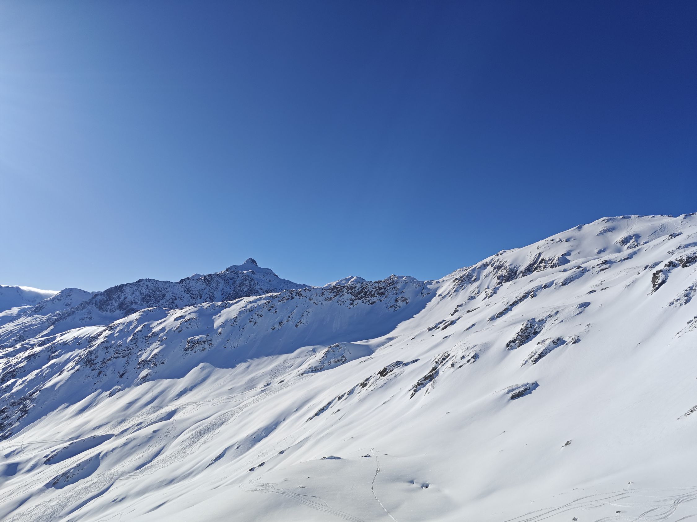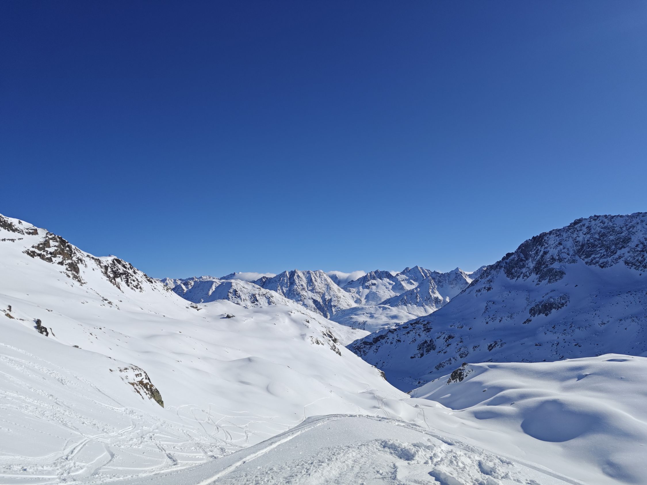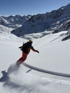 Abfahrt zum Lai da Tuma: Im Gipfelbereich hart und eisig, zudem mit Klotzen von einem Schneerutsch, danach wunderbarer Pulver und genug Platz für eigene Linien.