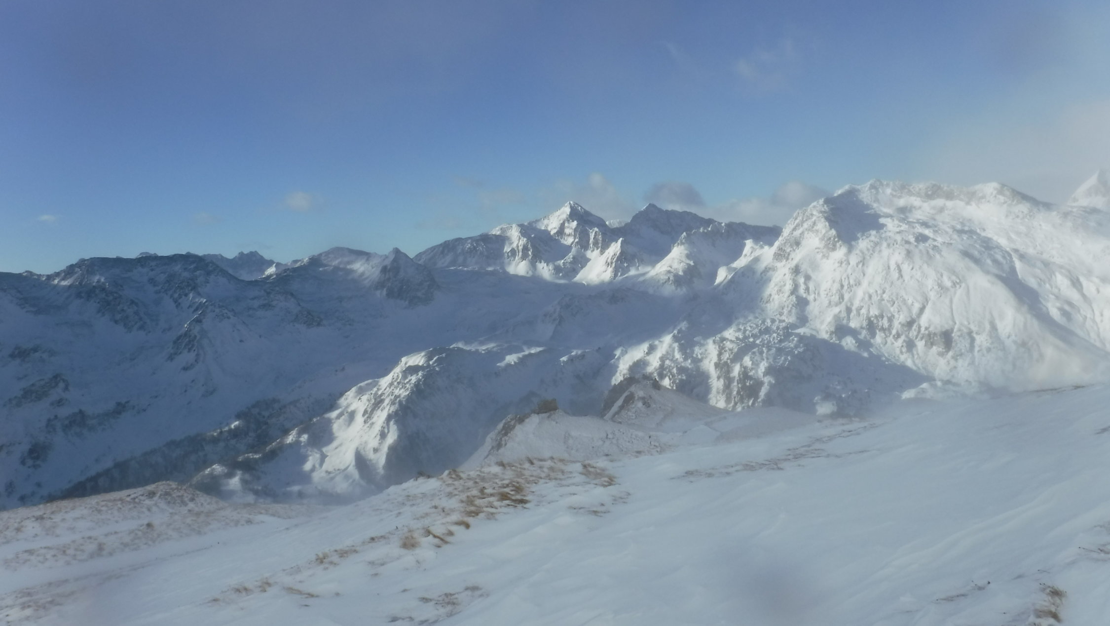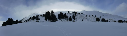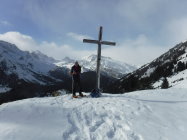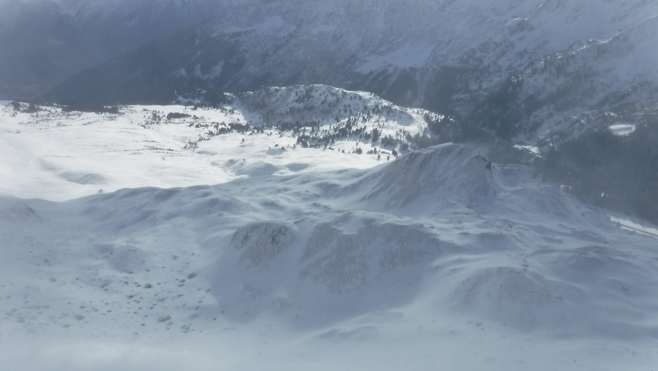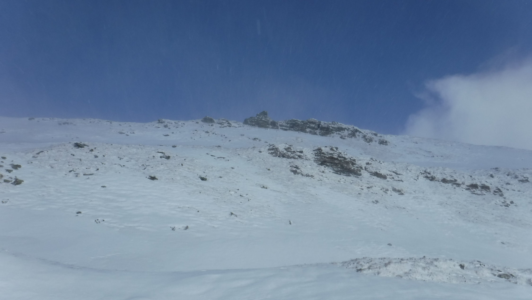 Tourenbeginn um 07:45 Uhr bei -7°C und starkem Nordföhn (wohl bis 35 km/h). Am Gipfel waren es -9°C. Es herrschten ständig Schneefahnen, so daß keine Sicht war, lediglich helles Licht aus dem sonnigen Süden. Die Aufstiegsroute war gekennzeichnet von ständigem Wechsel zwischen abgeblasenen Stellen auf Bruchharst und verfrachteten Triebschneefeldern. Letztere waren zwar nicht tiefer als 25 cm, gaben aber auf schrägen Flächen den SS keinen Halt. Ein schnelles Vorwärtskommen war dort so nicht möglich. Ab dem Croce del Bosc war es dann erheblich angenehmer im Windschatten und nun in der Sonne.