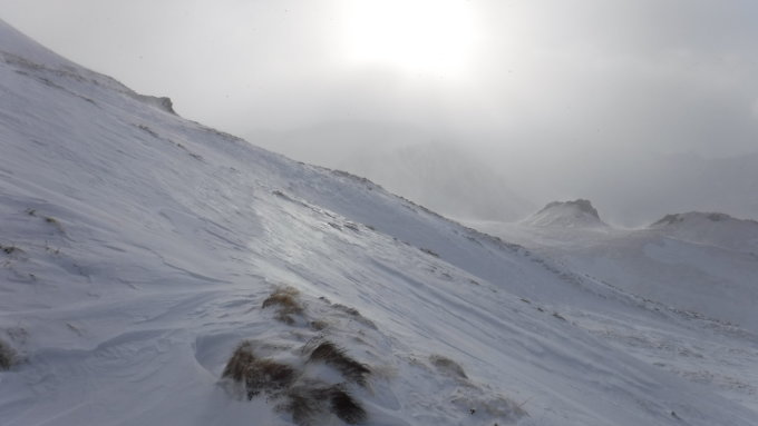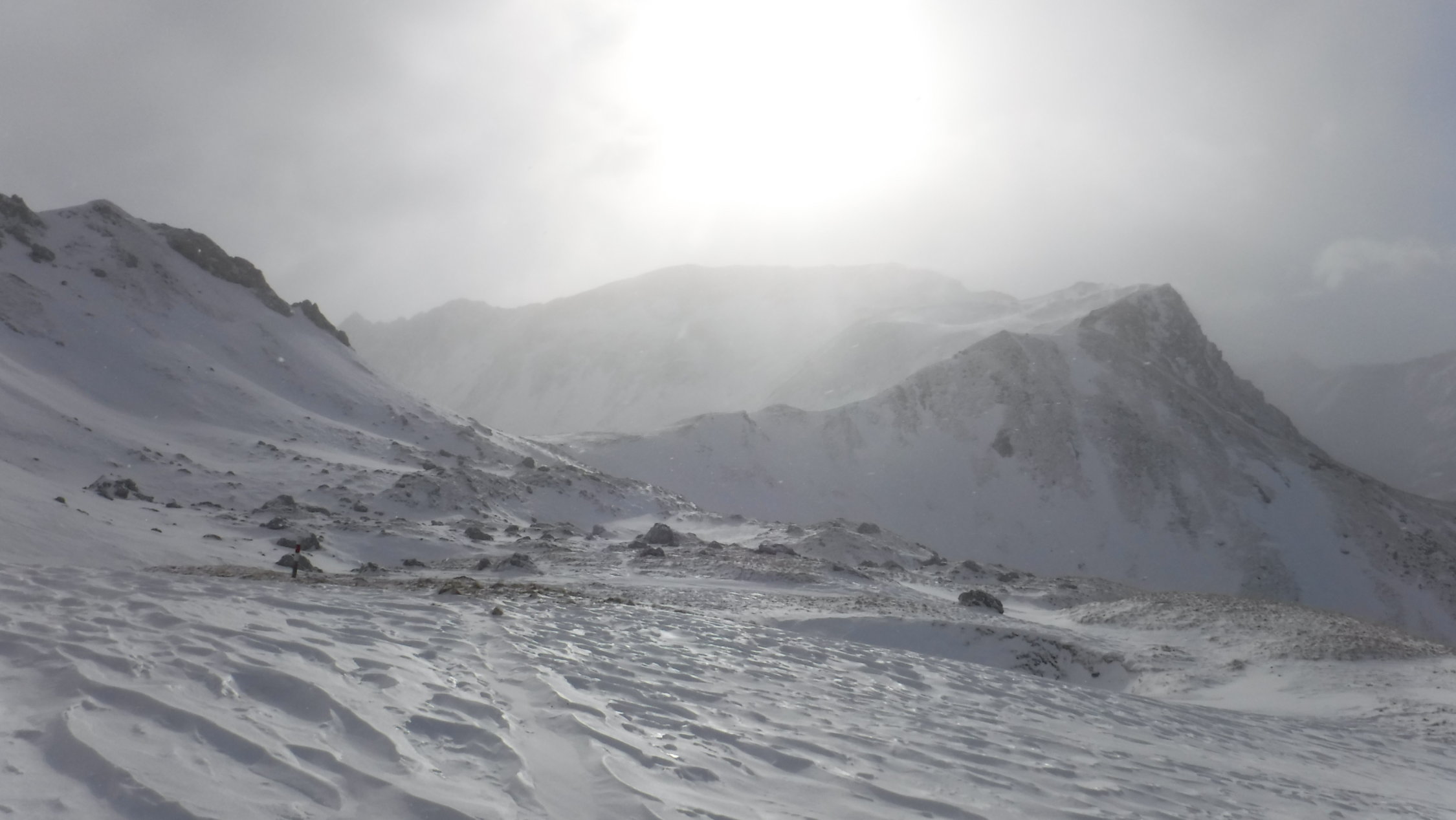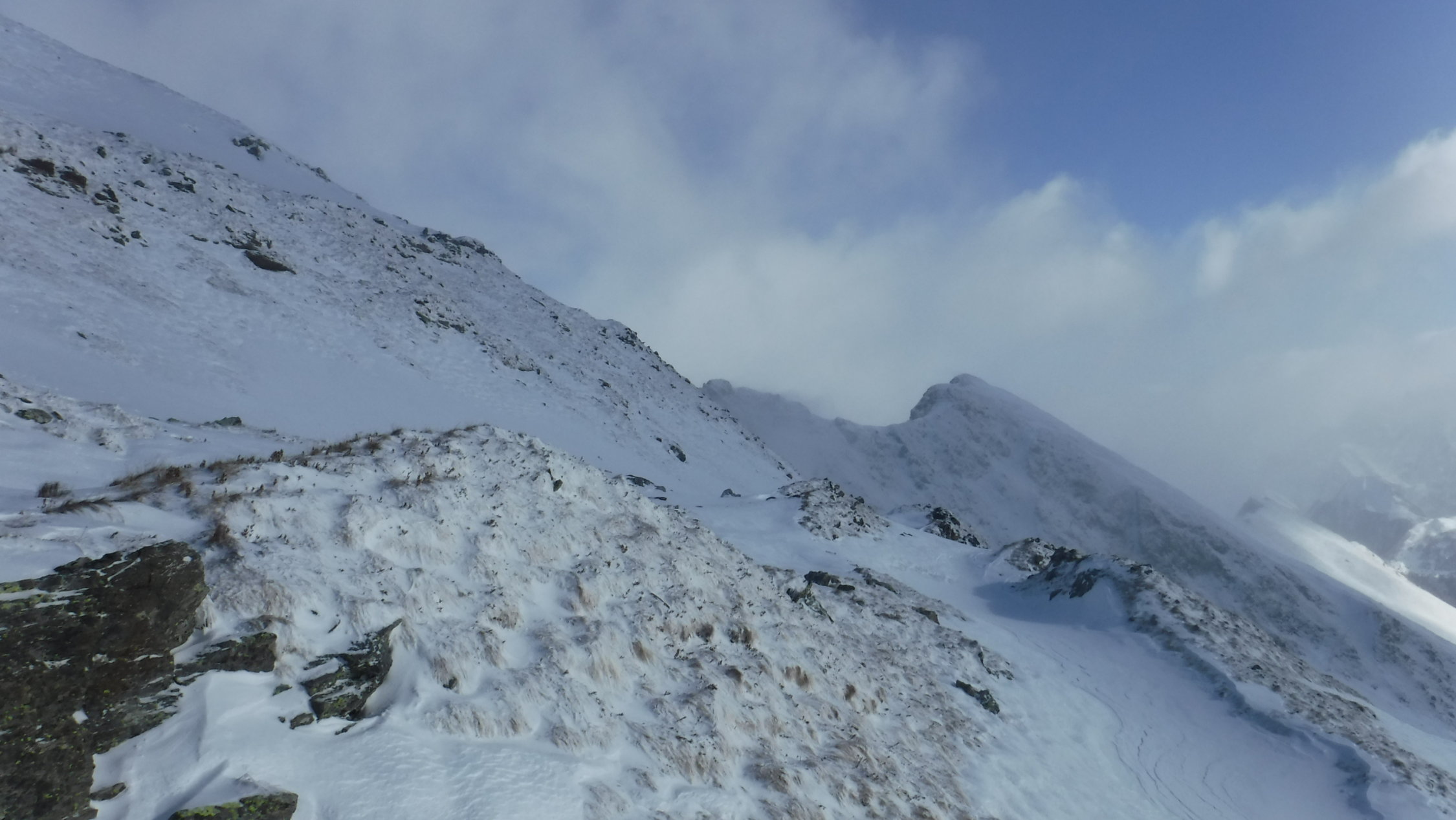 Tourenbeginn um 07:45 Uhr bei -7°C und starkem Nordföhn (wohl bis 35 km/h). Am Gipfel waren es -9°C. Es herrschten ständig Schneefahnen, so daß keine Sicht war, lediglich helles Licht aus dem sonnigen Süden. Die Aufstiegsroute war gekennzeichnet von ständigem Wechsel zwischen abgeblasenen Stellen auf Bruchharst und verfrachteten Triebschneefeldern. Letztere waren zwar nicht tiefer als 25 cm, gaben aber auf schrägen Flächen den SS keinen Halt. Ein schnelles Vorwärtskommen war dort so nicht möglich. Ab dem Croce del Bosc war es dann erheblich angenehmer im Windschatten und nun in der Sonne.