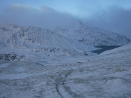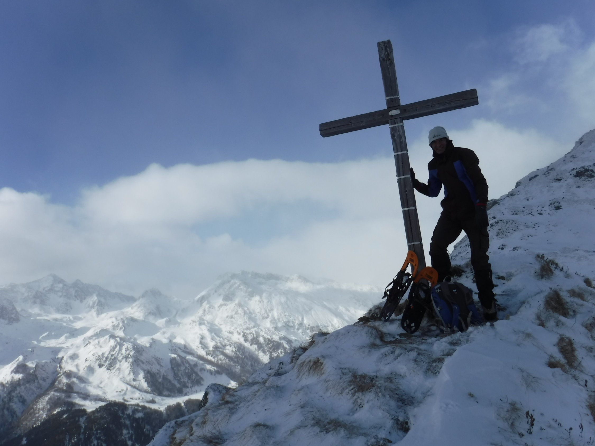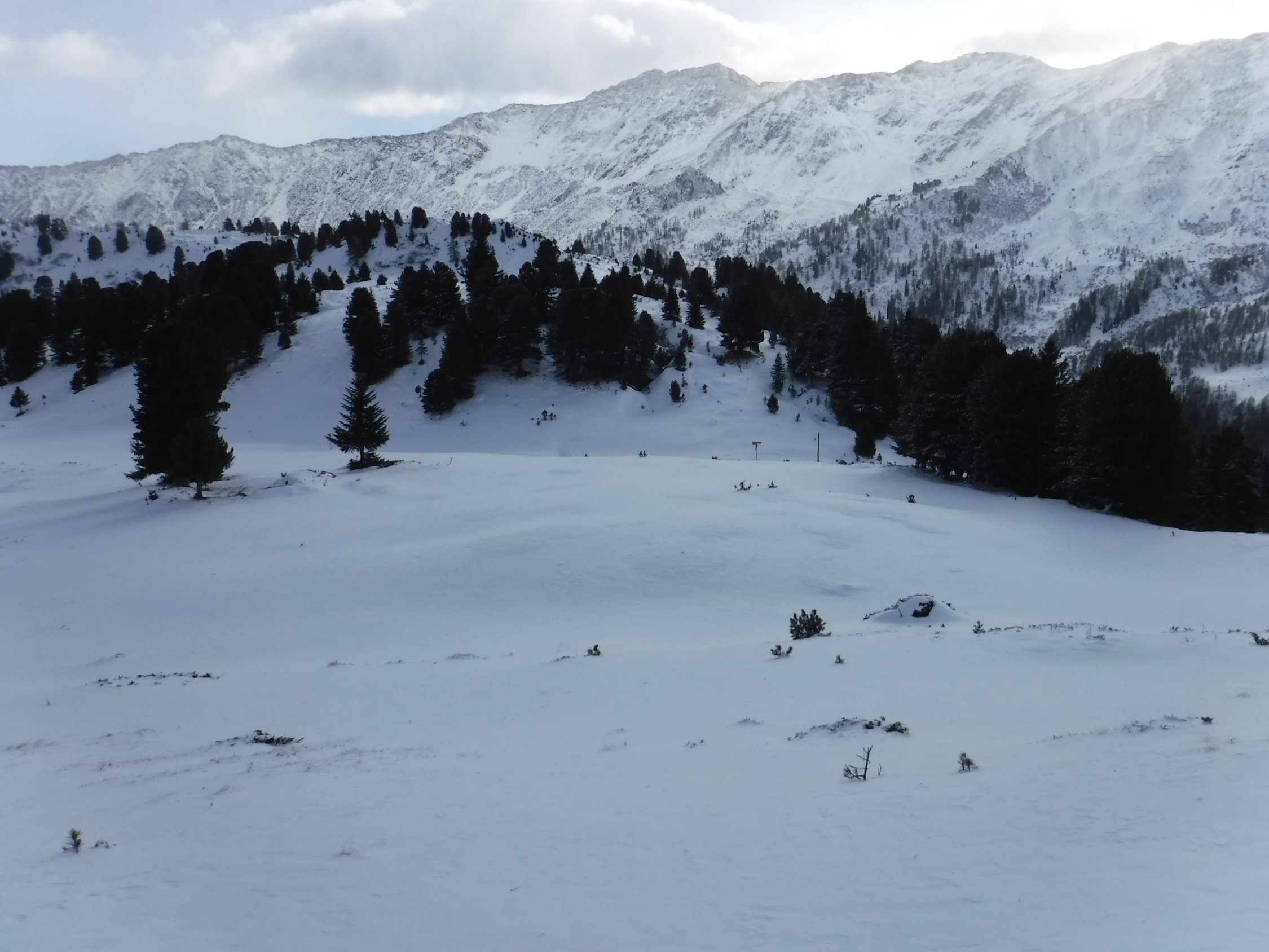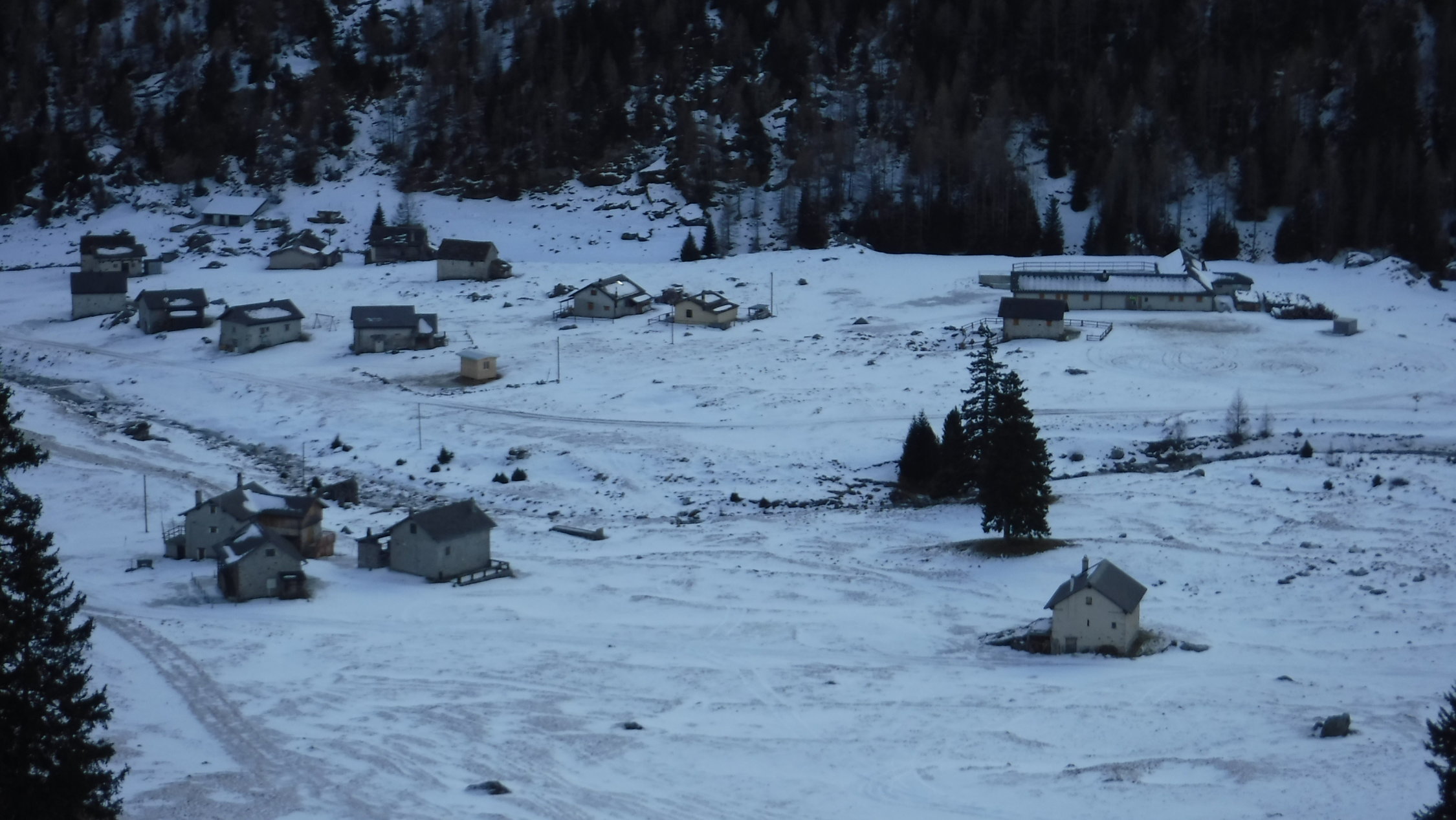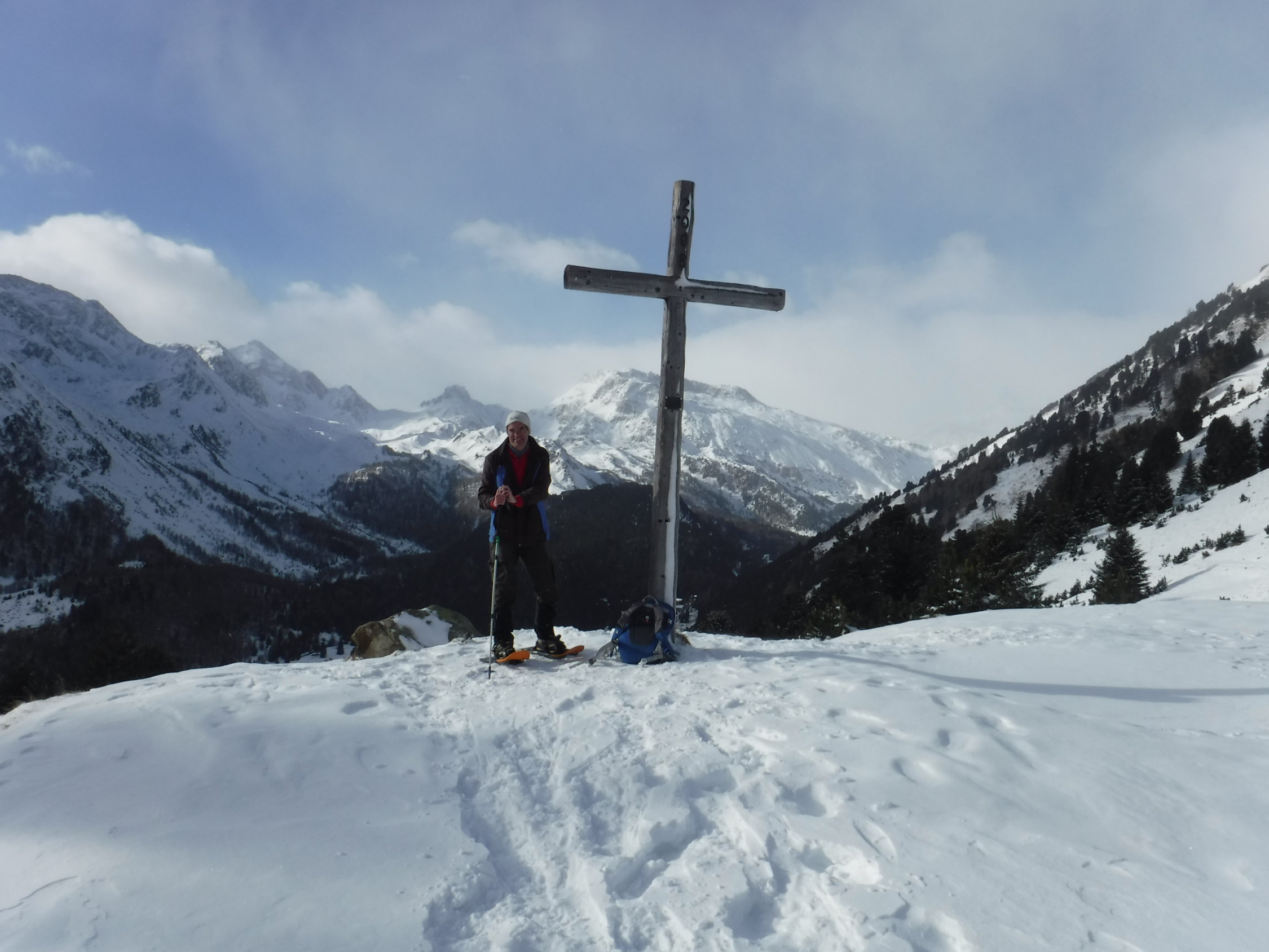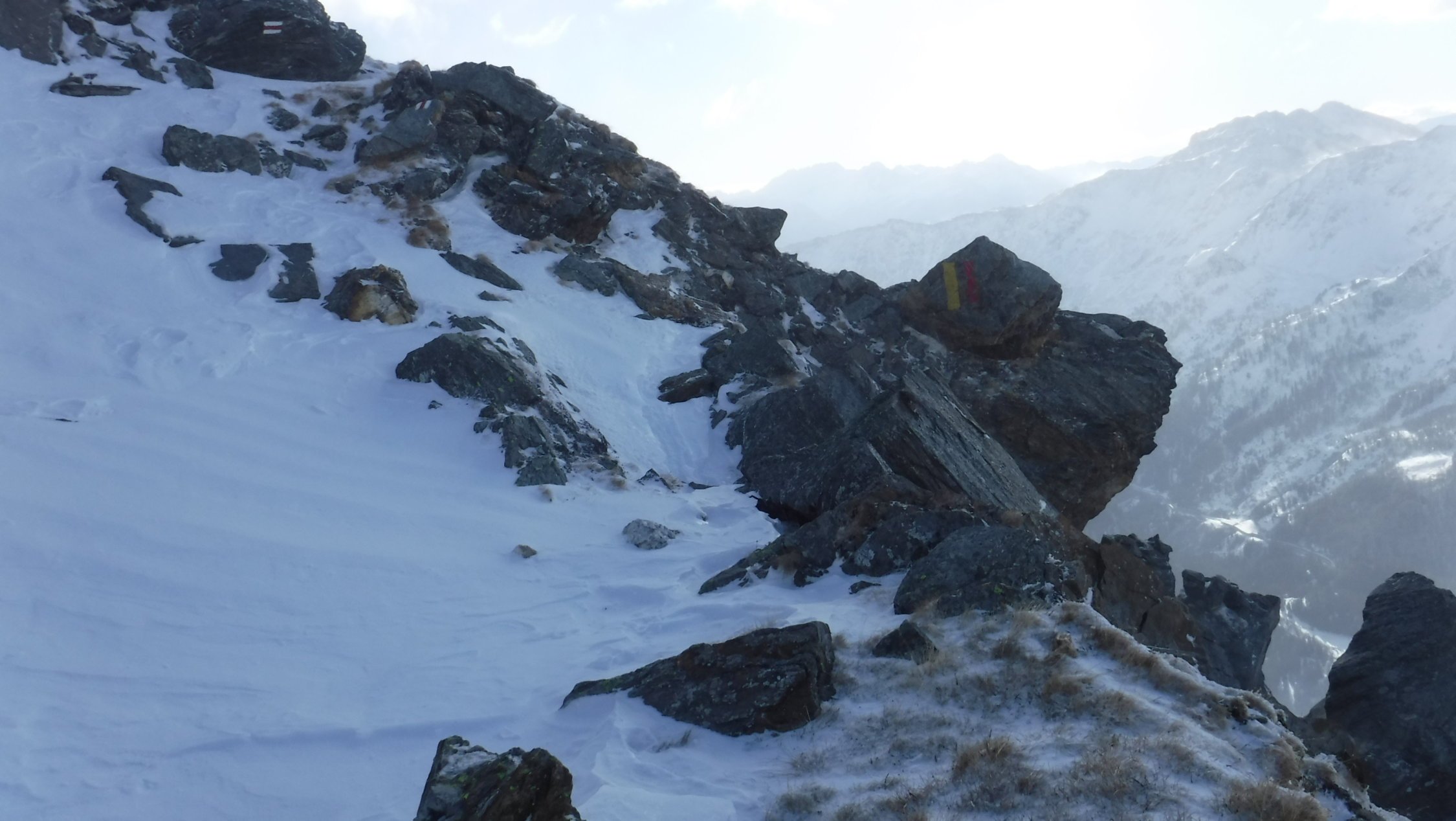 Beim Wegweiser vor dem Croce Portera traf ich auf eine frische Fußspur (keine SS) im tiefen Schnee von Dötra kommend. Für den Waldsteig zwischen Croce Portera und Acquacalda schnallte ich die SS ab. Den Abstieg von der Felsnische nach dem P 2505 zur Senke vor dem Croce del Bosc unternahm ich mit Steigeisen, die auch im Gras griffen bei den abgeblasenen Hangstellen. Bei den vielen kleinen Schneewehen hielten zudem die SS nicht.