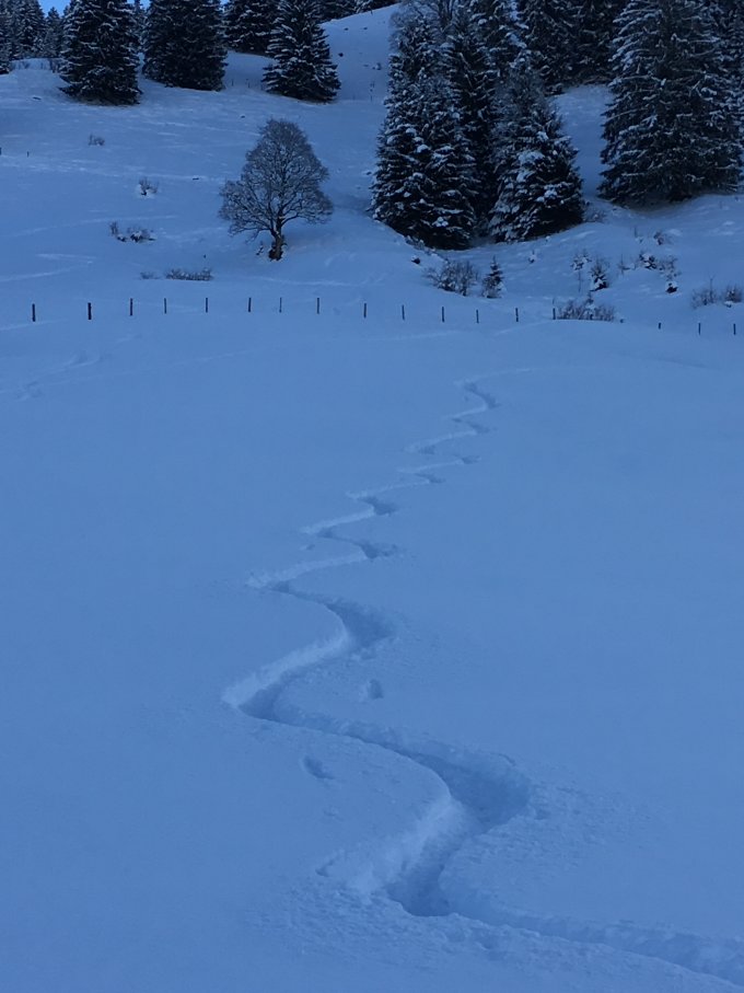 mit den ski am skidepot vorbei und bis auf den gipfel. pulver von oben bis unten. die 2 steilstufen wurde heute sicher recht strapaziert. viele türeler unterwegs. wir waren zu 4. mit den ski oben. weitere folgten. im unteren 3.el steinkontakt infolge schlecht eingeschneiter steinen und steinmauern.
