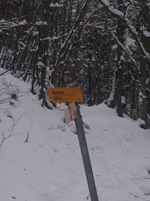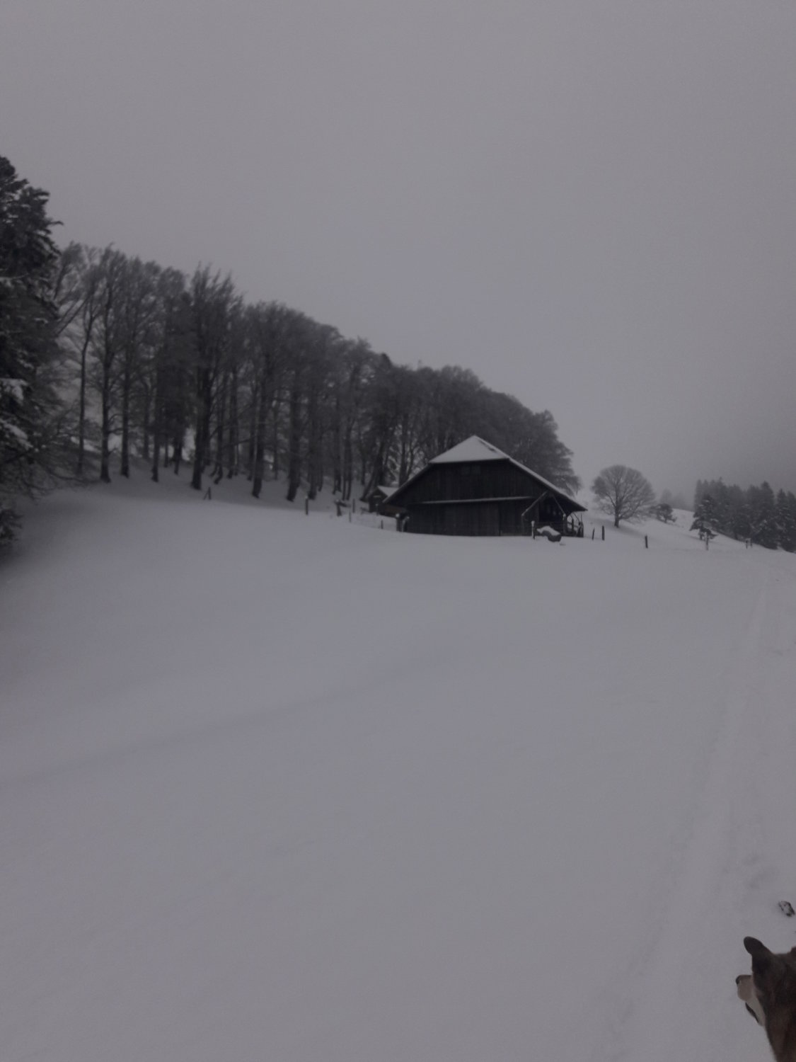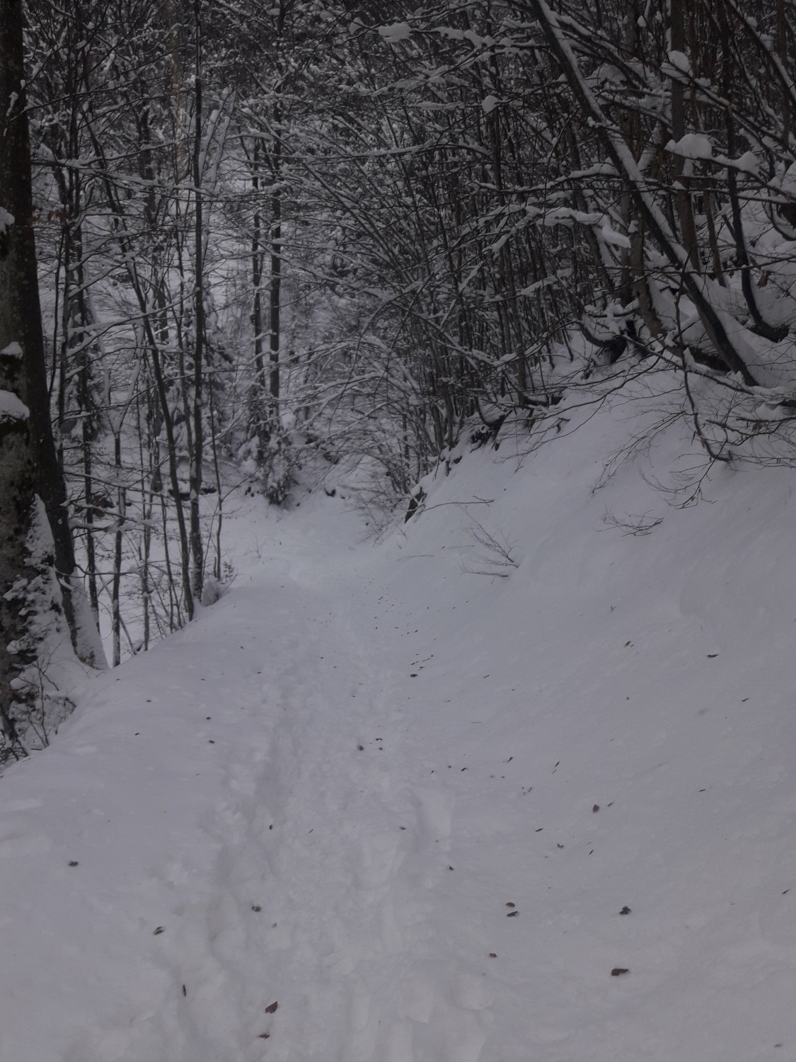 Schnee ab Parkplatz. Könnte schon fast für eine Skitour reichen :-) -naja, im unteren Bereich noch nicht ganz, ab der Hälfte bestimmt. Oben teils 50cm Schnee und heute eine strenge Biese.