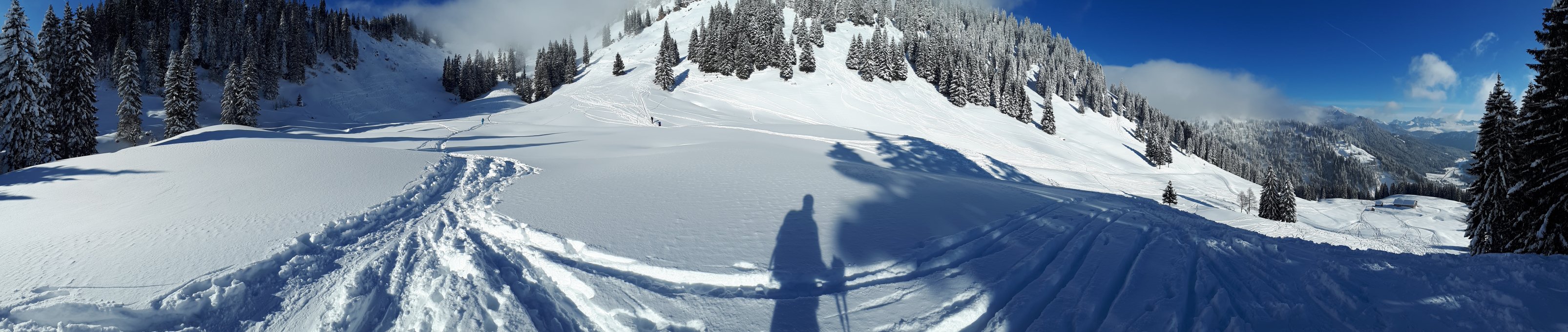 Nachdem Gemsi schon den ganzen Nordhang zerpflügt hat sind wir wieder entlang dem Aufstiegschlauch abgefahren. Hier muss auf Stacheldraht geachtet werde der im unteren drittel nicht abgebaut wurde. Wieder Aufstieg zum Gierenkopf und Abfahrt Richtung Scheidwangalpe. Dort sind noch zwei Schläuche unbefahren. Nicht direkt vom Gipfel Richtung N sondern erst etwas nach S dann kommen die Schläuche nach Osten hinab.