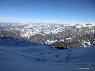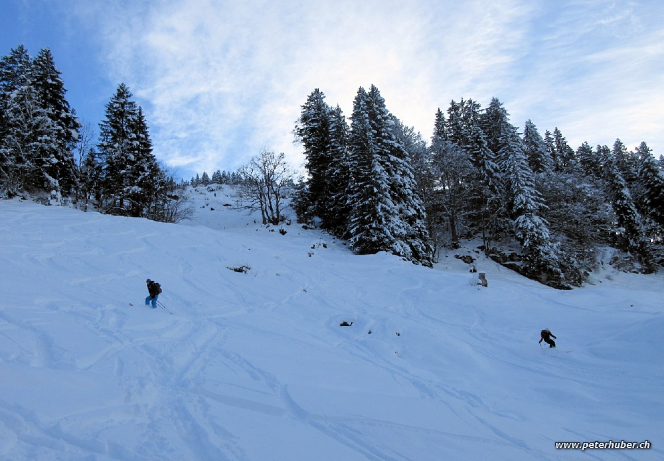 Abfahrt schön, oft mit fast knietiefem Pulver. Unterhalb 1400 m spürt man den Untergrund und es gibt einige Bodenkontakte (keine Steine erwischt).