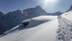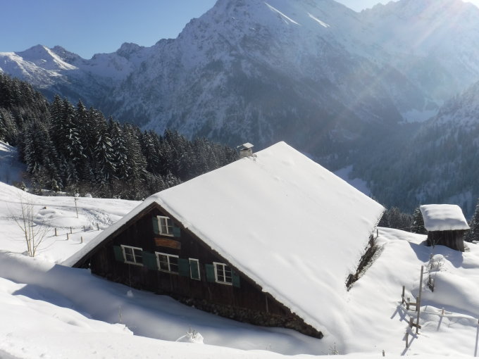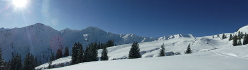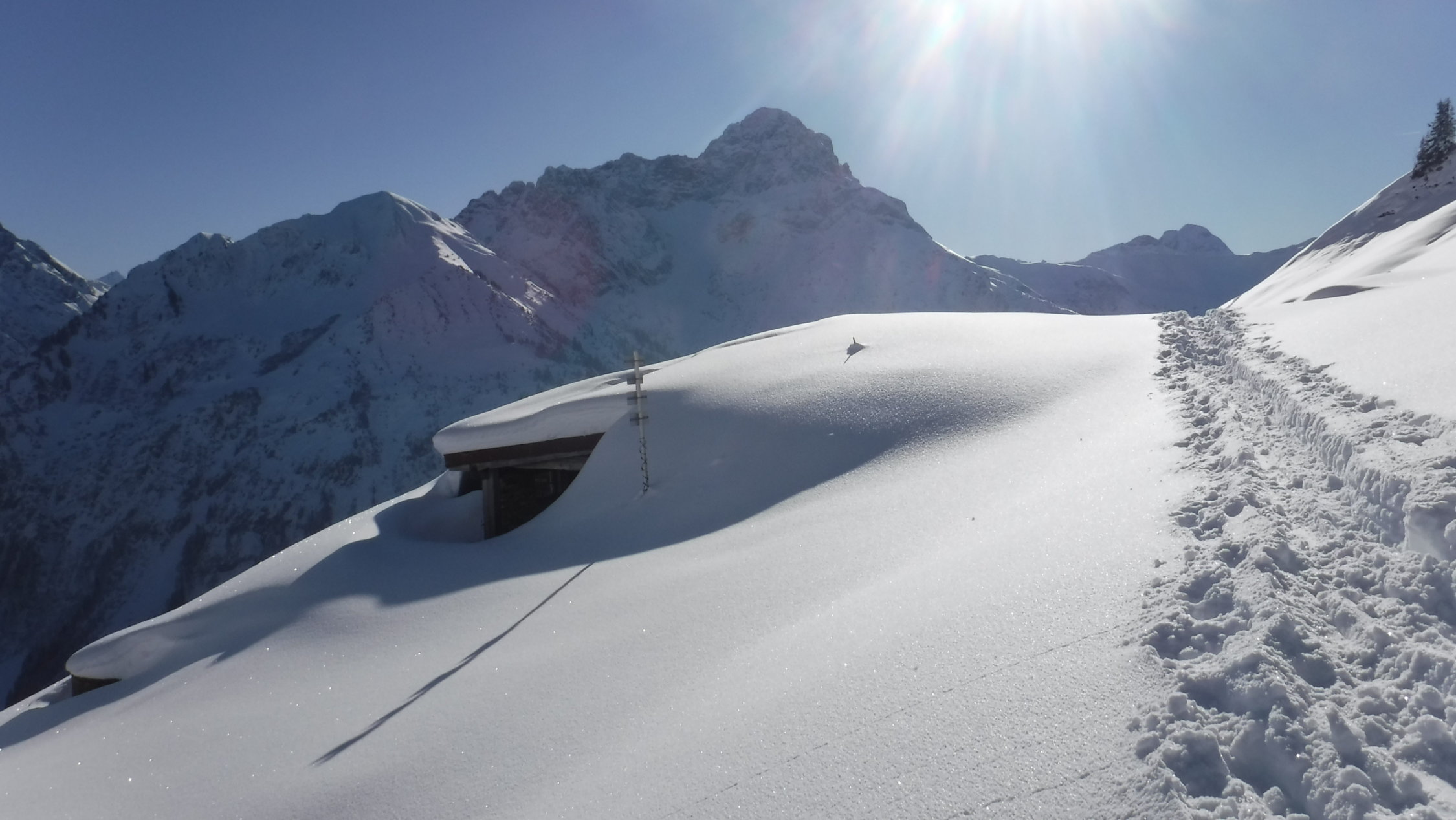Tourenbeginn bei -13°C und klarem Himmel. So blieb der Schnee pulvrig. In der Sonne an der Stutzalpe dann sage und schreibe +20°C.