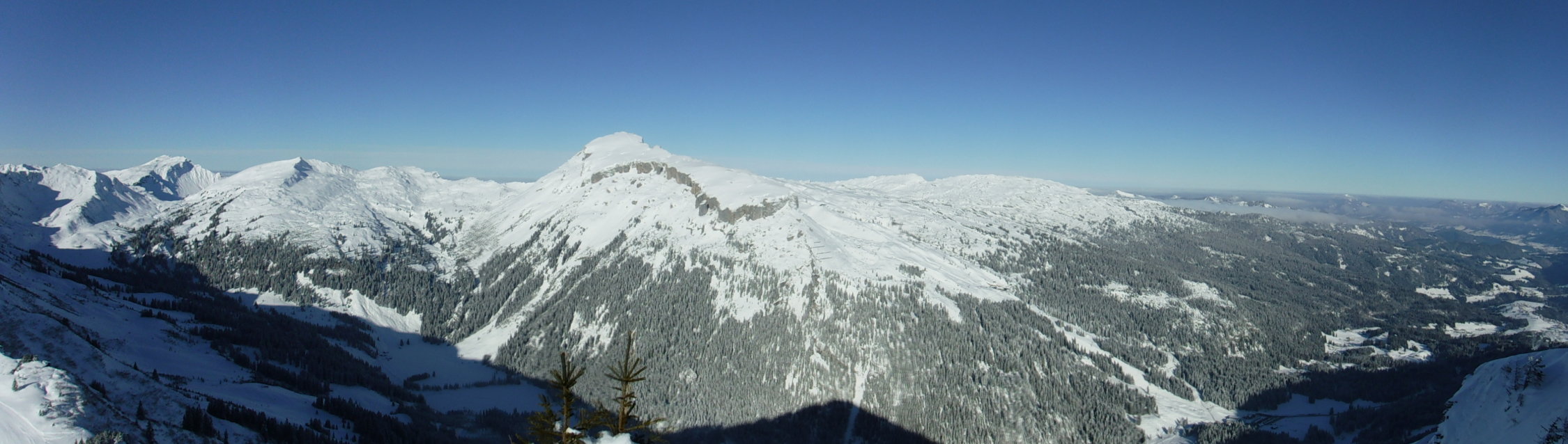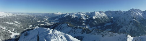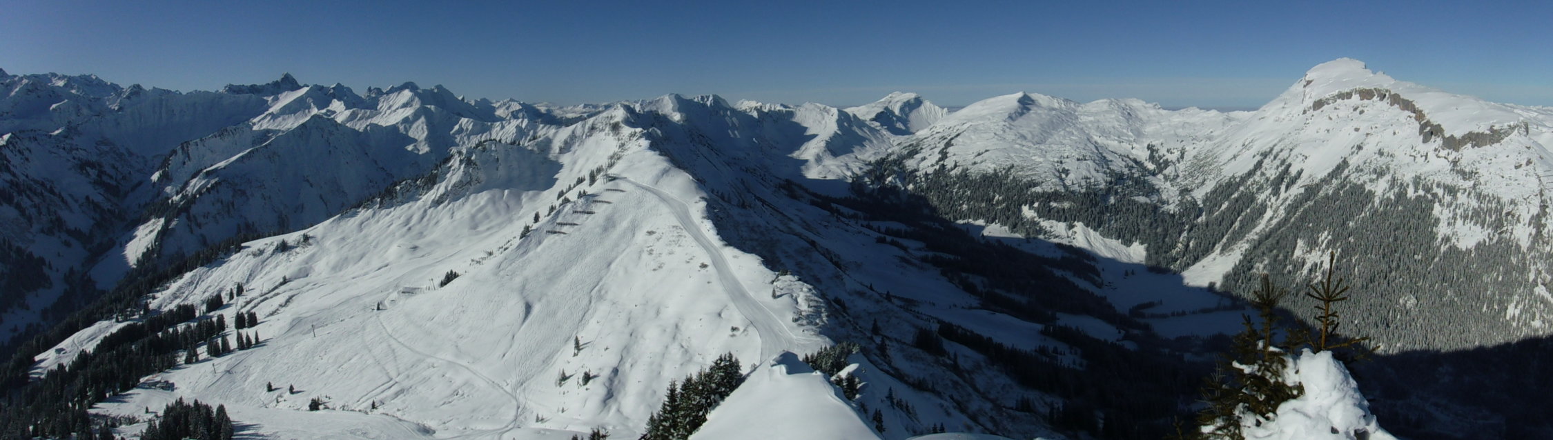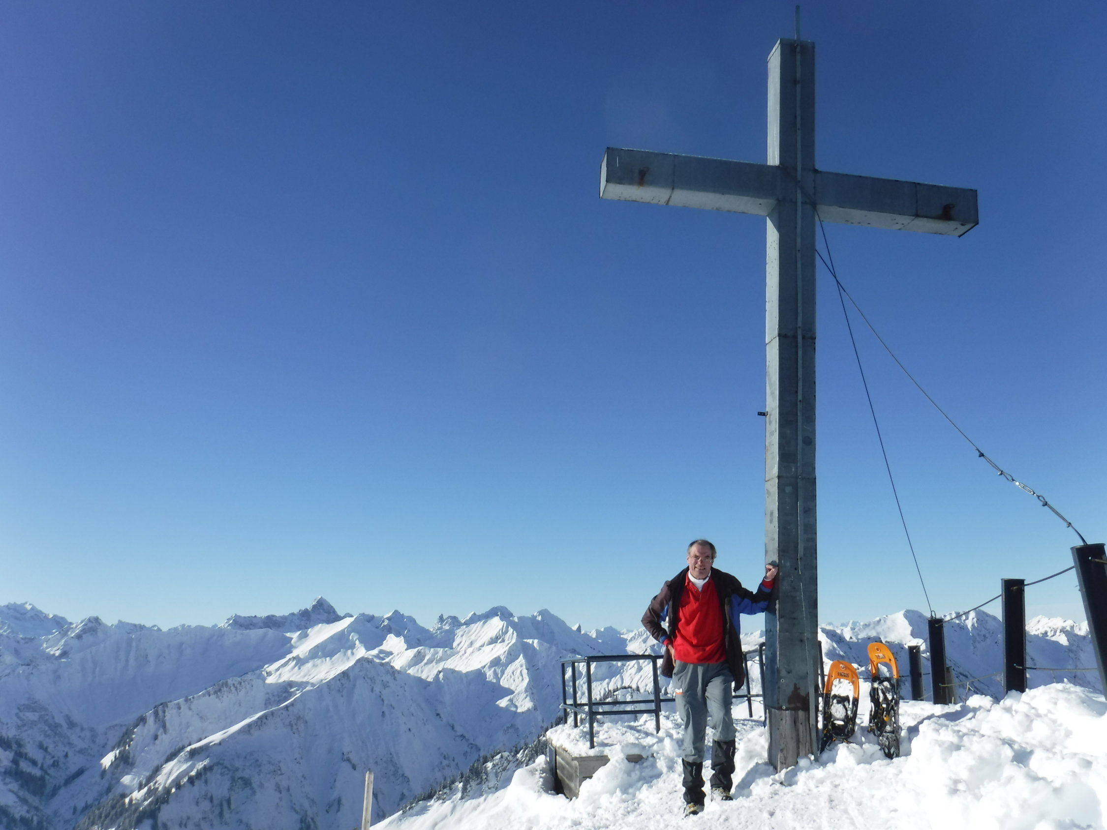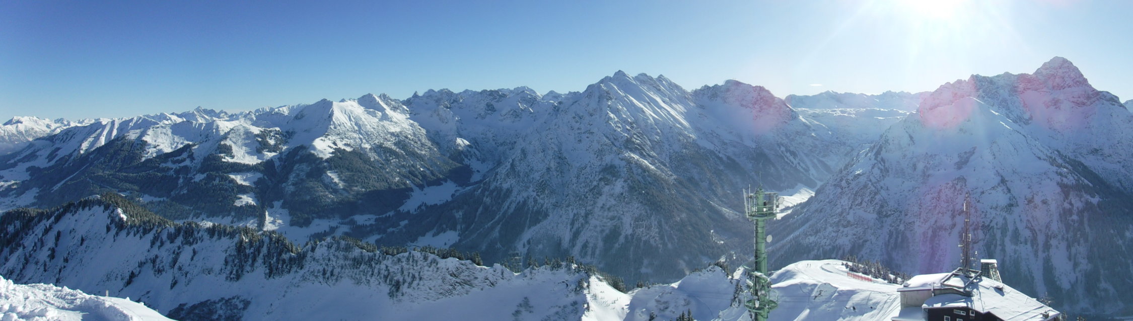 Vom Gipfel hat man schönes Süd- und Westpanorama: zur Valluga, zum Widderstein und rechts dahinter Mohnfluh und Braunarlspitze, Hochkünzelspitze, Güntlespitze, Üntschenspitze naher Muttelbergkopf, rechts dahinter der Diedamskopf.