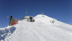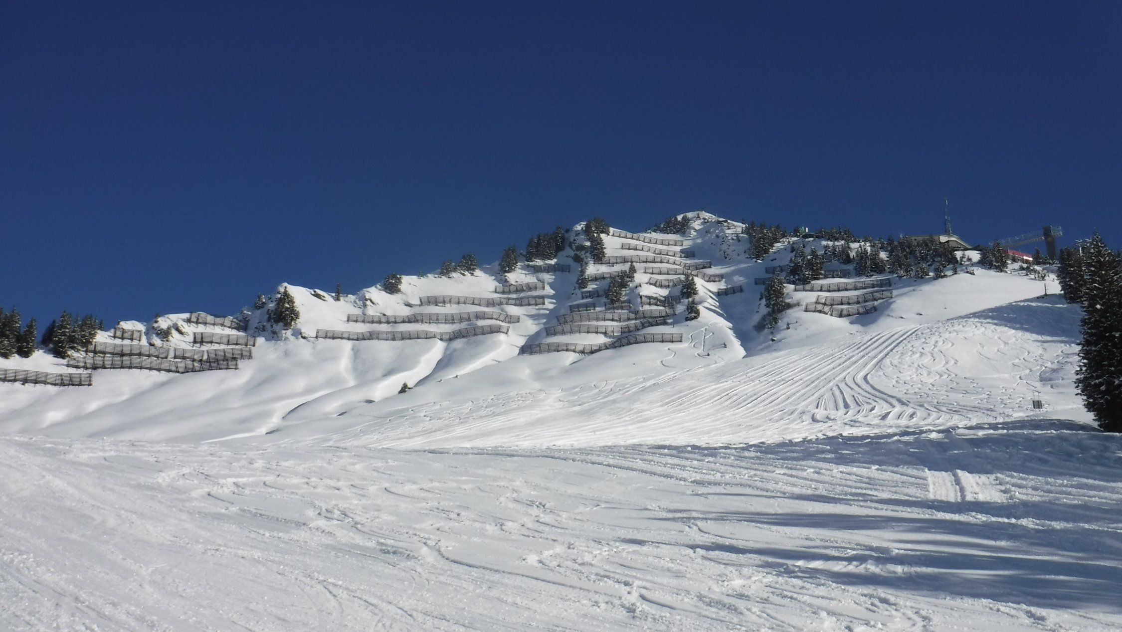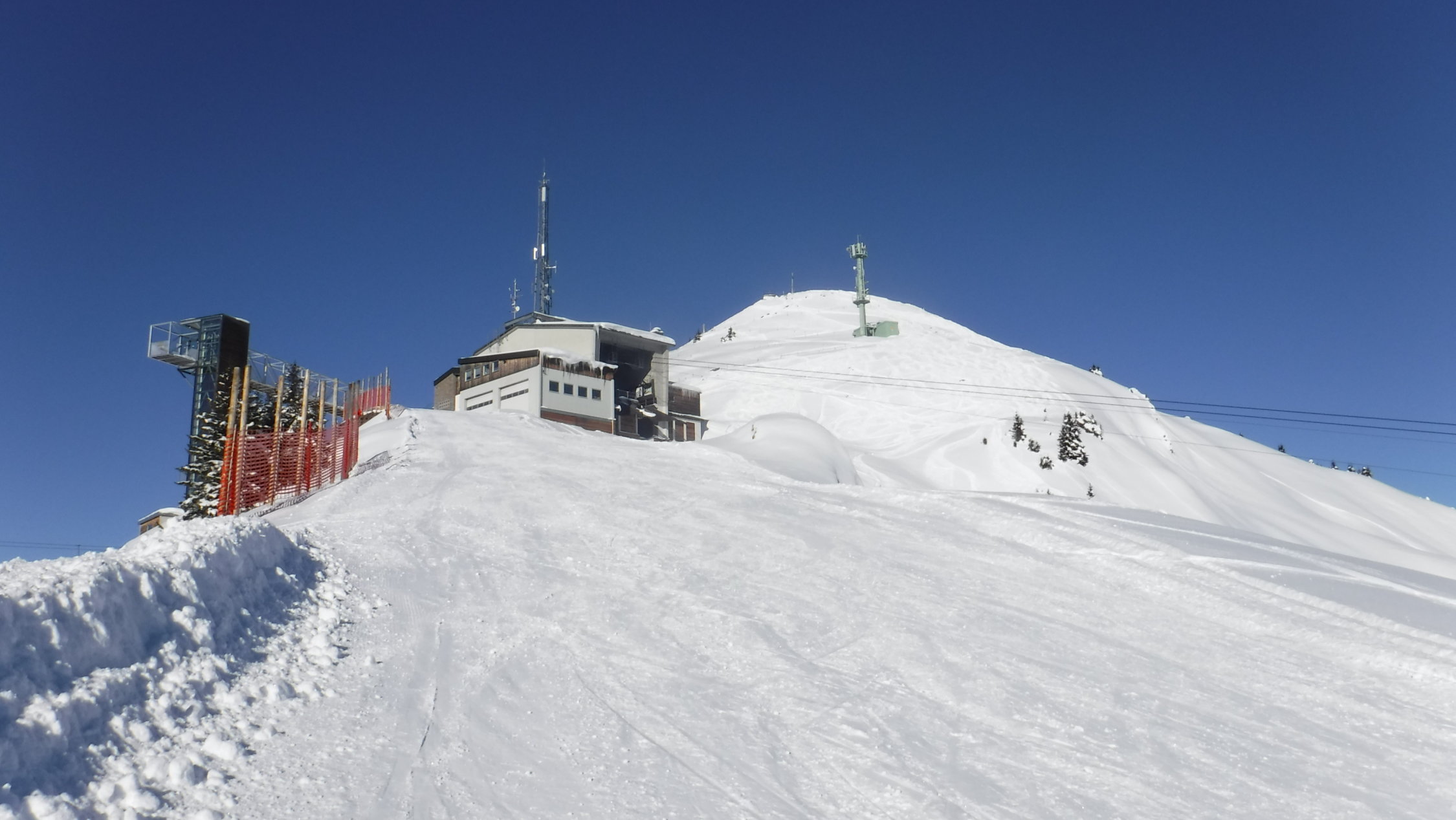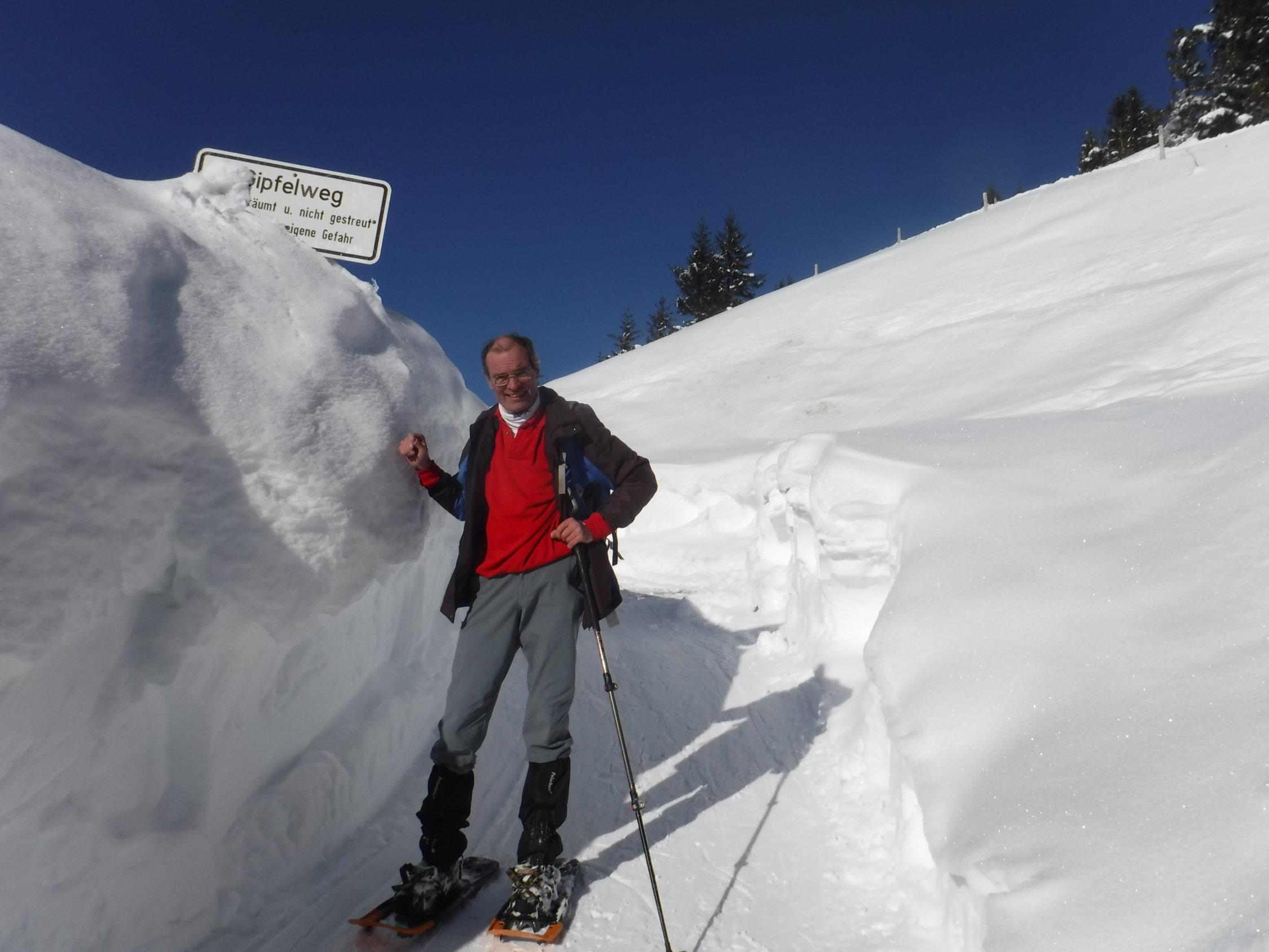 Die Schneeschuhe konnte man schon am Parkplatz anschnallen. Unten haben die mobilen Schneekanonen schon eine reichliche Schneedecke erzeugt. Nach oben nimmt die Schneehöhe zu bis zu 40 cm. Bei Schneeansammlungen noch mehr. Im oberen Skigebiet sind die Pisten schon gewalzt. Jedoch herrscht noch kein Skibetrieb. Nur bis zum Saisonbeginn ist die Route über die Pisten zu empfehlen. Ab 9.12. soll der Skibetrieb beginnen. Es sind viele Spuren der Skitourengänger vorhanden. Auf bayerischer Seite ist der Skibetrieb am Söllereck bereits im Gange.