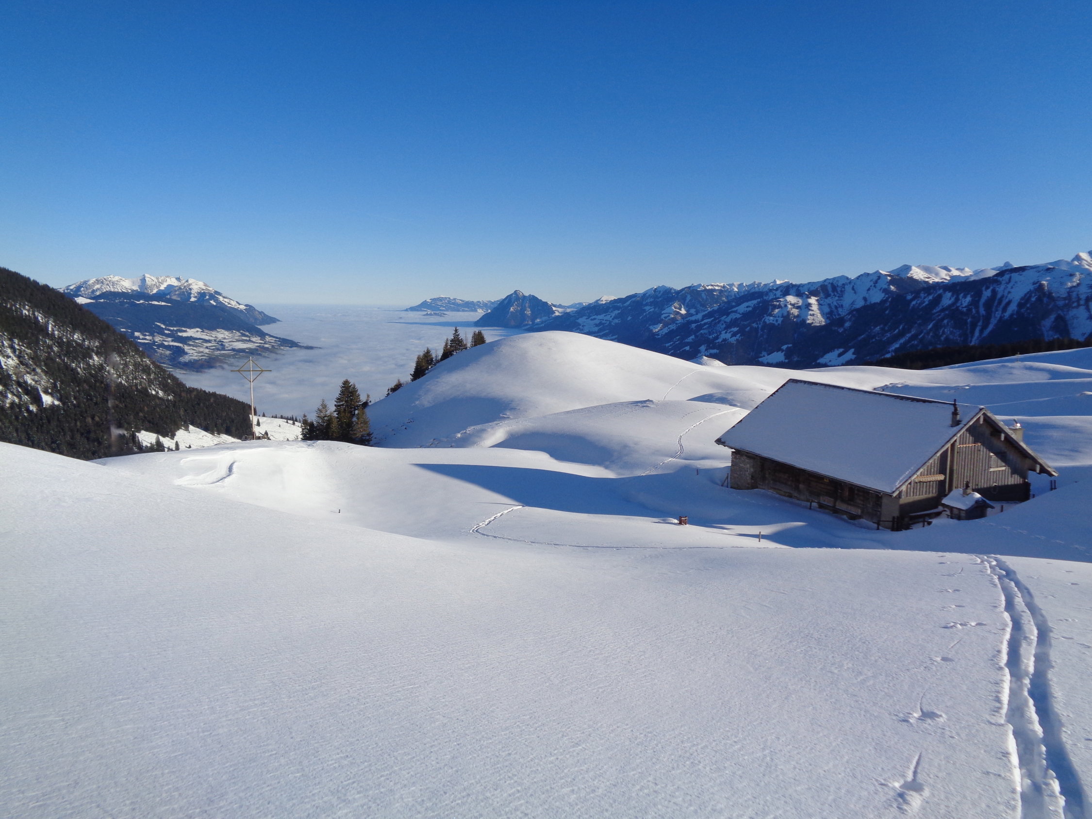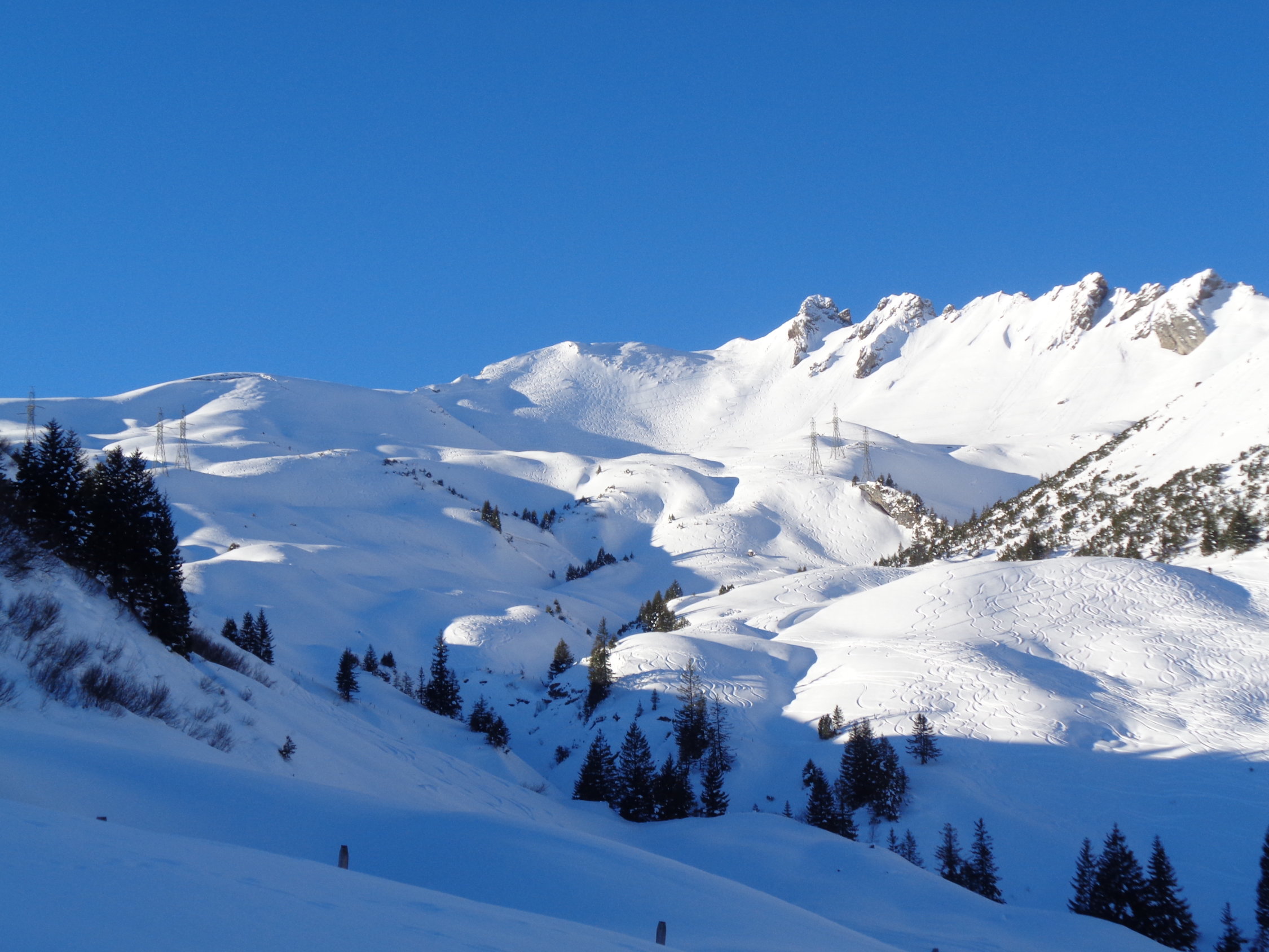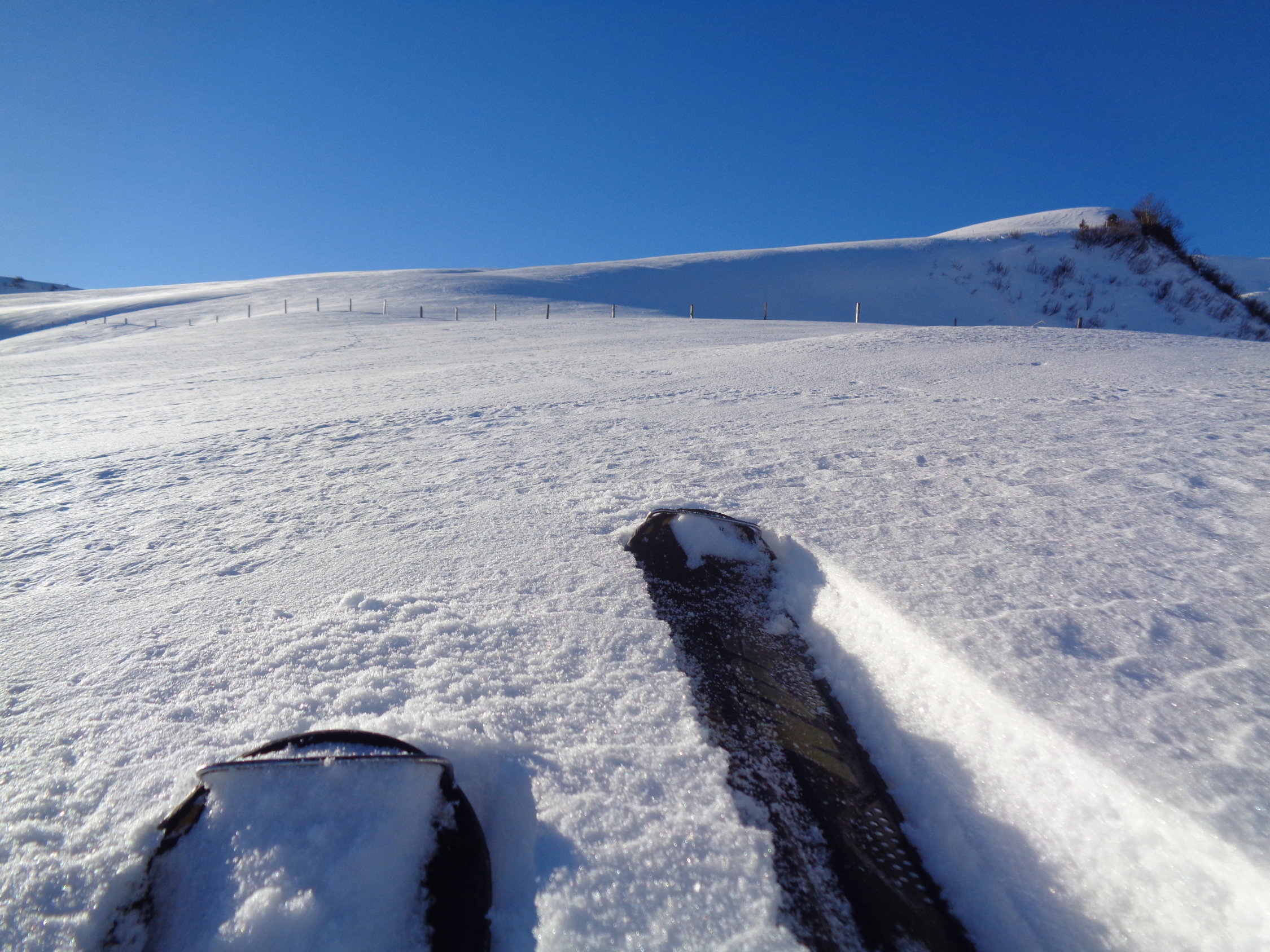 Strasse gut, Berg Pulver gut, wenig Unterlage, sonnig, praktisch windstill und relativ warm, und der Platz für eigene Schwünge wird immer enger!