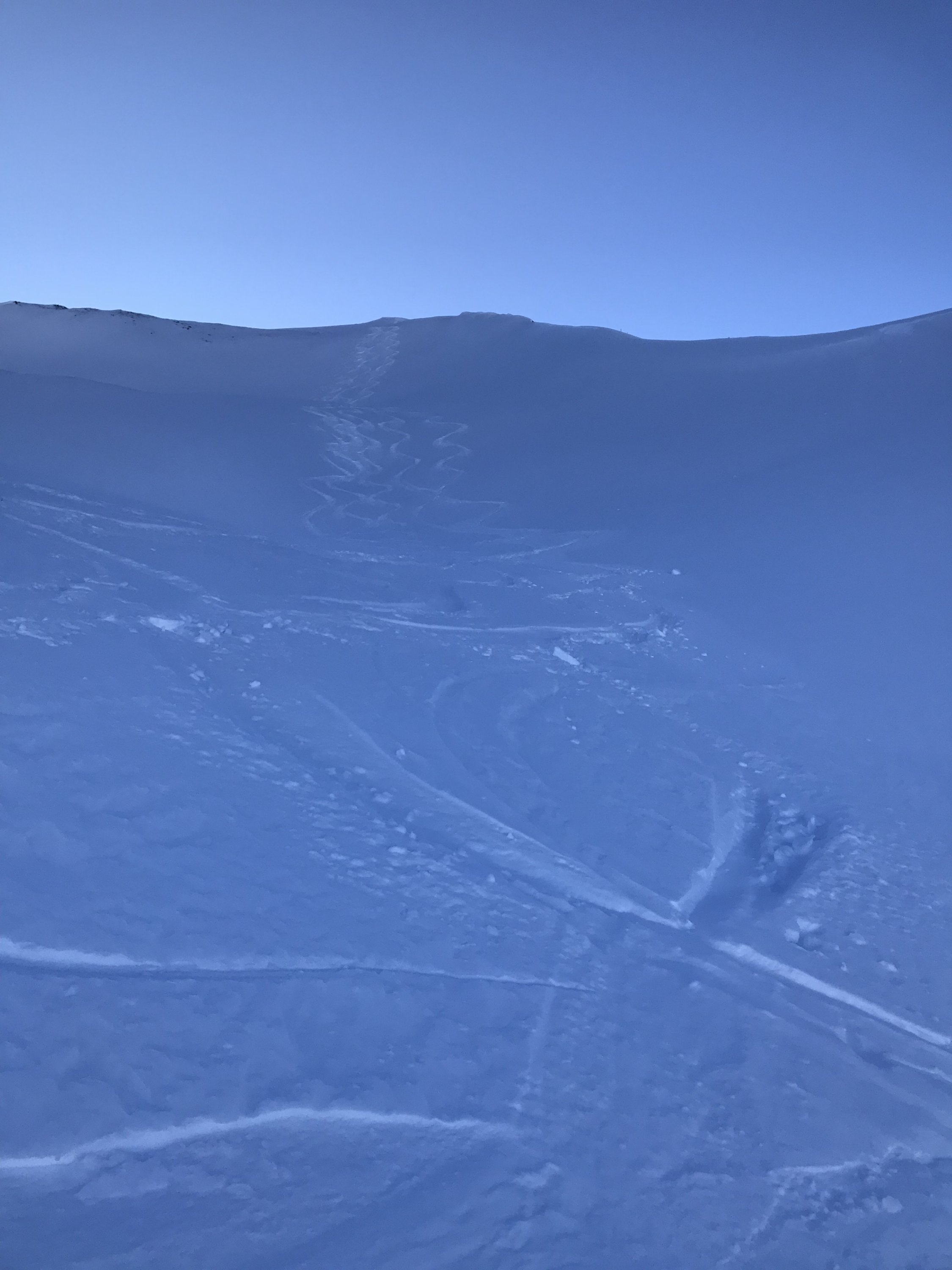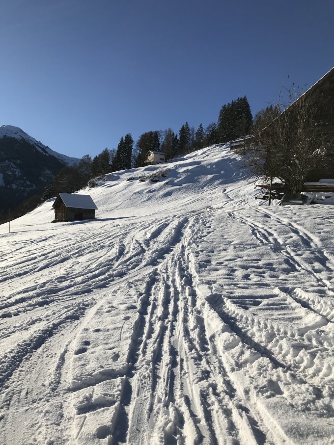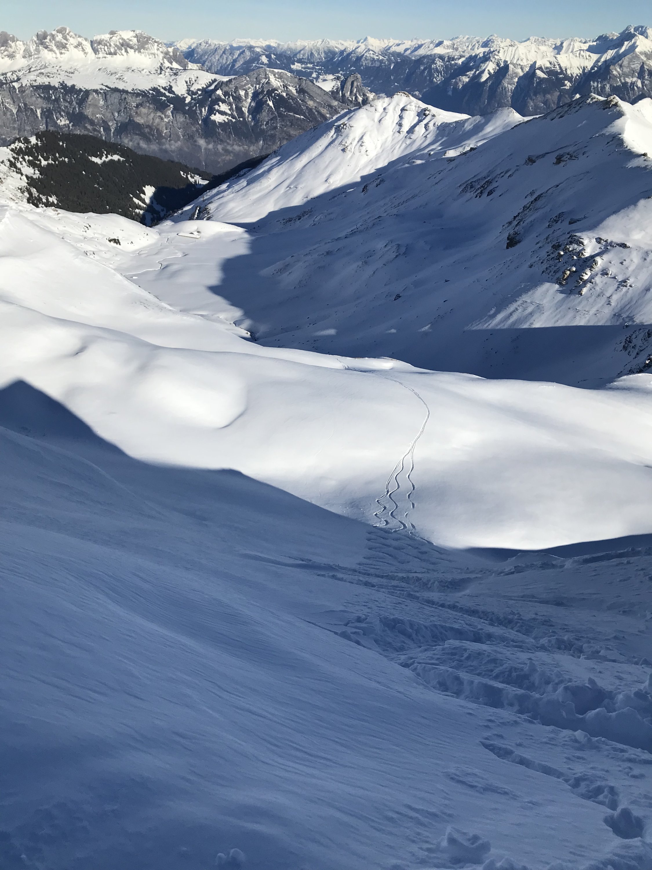 Gleich beim PP in Vermol losgelaufen, dann auf den Hüeneri und weiter zum Madchopf von dort hinuter nach Mad und dann Aufstieg zum Walachamm kurze Abfahrt durch Powderhang Chli Gadims und Aufstieg zum Guli ( für Gipfelbuch ein Bleistift oder Kulli mitnehmen fehlt leider in der Büchse). Abfahrt nach Gadims und Wiederaufstieg nach Langrain. Nun Abfahrt via Chläui Vorsäss nach Vermol.