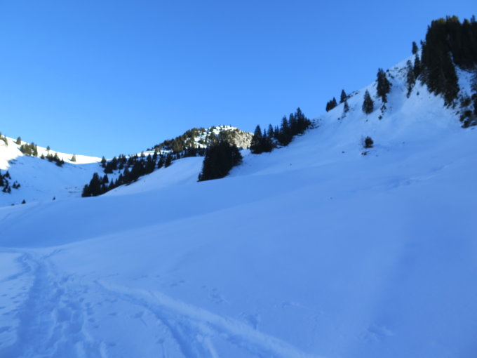 Je nach Richtung des Hanges Pulver bis schwerer Pulverschnee und leichter Bruchharst.