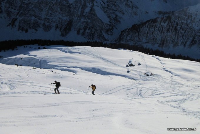 Abfahrt in schönem Pulverschnee. In den Südhängen unter dem Rotstock war der Pulver schon recht feucht. Waldstrasse ist derzeit tolle Pulverpiste.