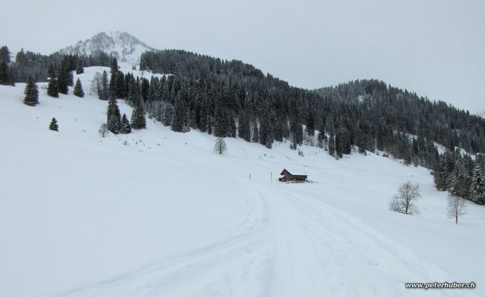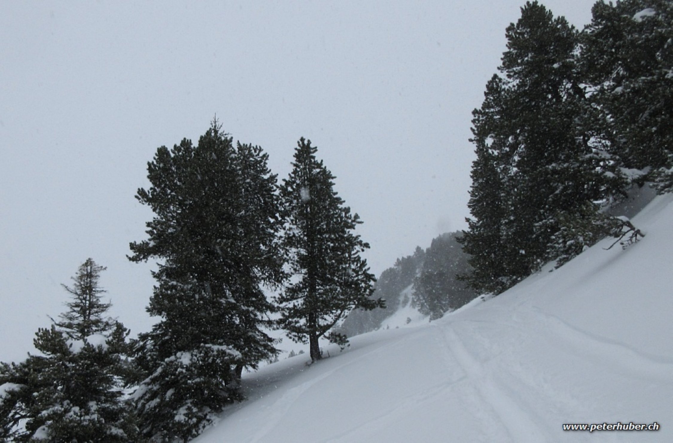 Es hat eine gute, angenehme Spur. Die Engstelle hat viel Schnee drin, pistenartig. Der Aufstieg zum Gipfel ist mit Ski möglich, doch kein wirkliches Vergnügen.