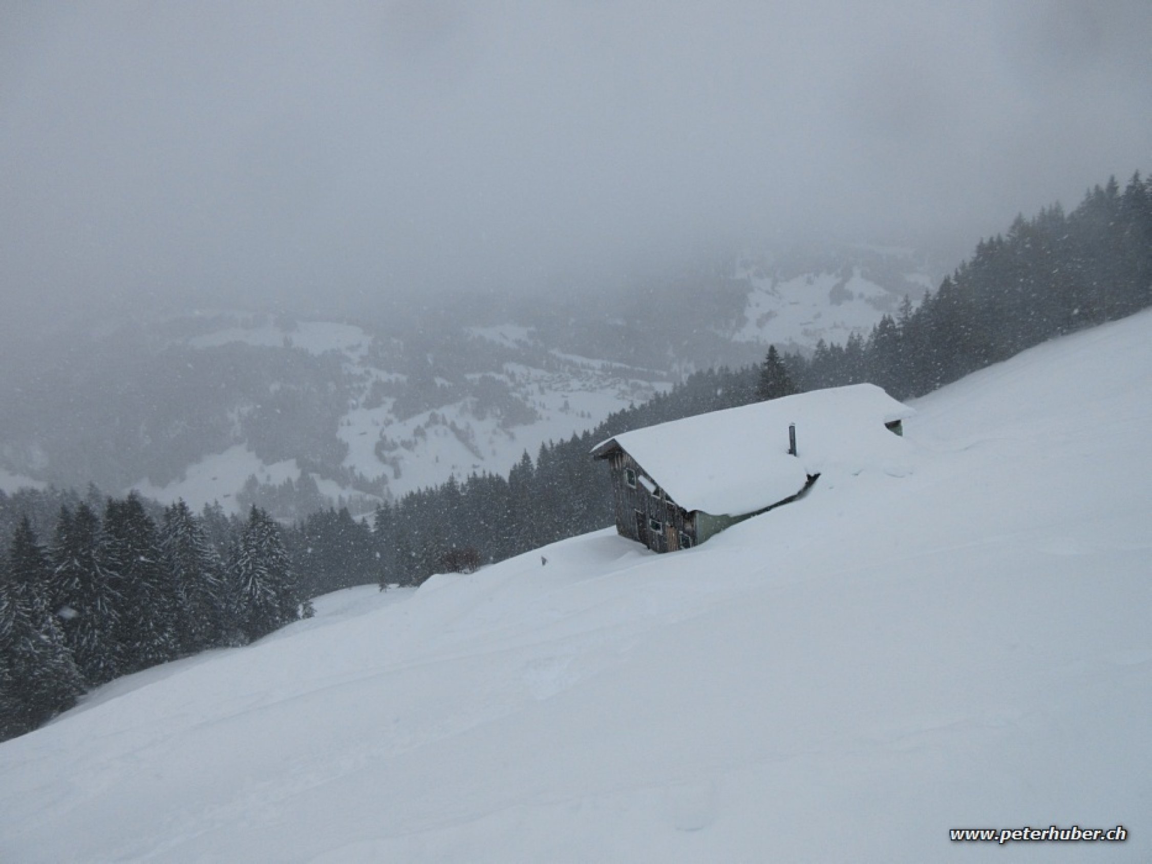 Abfahrt: Oben schöner Pulverschnee mit einigen alten Spuren darunter. Unterhalb der Engstelle sehr feuchter Neuschnee.
