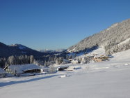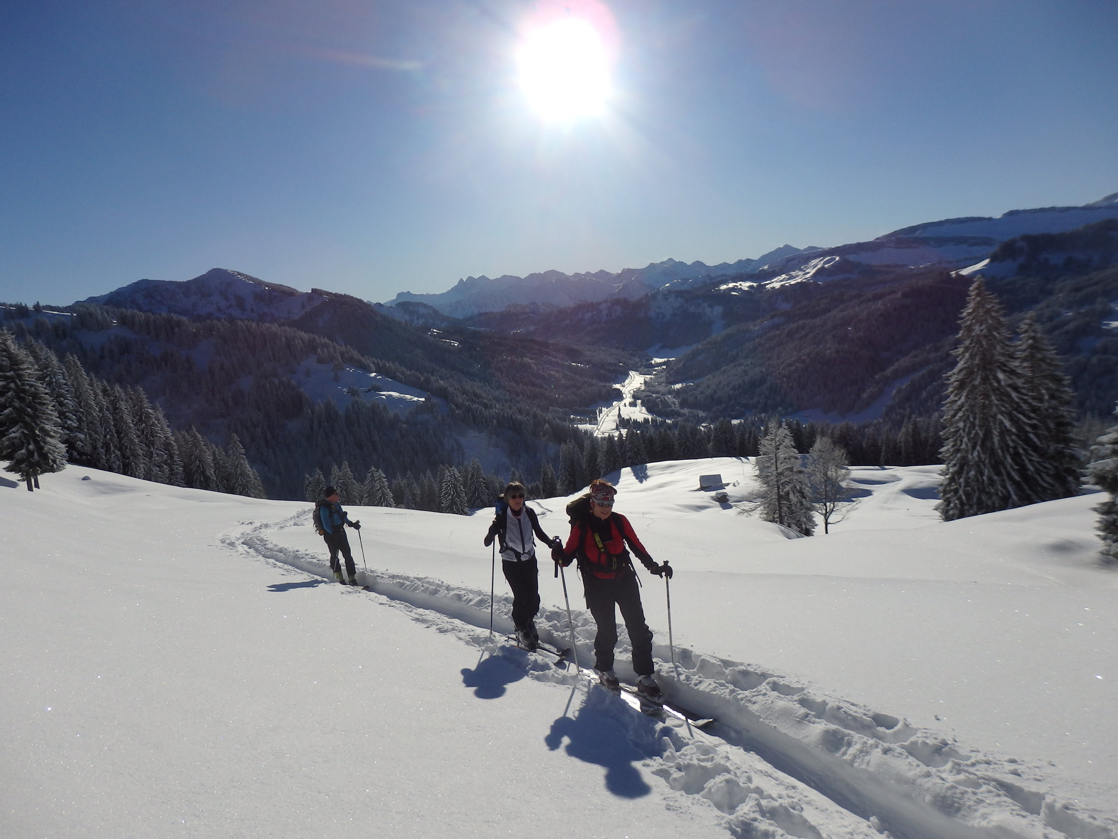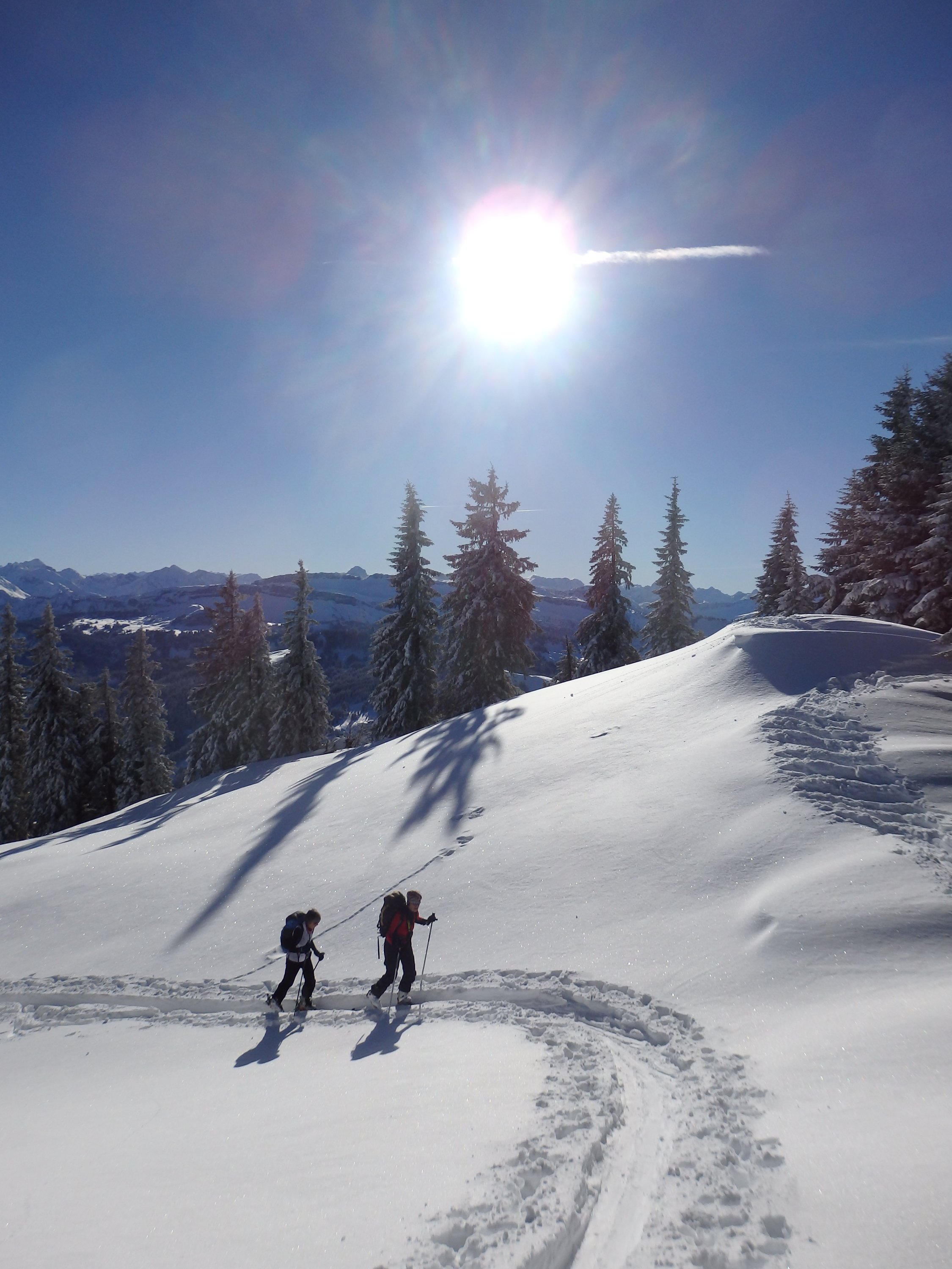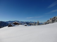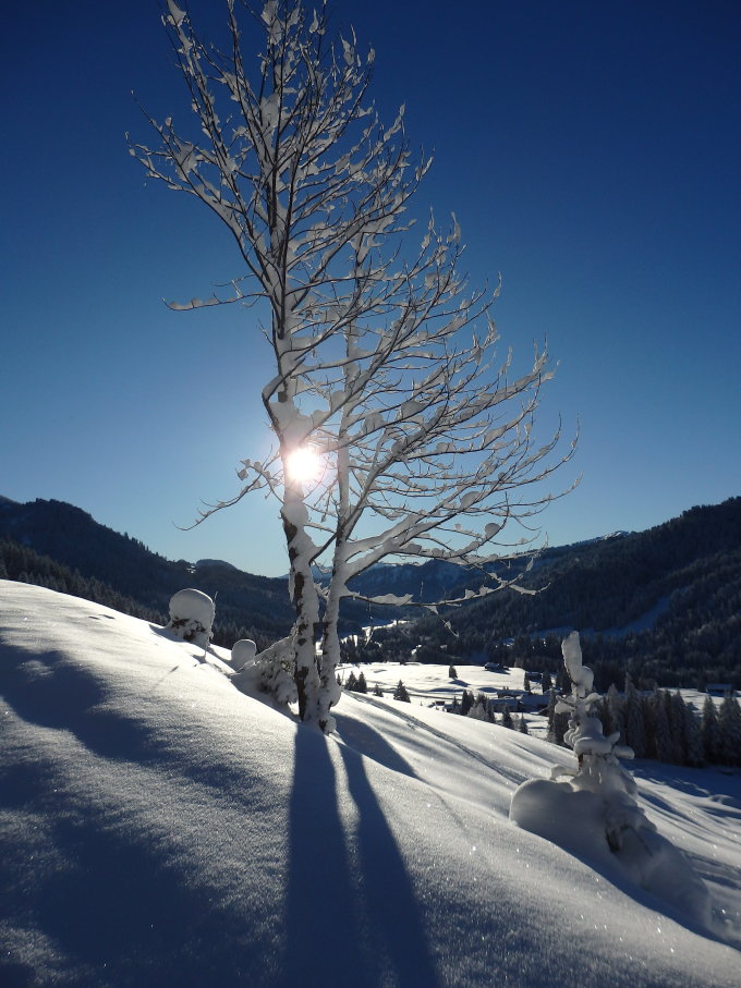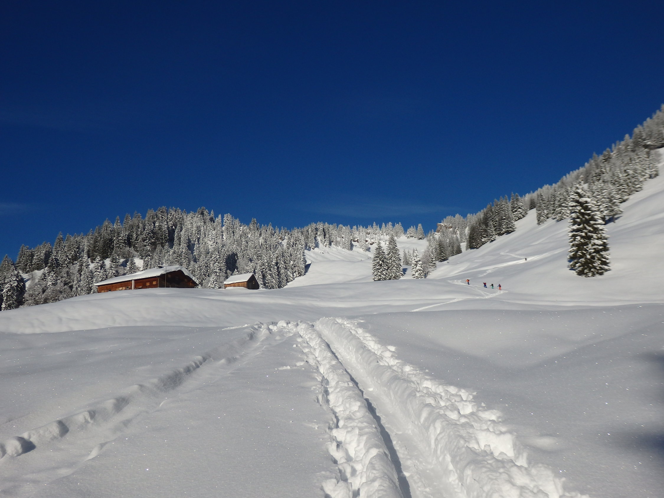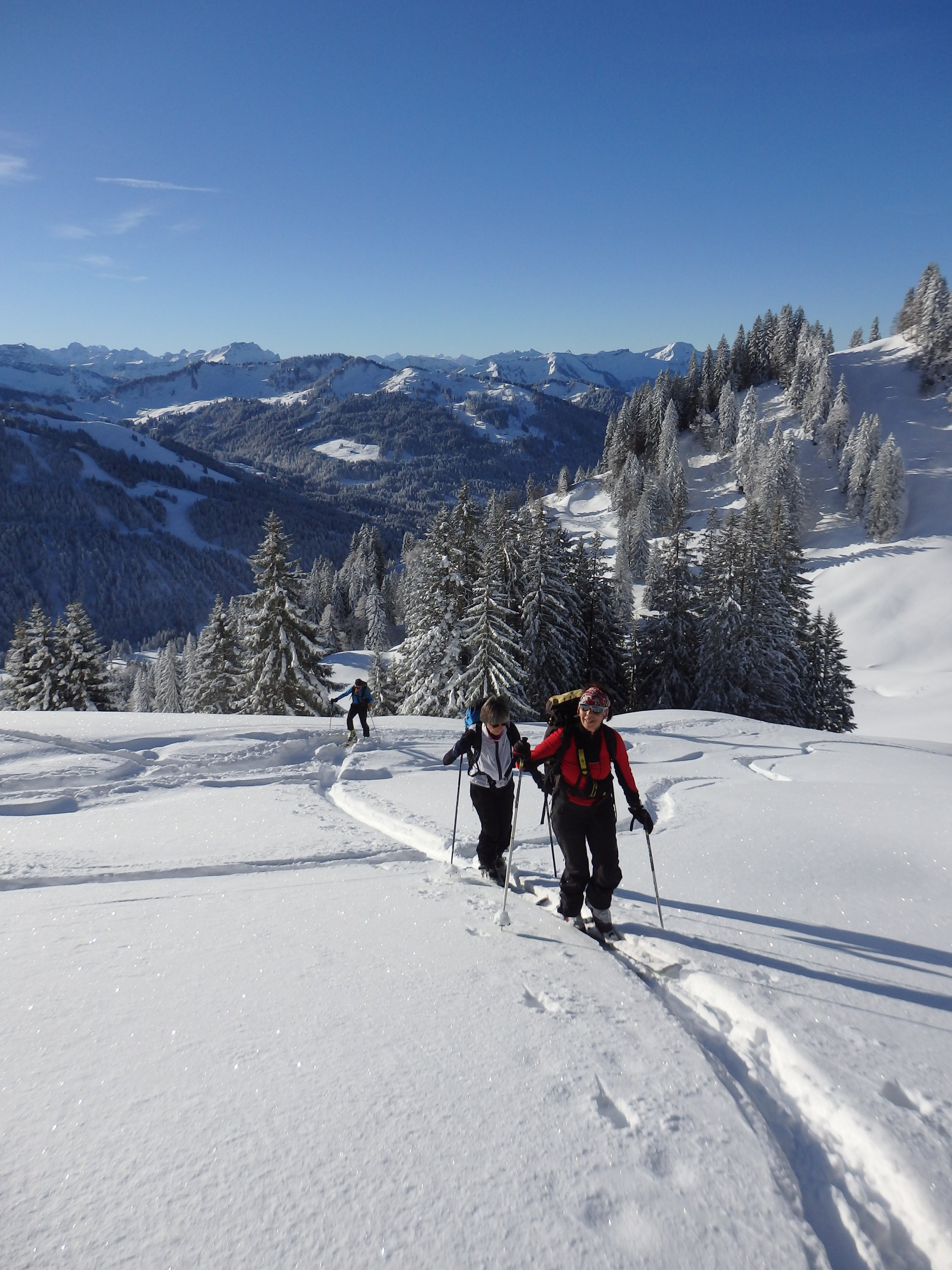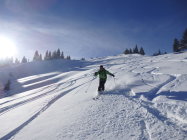 Wolkenloser Himmel und Windstille; 20-40 cm lockerer Pulverschnee, teilweise ohne feste Grundlage, schattseitig schön zu fahren; südseitig schon leicht angefeuchtet und gesetzt.