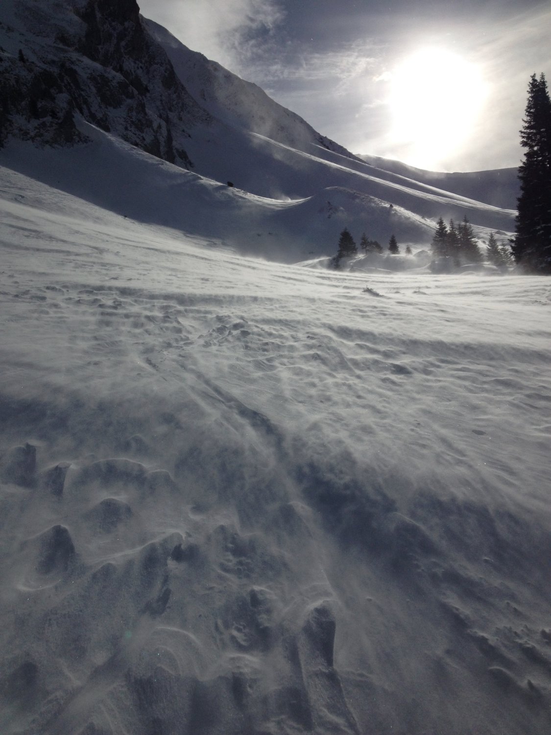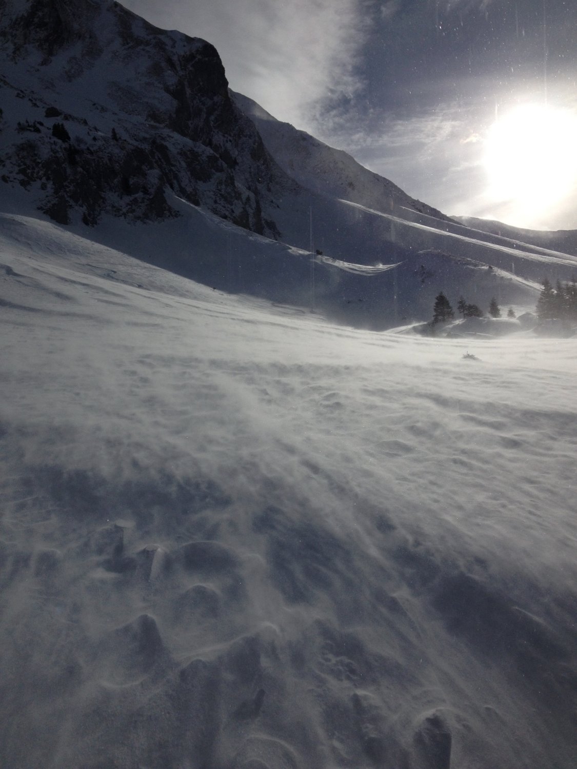 Beim Start ca. 9.30 schon sehr viel Wind in den Gipfelregionen, Gantrisch, Bürglen usw. Am Mittag dann starker Wind schon bis zur unteren Gantrischhütte. Die schönen morgendlichen Spuren an der Bire waren nicht mehr sichtbar...