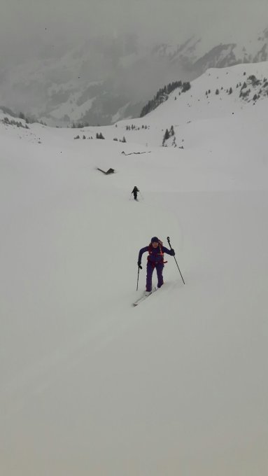 Umgekehrt irgendwo auf dem Sattel: Viel Wind und schlechte Sicht auf dem Grat. Der Schnee war von unten bis oben super. Bei der Abfahrt war dann ab der Abendmatte auch die Sicht wieder gut. Hatte neben uns sonst nur noch 1 Auto bei der Säge.