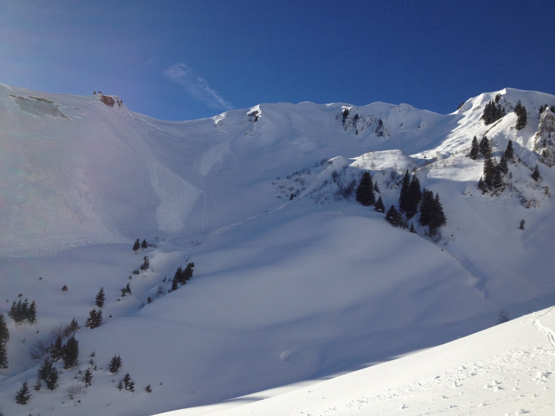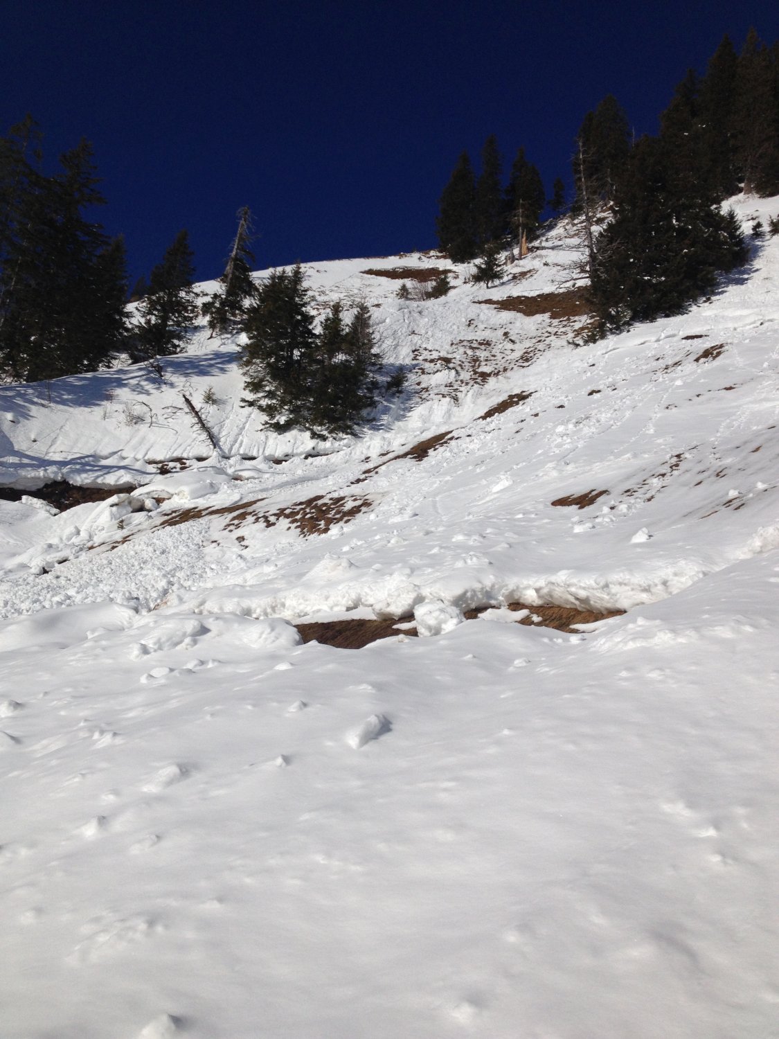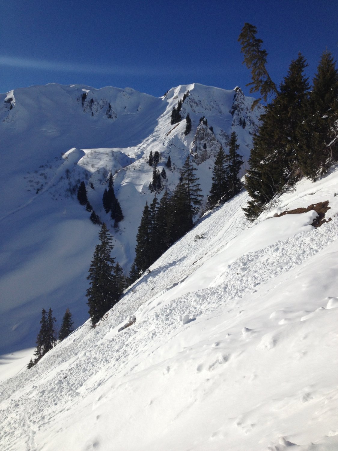 Viele mächtige Fischmäuler und darunter Gleitschneerutsche vor allem sonnseitig. Nach der Mittagszeit gingen auch einige neue Rutsche nieder.