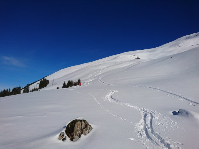 Ganz gute Bedingungen im Chirel und der W-Flanke. Danke an den Spurer vom Vortag. Die vielen Gleitschnee-Anrisse und Lawinenkegel mahnen zur Vorsicht. Die letzten Meter zum Gipfel gingen wir zu Fuss, da keine Steinskis dabei. Die Abfahrt in der W-Flanke war super, noch kein Deckel.