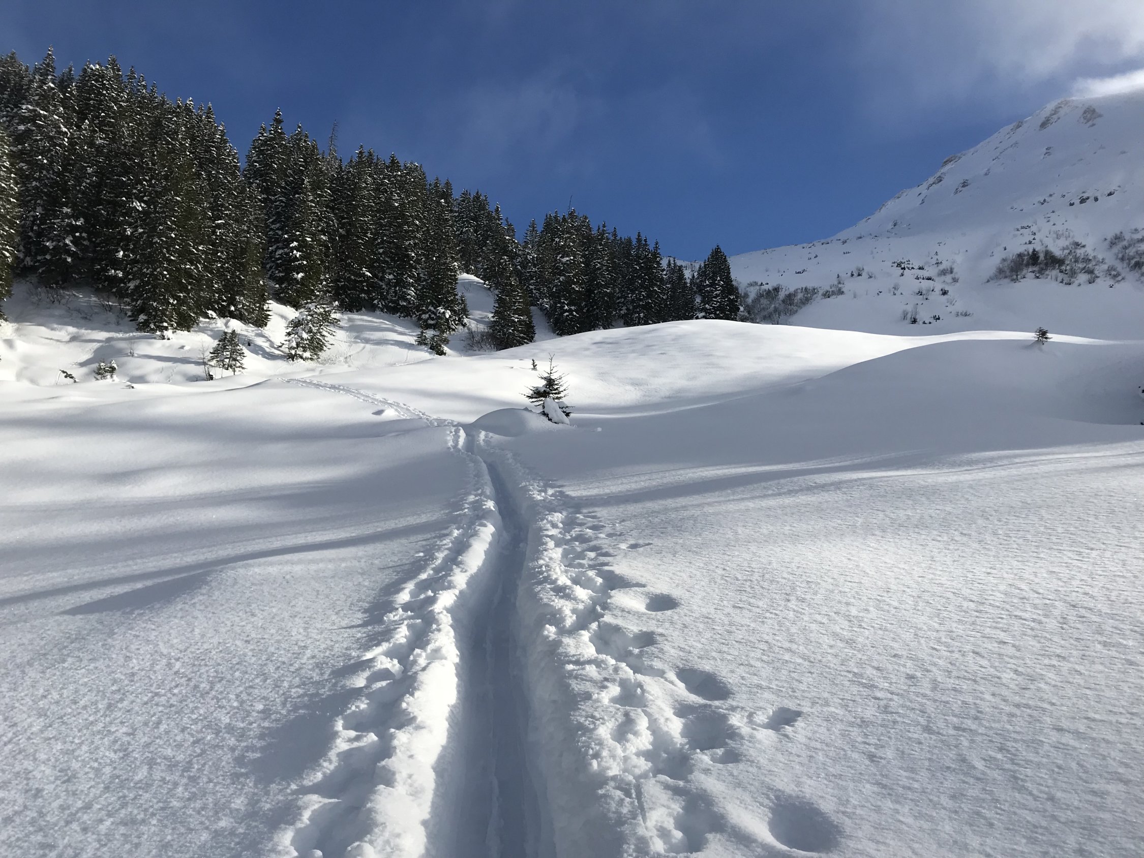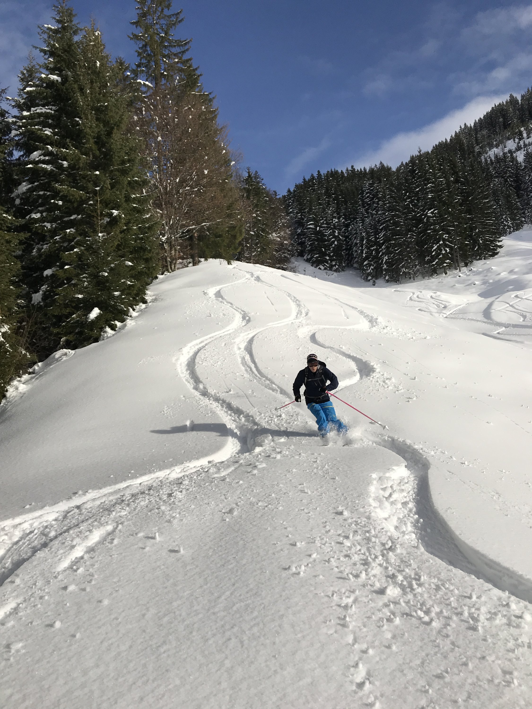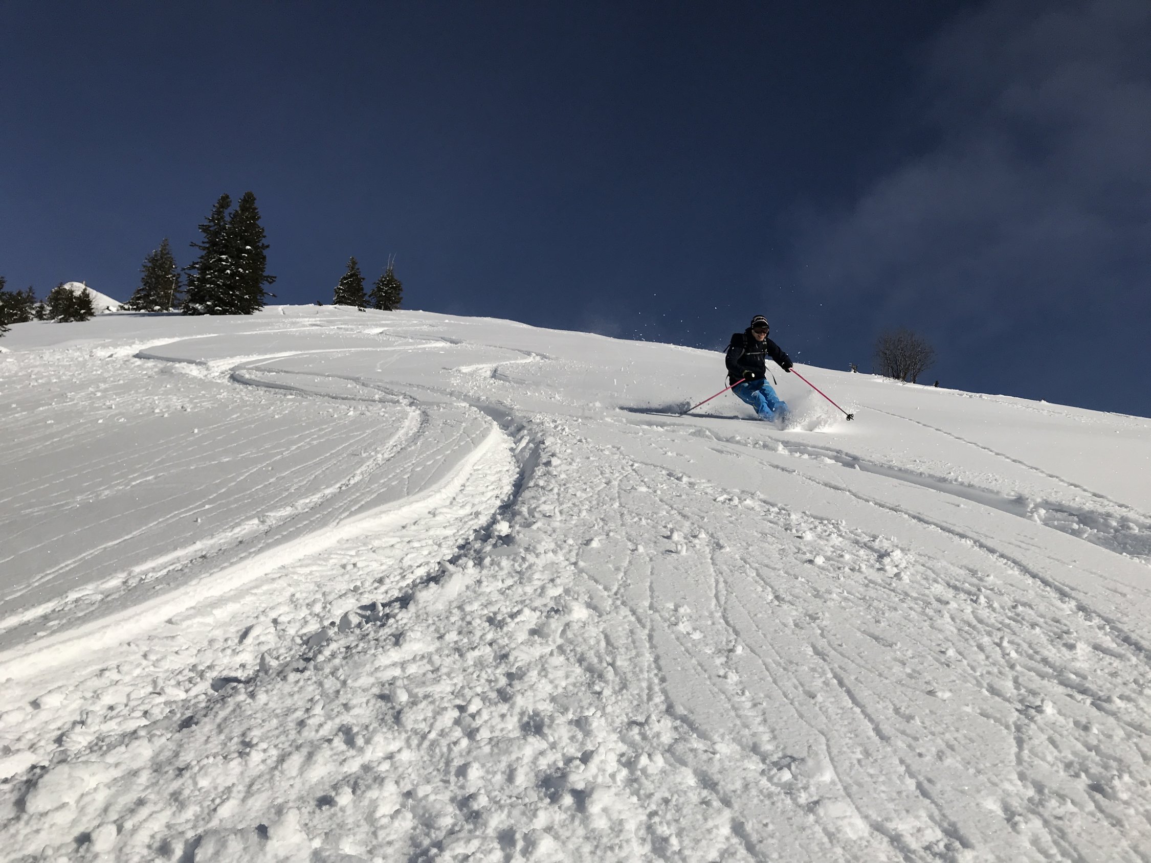 Insgesamt eine Traumschneelage und überdurchschnittlich viel. Gestern hat sich eine winzige Eislamelle auf der Oberfläche gebildet. Darunter gesetzter und dennoch sehr gut fahrbarer Pulver. Die Lamelle hat nicht weiter gestört. Heute nochmal herrliches Wetter - viel besser als gemeldet.