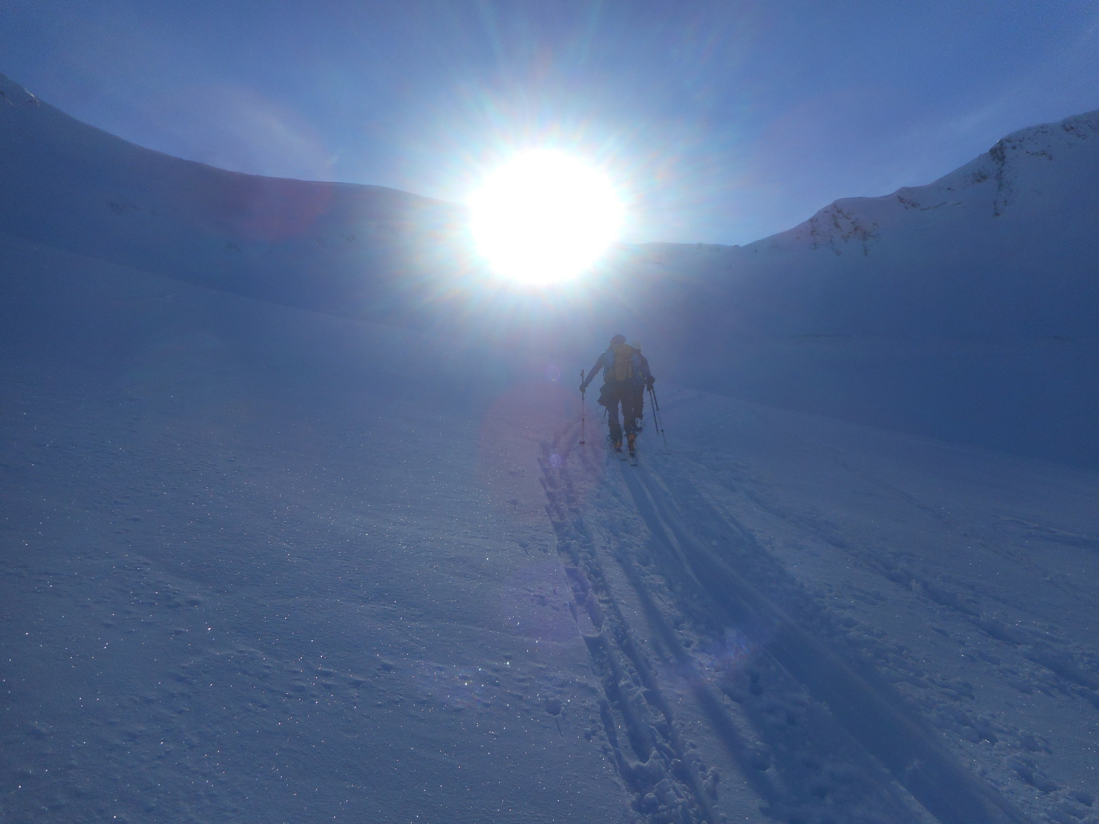 Aufstieg: Sehr gut angelegte Spur in den Morgetepass. Besten Dank den Spurer/in. Weiche Spur durch wunderbaren Pulverschnee. Siehe Fotos.