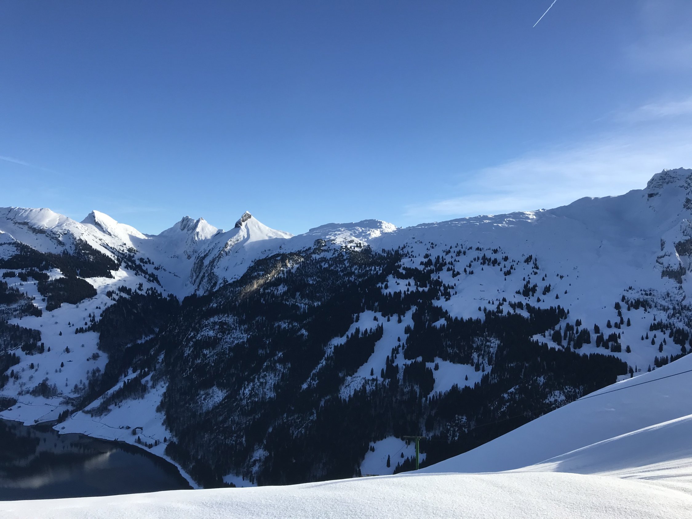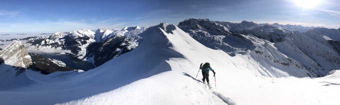 Warm und kaum Wind. Viel Gleitschneerutsche vorhanden von den letzten Tagen. Hart bis Fluebrig-Alp, danach weich bis pulvrig. Die ganze Kette ist nun frei zum Diethelm ab Skidepot. Abfahrt ab 1580hm Bruchharst der sich bis ganz nach unten zieht.