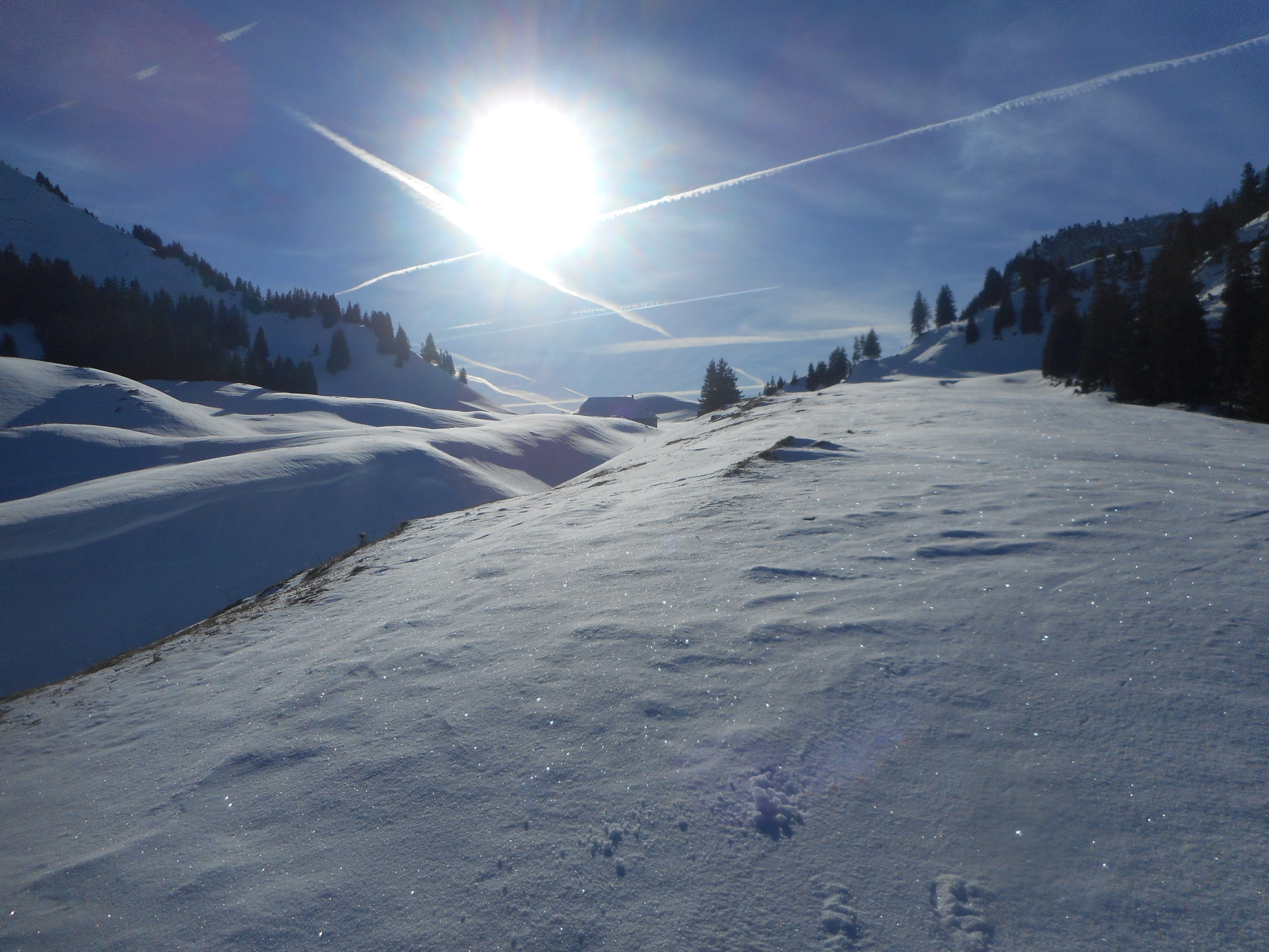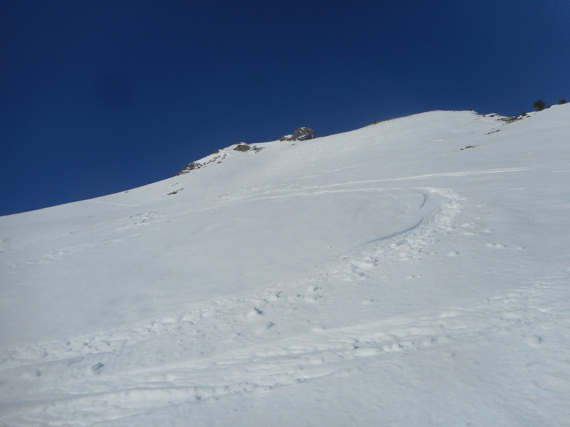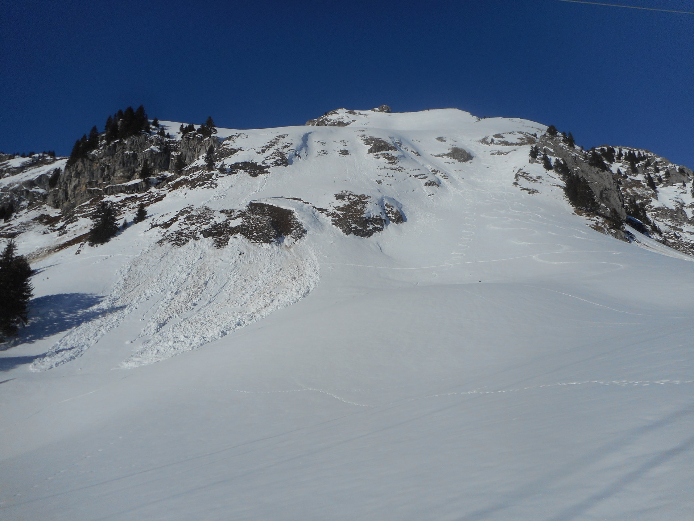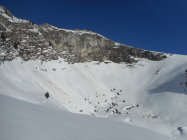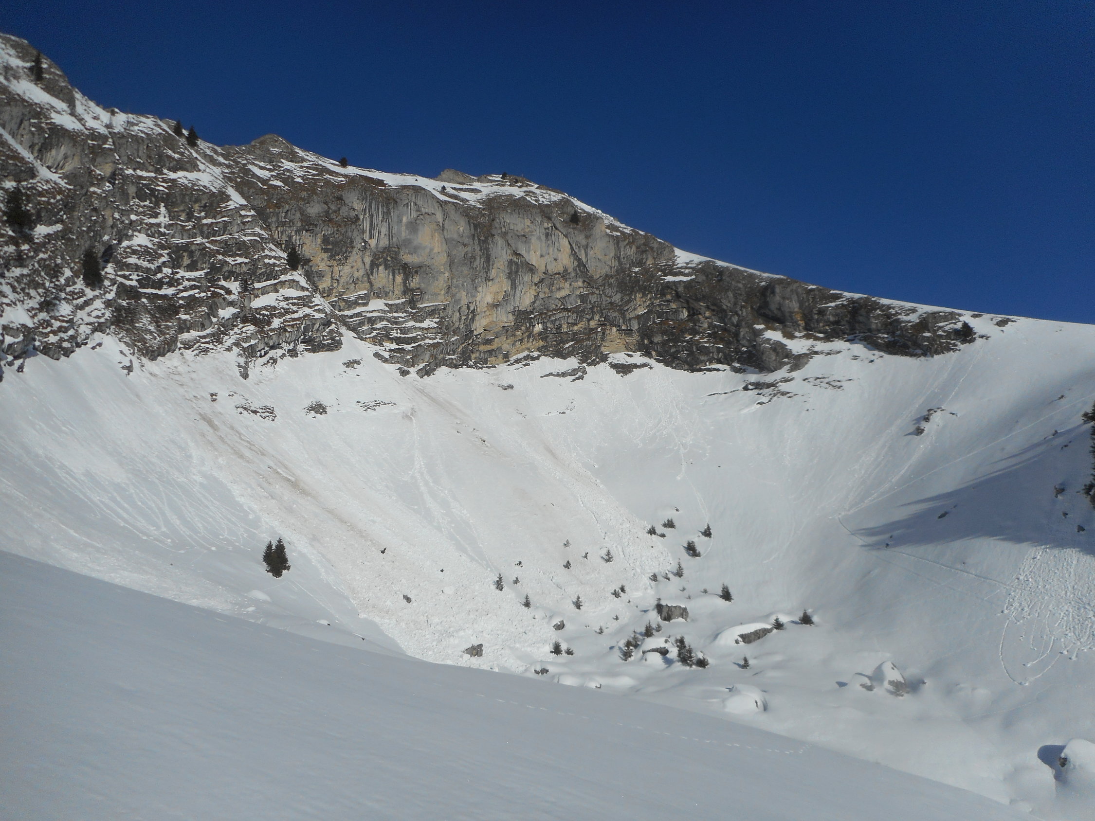 In den Süd- und Westhängen sehr viele spontane Grundlawinen. Heute war bereits die richtige Zeiteinteilung sehr wichtig. Siehe Fotos.