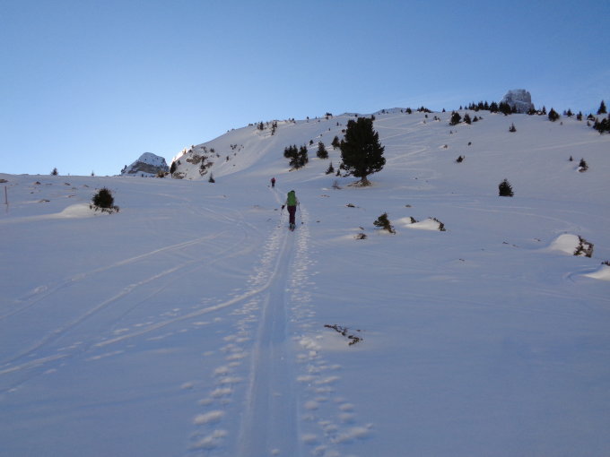 Ganze Route gut eingeschneit. Im Aufstieg in den Abkürzungen der Waldstrasse teils etwas glasig. Der vorhandene Deckel war nirgends tragend, es sah für die Abfahrt ziemlich schlecht aus, wir genossen den Aufstieg. In der Abfahrt war der Deckel dann bis fast 1800 gut bis recht gut fahrbar. Darunter fanden einzelne je nach Gewicht und Skibreite auch an den eher stark besonnten Stellen einen Platz für beinahe-sulz-Schwünge.