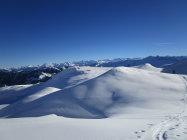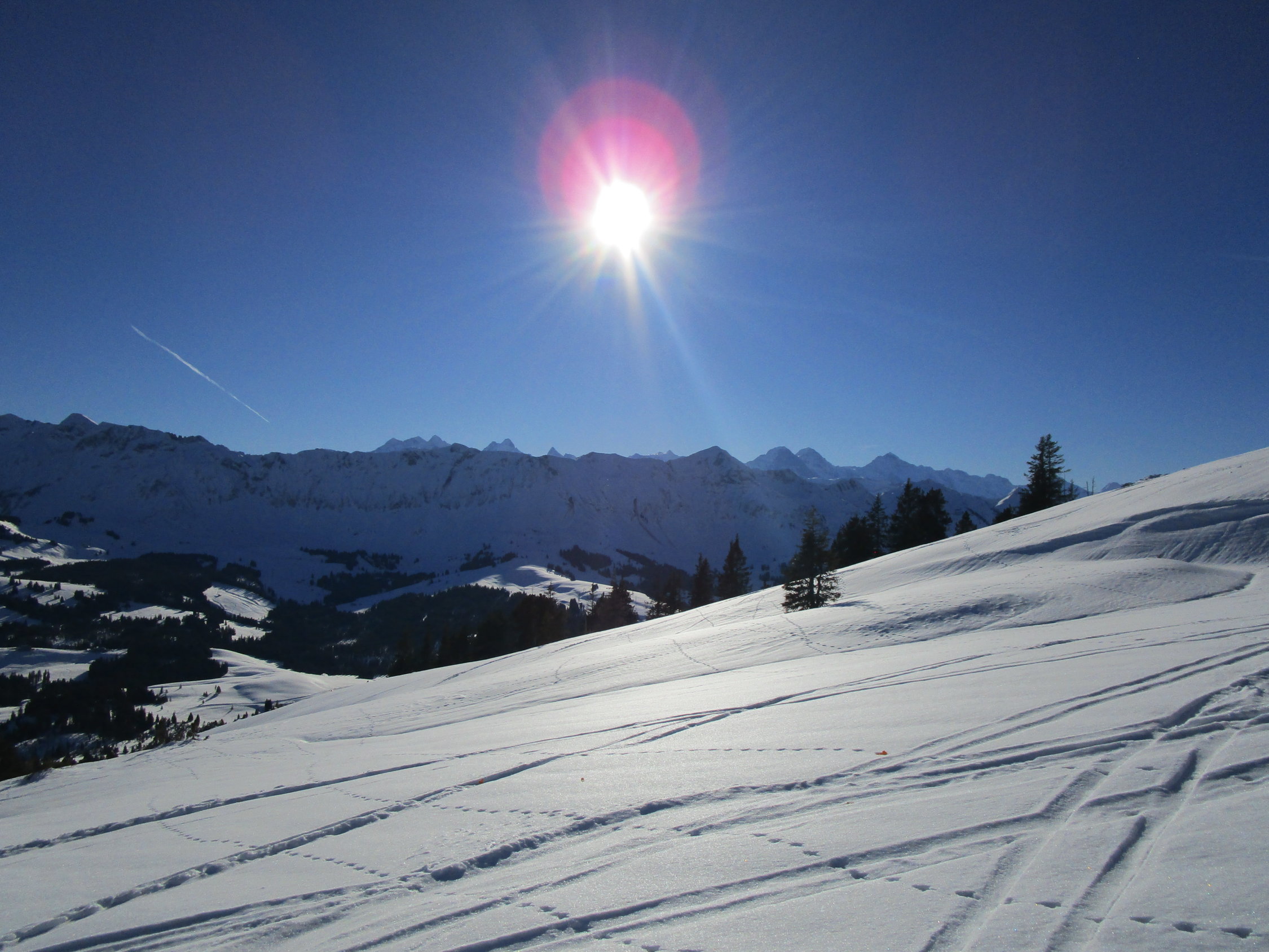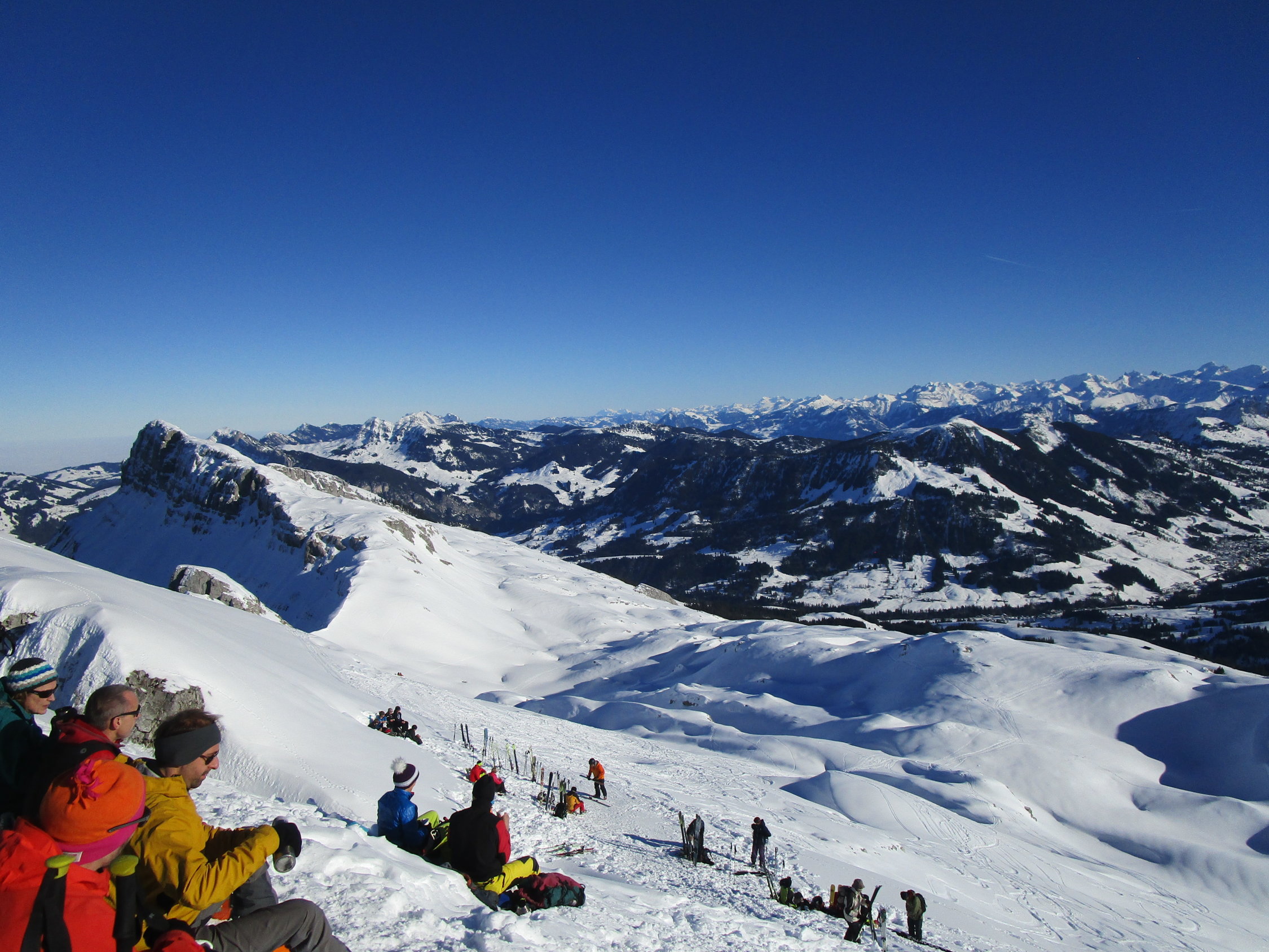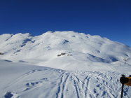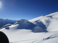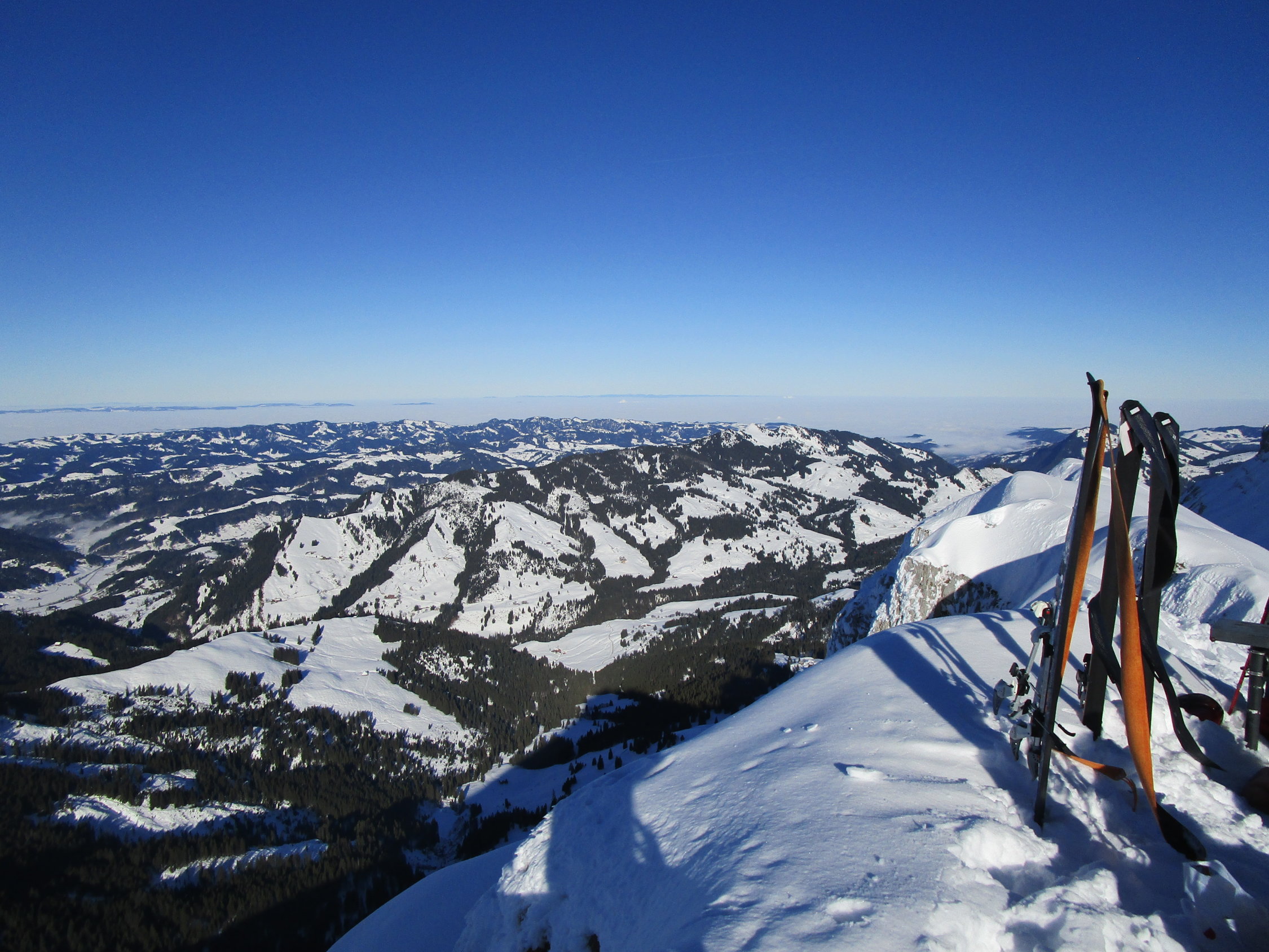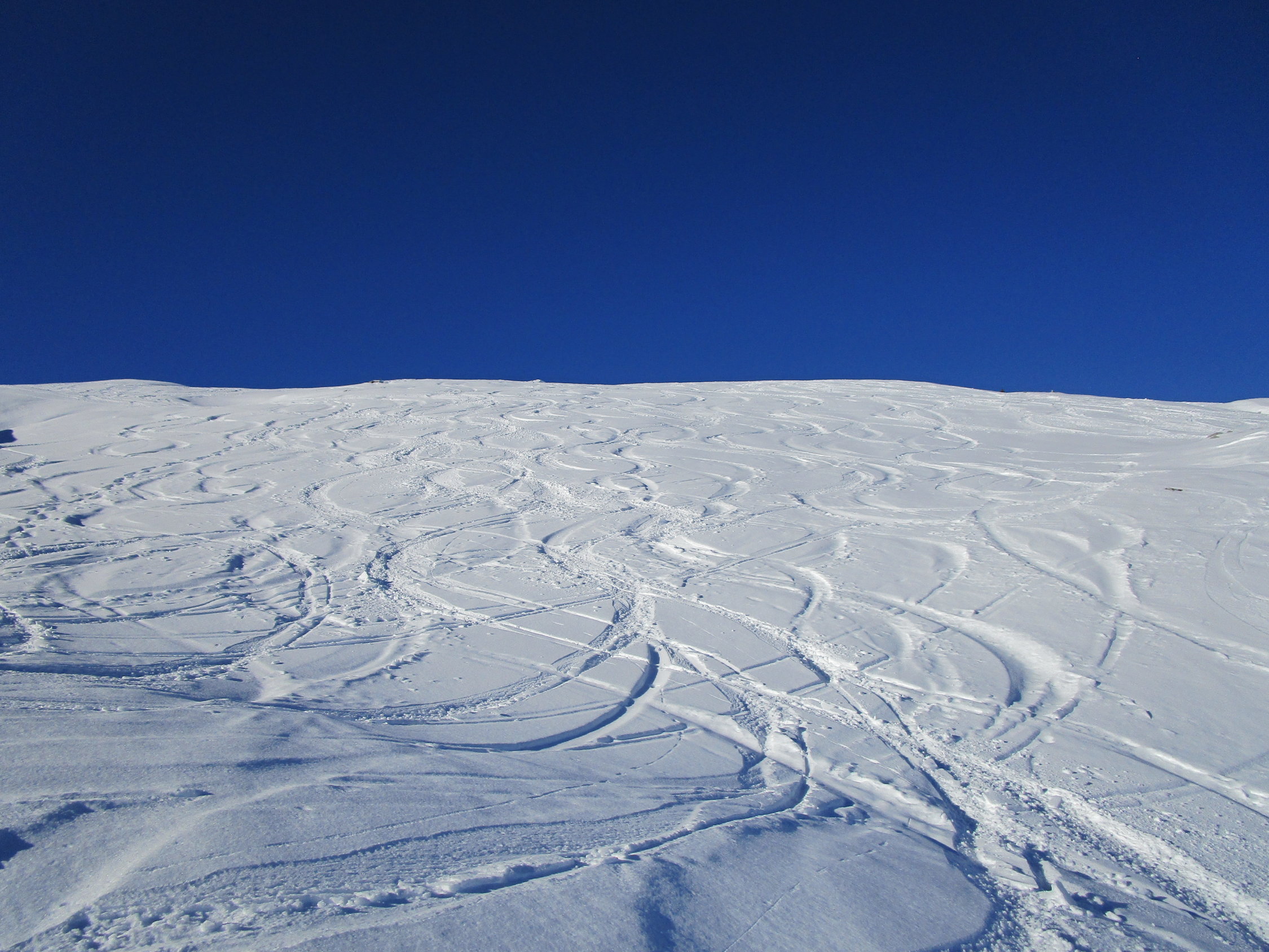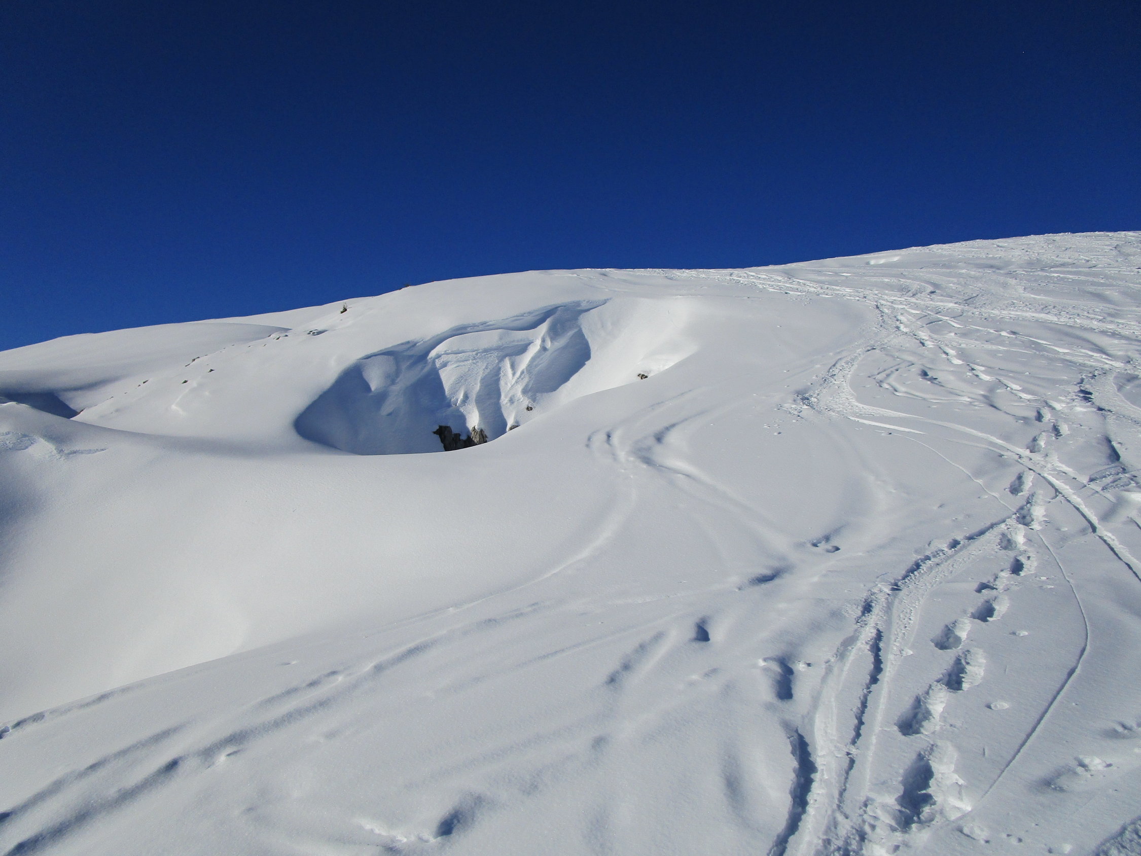 Schneequalität bis oberhalb Wald hart, etwas Bruchharst, dazwischen recht schöner Sulzschnee. Gipfelhang tragend, schön zu fahren.