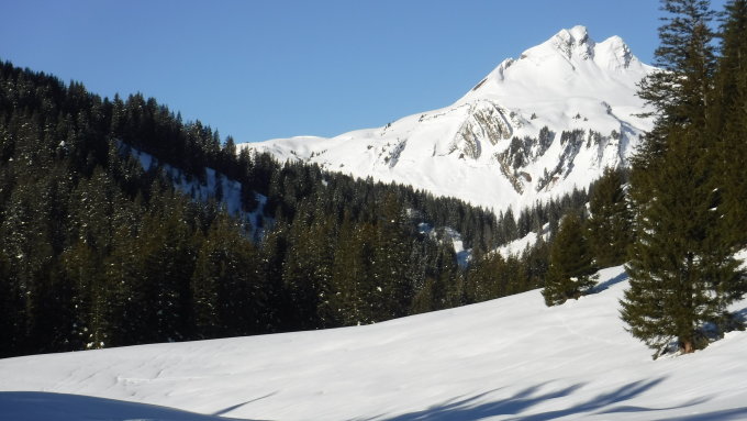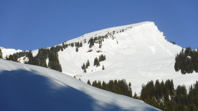 Der Gungern hat sich seiner Südseite zum großen Teil vom Schnee entledigt, so auch der Südhang über der Sackalpe.