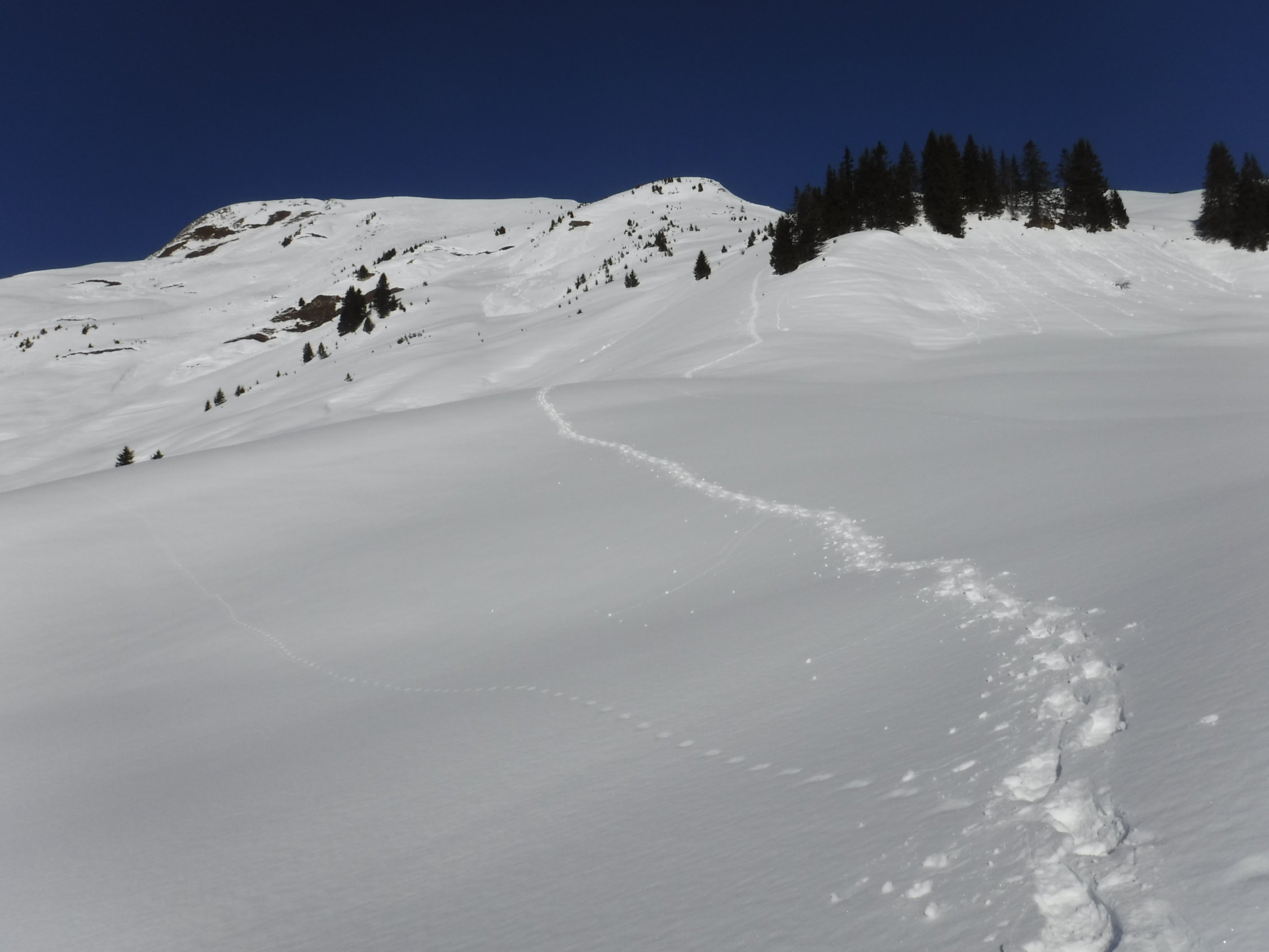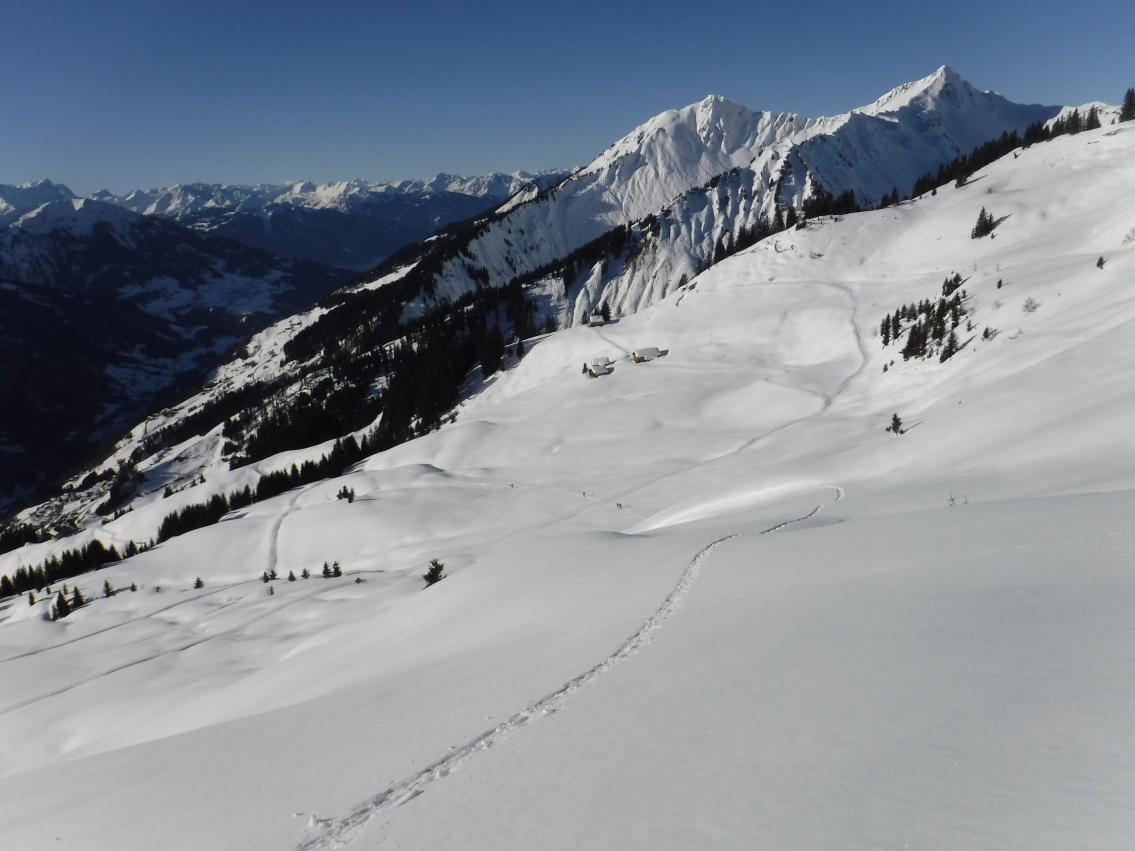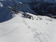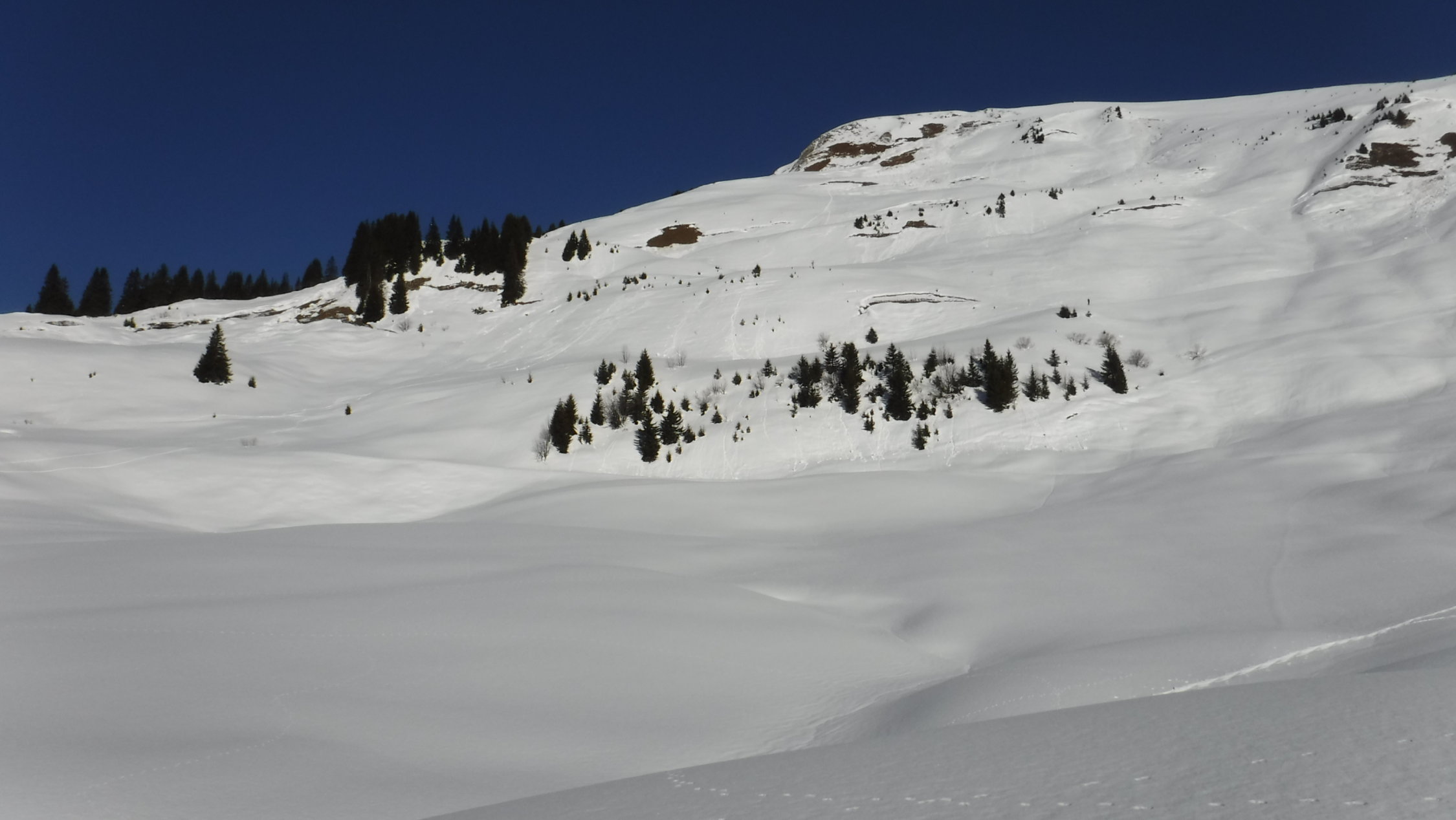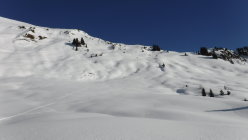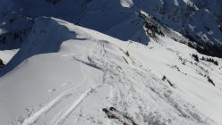 Wenigstens 2 Tage alte, 3 kleine Gleitschneeabgänge auf dem Güterweg und diverse an linker Seite des Südhangs im oberen Bereich unterhalb des Gipfels.