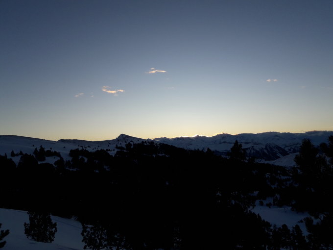 L'Autoroute auf die Gipfel war sehr hart gefroren, daneben teilweise tragender Deckel. Sonnenaufgang in der Verbindung von Rickhubel und Fürstein (abgeblasen an der typischen Stellen). Auf dem Weg Richtung Fürstein zunehmender Wind, ab Gipfel kräftiger Wind. Abstieg weiter als Rundtour über Seewenseeli 1689m zurück zum Langis.