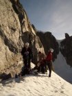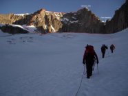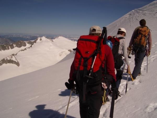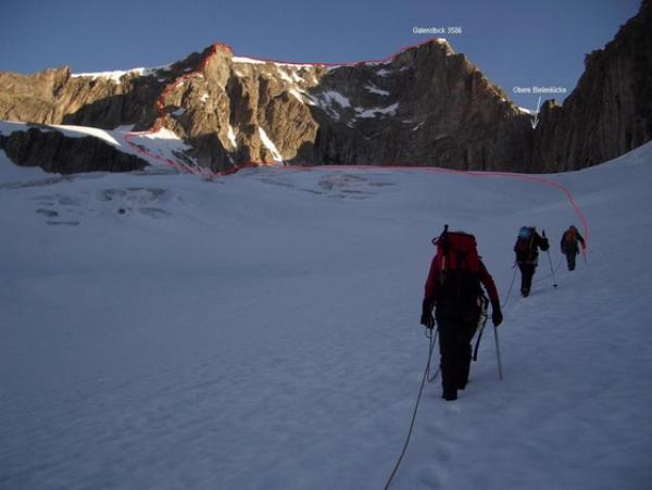 Schon am Morgen ziemlich warm (Sidelengletscher +5)Bei der Querung zum Einstieg schon wacker Schnee gestampft. Im Laufe des Tages wurde es zünftig heiss und der Schnee dementsprechend matschig. Beim Abstieg, in steilen Hängen schon beim geringsten Kontakt mit unberührten Schneeflächen, kleine Oberflächenrutsche ausgelöst.