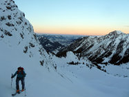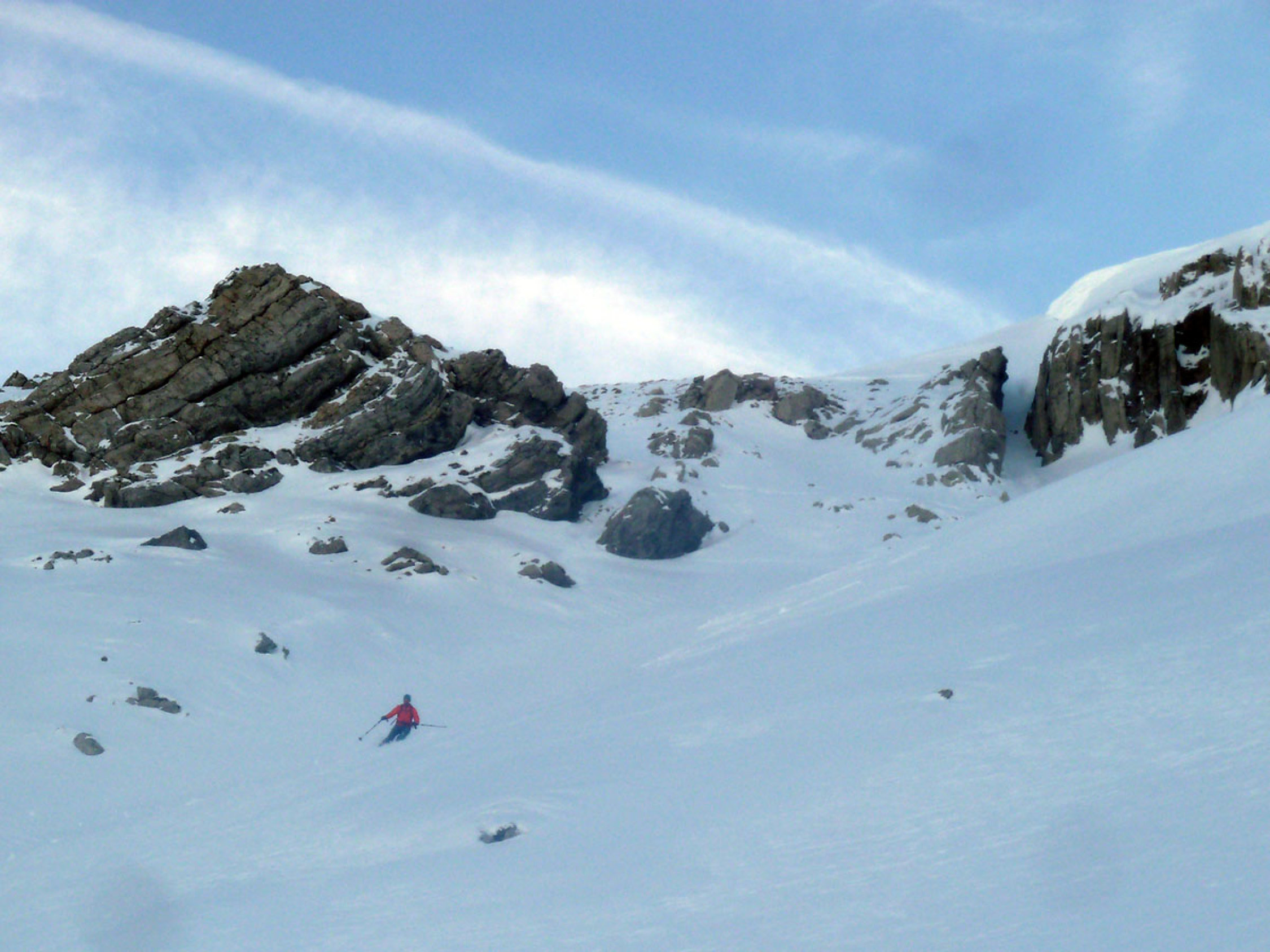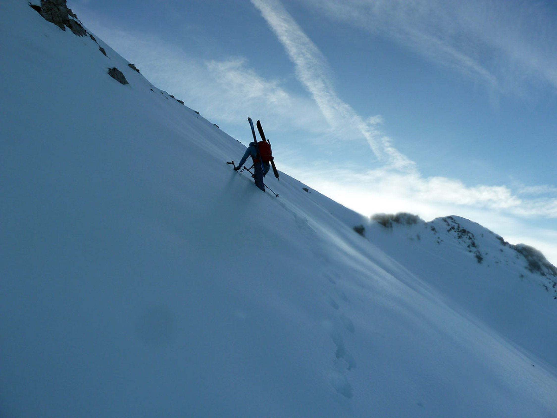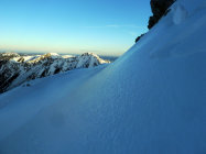 Bis kurz vor den Willersbach mit Ski. Dann durch den steilen Wald im Bereich der Serpentinen die Ski am Rücken. Unverspurtes Gelände zwischen Willersalpe und Rauhhorn. Selbst in den steilen großen Nordhängen auf knapp 2000m Höhe riesige Gleitschneemäuler. In den Westhängen rechts des Verbindungsgrates zwischen Gaishorn und Rauhhorn üble spiegelglatte 3cm dicke Eiskruste/Deckel! Zum Teil nicht ganz ungefährlich. Wenn die Eiskruste zu Fuß nicht brechen würde, wäre das ne richtige Blankeiskletterei. Am nicht zu unterschätzenden Gipfelgrat zum Rauhhorn gute Verhältnisse. Gewaltige Wechten nach Osten zum Vilsalpsee! Eine ist uns gebrochen! Zum Glück aus sicherer Entfernung. Abfahrt aufgrund der aktuellen Schneesituation wie zu erwarten kein Highlight, sondern eher ein Krampf.