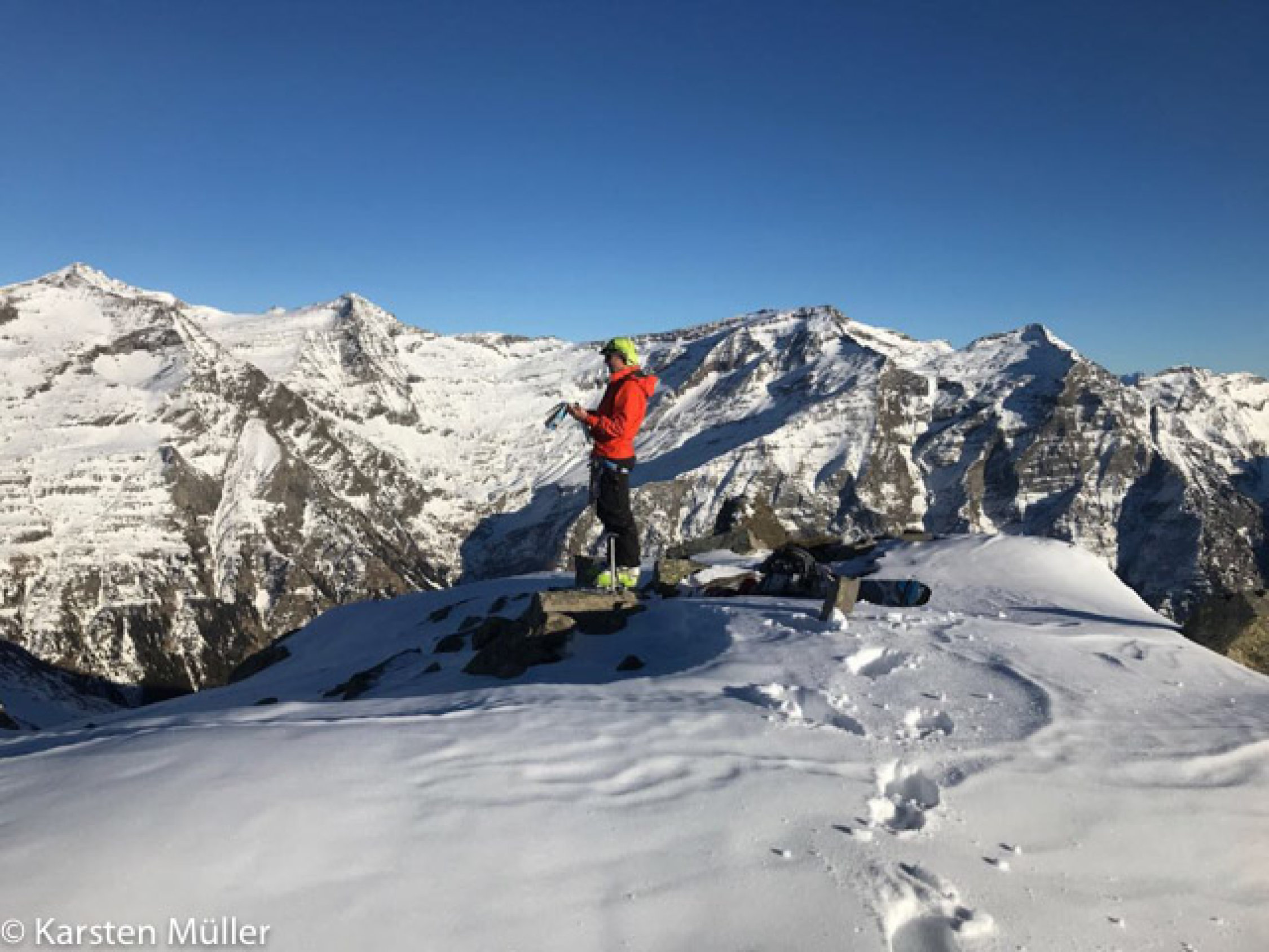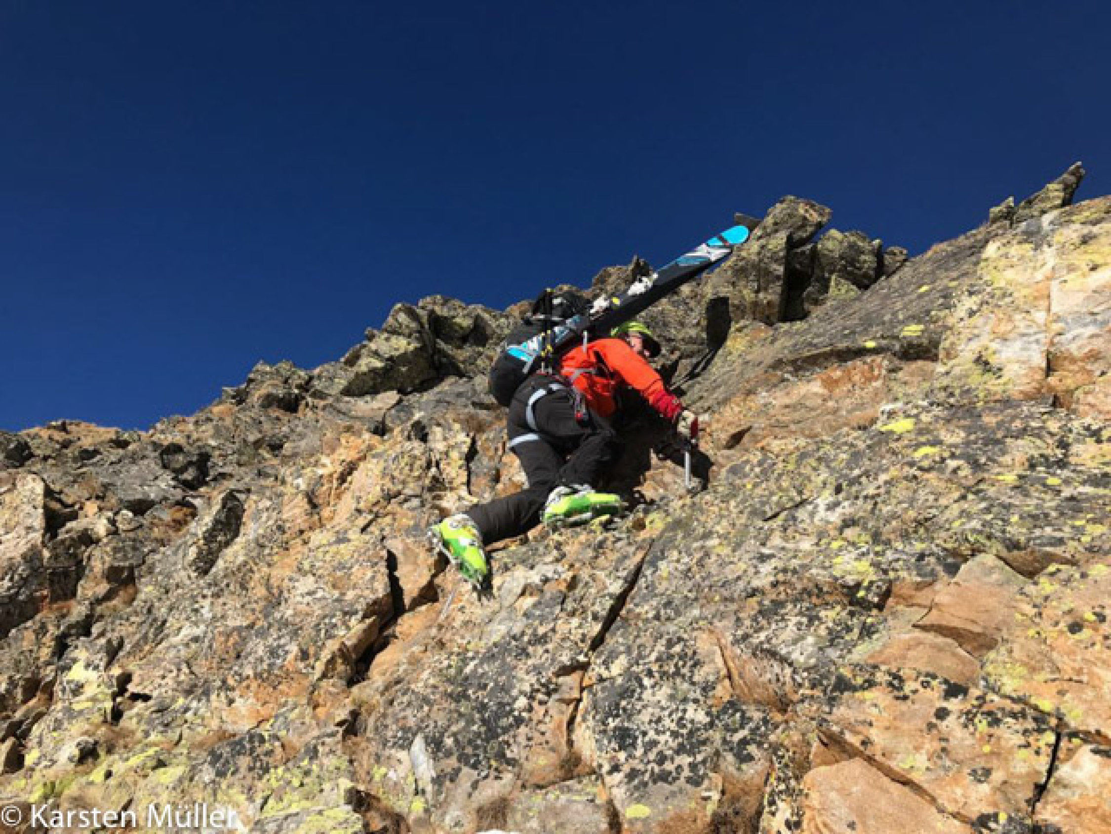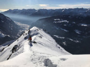 Von hier aus auf einen licht bewaldeten Bergrücken nördlich, an einem sehr grossen auffälligen "Steinmann" vorbei zum Grat, der vom Pt. 2387 nach SO zieht. Den Punkt kann man dann in einer flachen Mulde östlich umgehen, un mit den Ski noch ein Stück am Südgrat des Gipfels hinauf. Bei ca. 2440 müssen dann die Ski getragen werden, bzw. Ski-Depot. Felsiger Grat mit mehreren kleinen Aufschwüngen, so dass die Hände mehrfach aus der Tasche genommen werden müssen (I).