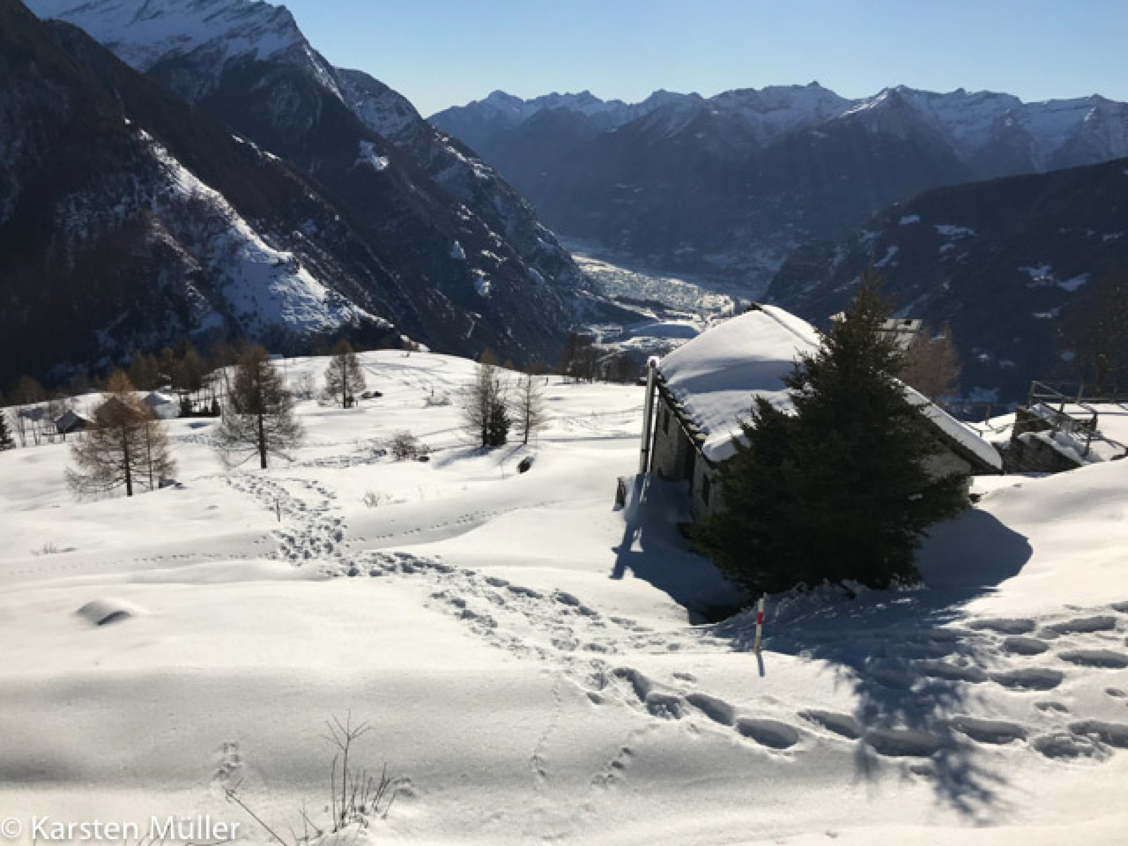 Abfahrt zwischen zahlreichen Steinen und Felsbändern hinunter, aber ohne Steinkontakt möglich. Unterhalb der Alpe Sceru durch lichten Wald zum Ziehweg, auf diesem das lange Malvaglia-Tal hinaus, Strasse gut schneebedeckt, nur von Snow-Tracks be- und teilweise zerfahren. Wir sind dann über die Ponte di Canè (825m) zuletzt auf das rechte Talufer gewechselt, da hat der Schnee dann kanpp bis Pontei gereicht (750m). Von hier zu Fuss auf markiertem Weg nach Rongie, das ist der nördliche Teil der Ortschaft Malvaglia, und zum Parkplatz an der Seilbahn.