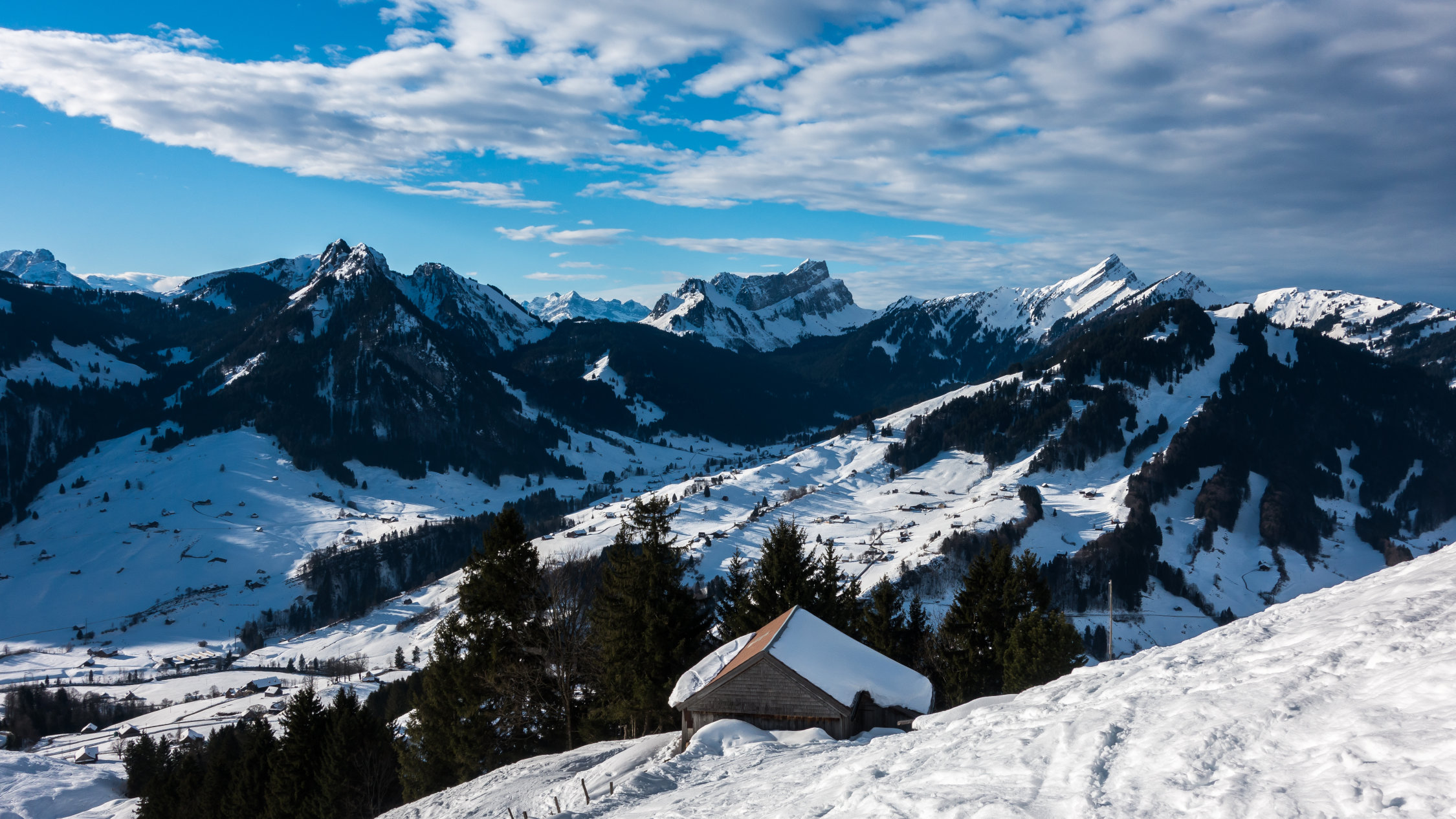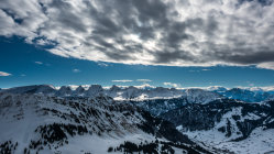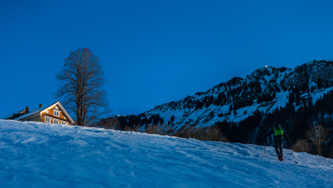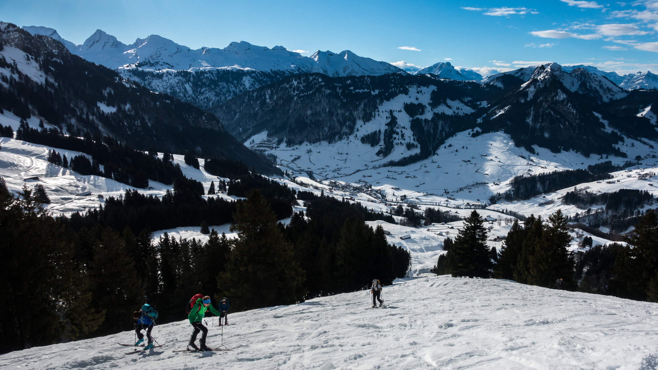 Da die Schneeverhältnisse für Skitouren in der Region nicht mehr optimal sind, haben wir uns heute für die Schneeschuhe entschieden. Mit den Ski wäre die Verhältnis-Bewertung wohl eher "machbar" gewesen statt "gut". Am Vormittag herrschte herrlicher Sonnenschein, ab Mittag zogen aus Westen dunkle Wolken auf und hüllten die Gipfel in Nebel. Im oberen Teil stark verspurter, gefrorener Firn, im unteren Teil Nassschnee/Sulzschnee. Die ganze Route gleicht einer schlecht präparierten Skipiste.