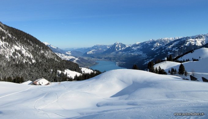 Am Start hat es zirka 10 cm Neuschnee, ob dem Wald zirka 20 cm - gelegentlich verweht. Auf der Strasse bis Brosmatt liegt schön Schnee. Darüber herrlicher Pulver. Wir liessen den Gipfel aus da es auf dem Gipfelgrat heftig zog und er etwas ausgeblasen aussah und querten dafür zur Chringe nebenan.
